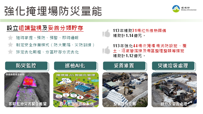 陳委員瑩:好,謝謝。我今天拜讀了環境部的報告,想要針對第十四項計畫「加強裸露垃圾處理」來跟兩位請教。首先,全國裸露垃圾掩埋場的暫置量,已經從112年的84萬公噸下降到113年的75萬公噸,其中彰化縣自113年7月起就非常積極地推動垃圾強制分類破袋檢查,截至該年底全縣垃圾量已經成功減少了2.3萬公噸,減幅將近兩成,減量的績效是非常卓越的,環境部也因此呼籲各縣市應該要跟進、要響應。本席的第一個問題,看起來垃圾強制分類破袋的檢查是一項非常有價值的作法,環管署為什麼沒有積極補助,或者規劃相關的計畫讓各縣市好好學習?彰化縣辦理這麼好的計畫,都不用花錢就可以減少兩成的掩埋垃圾,難道你們只要呼籲就好了?