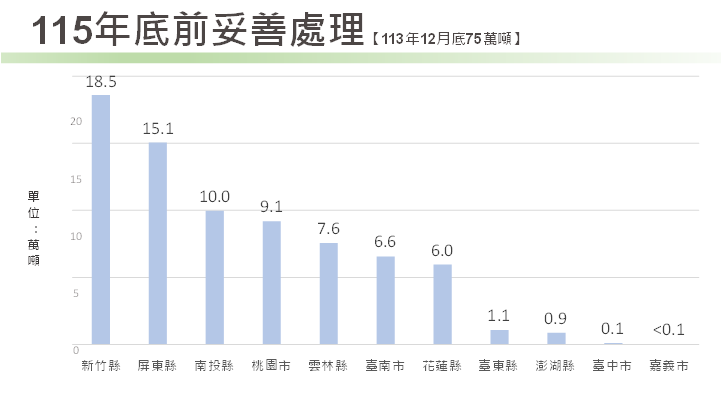 顏署長旭明:報告委員,第一個就是要有流量的概念,委員真的是講到一個重點,所以我們在這個平臺裡面,對外有網站公告所有掩埋場的增減量,那個是對外公開的,114年應該會大量減少,因為114年的下半年度,也就是我們的經費下去之後,他們發包目前都在作業中,下半年度工程就真的進行了。
