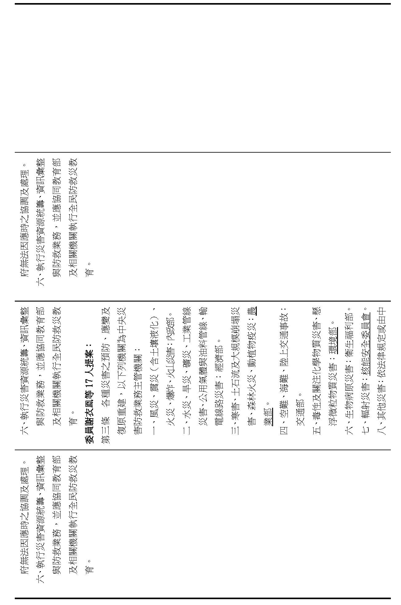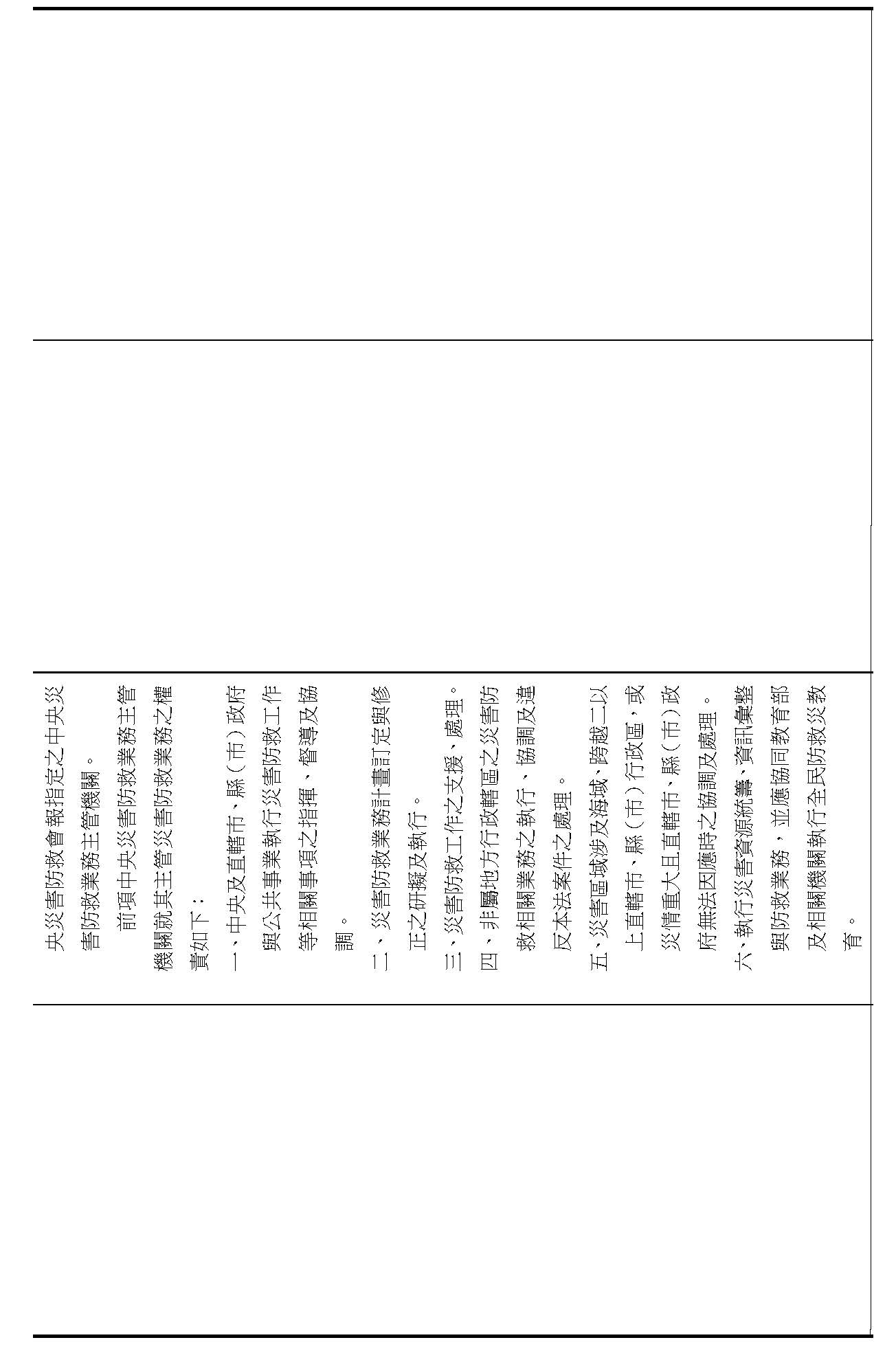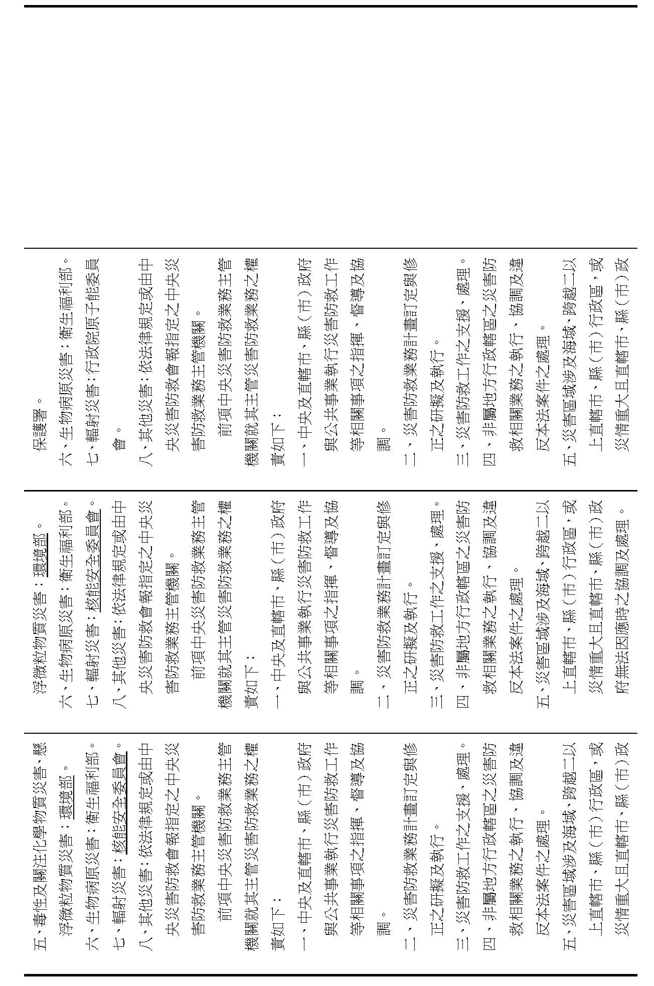 第 三 條 各種災害之預防、應變及復原重建,以下列機關為中央災害防救業務主管機關: