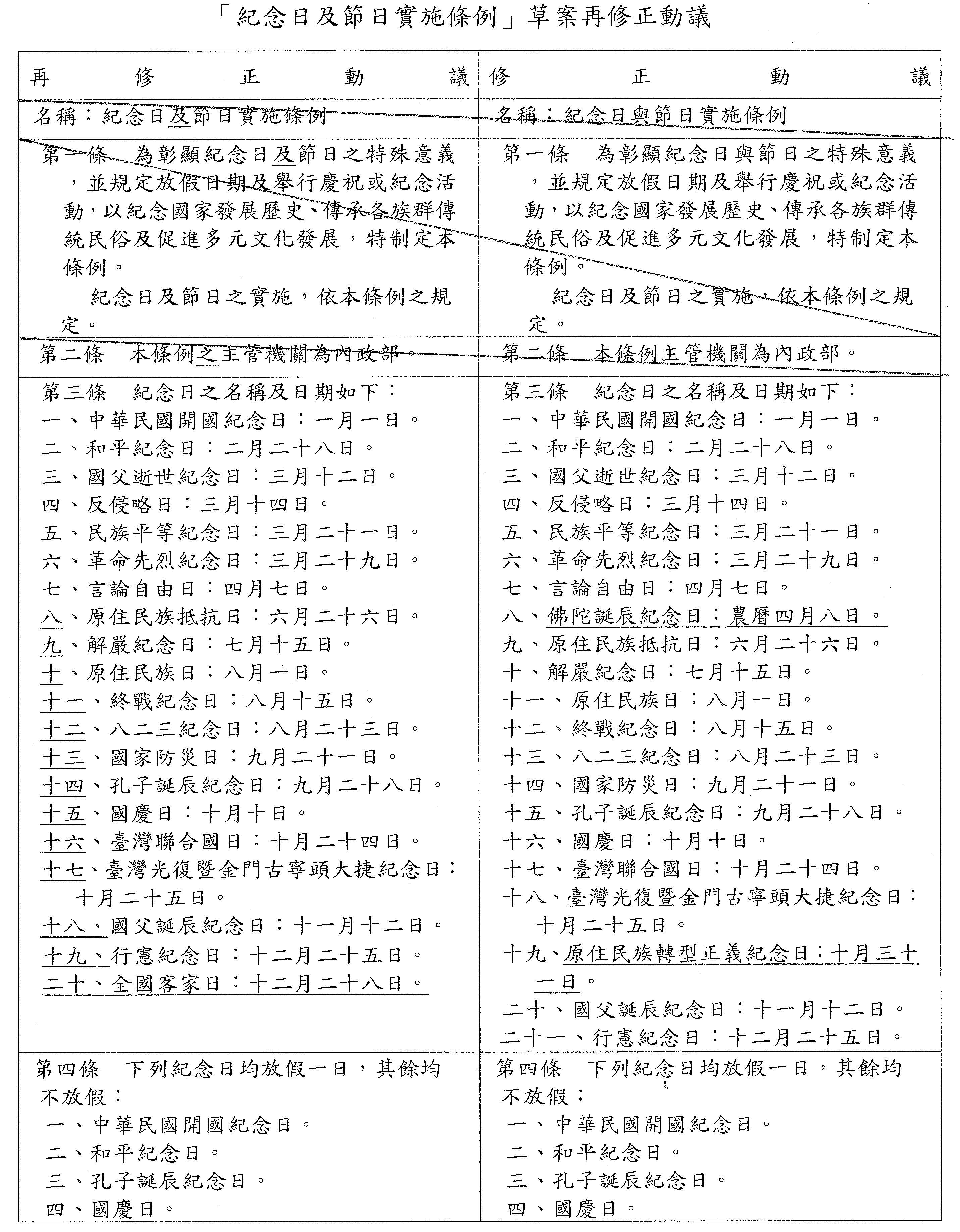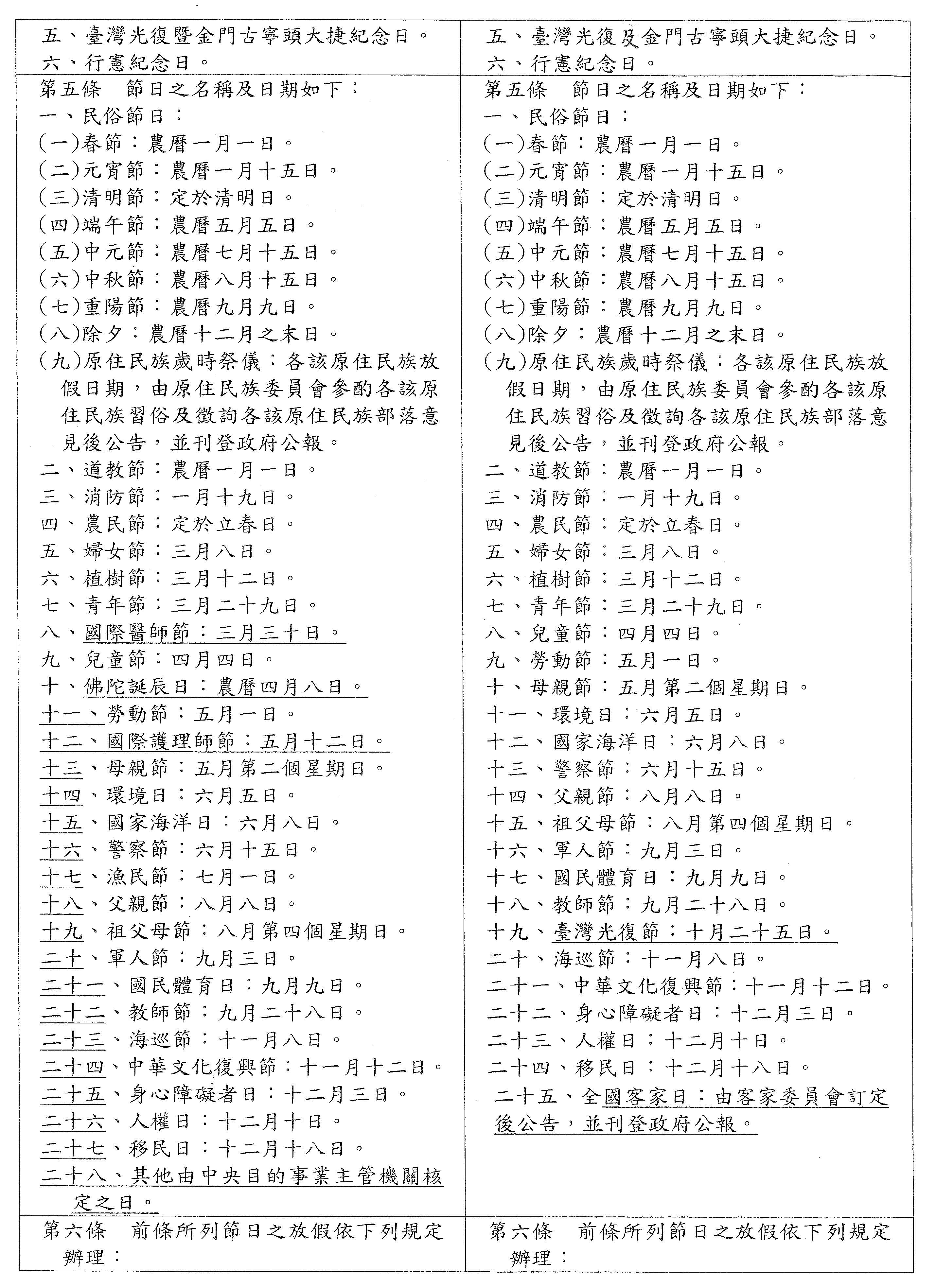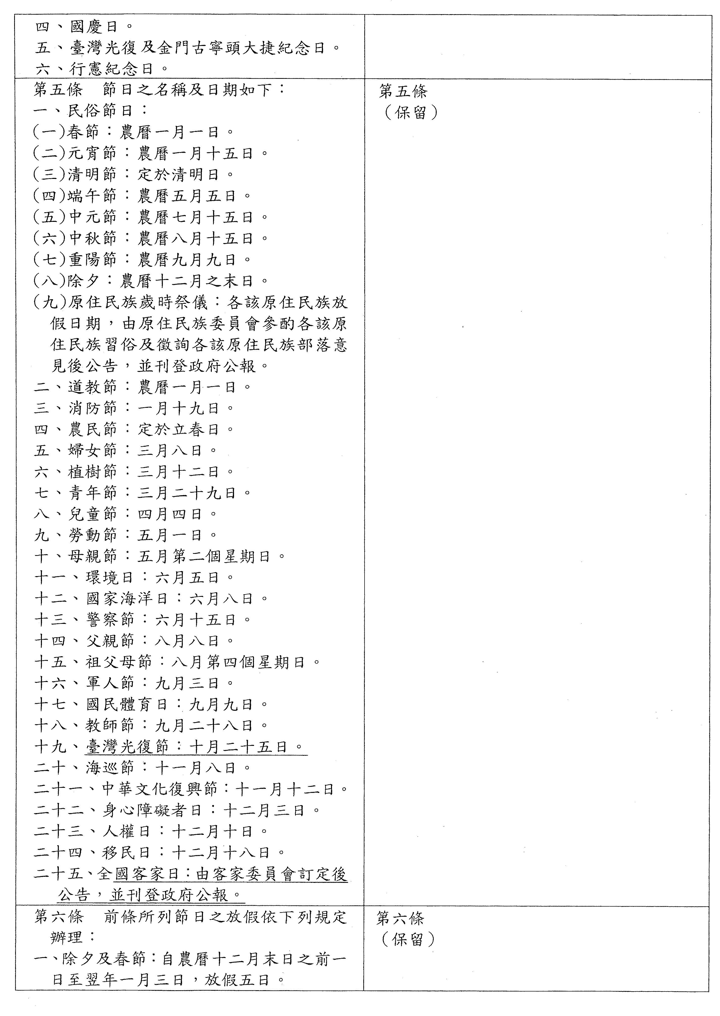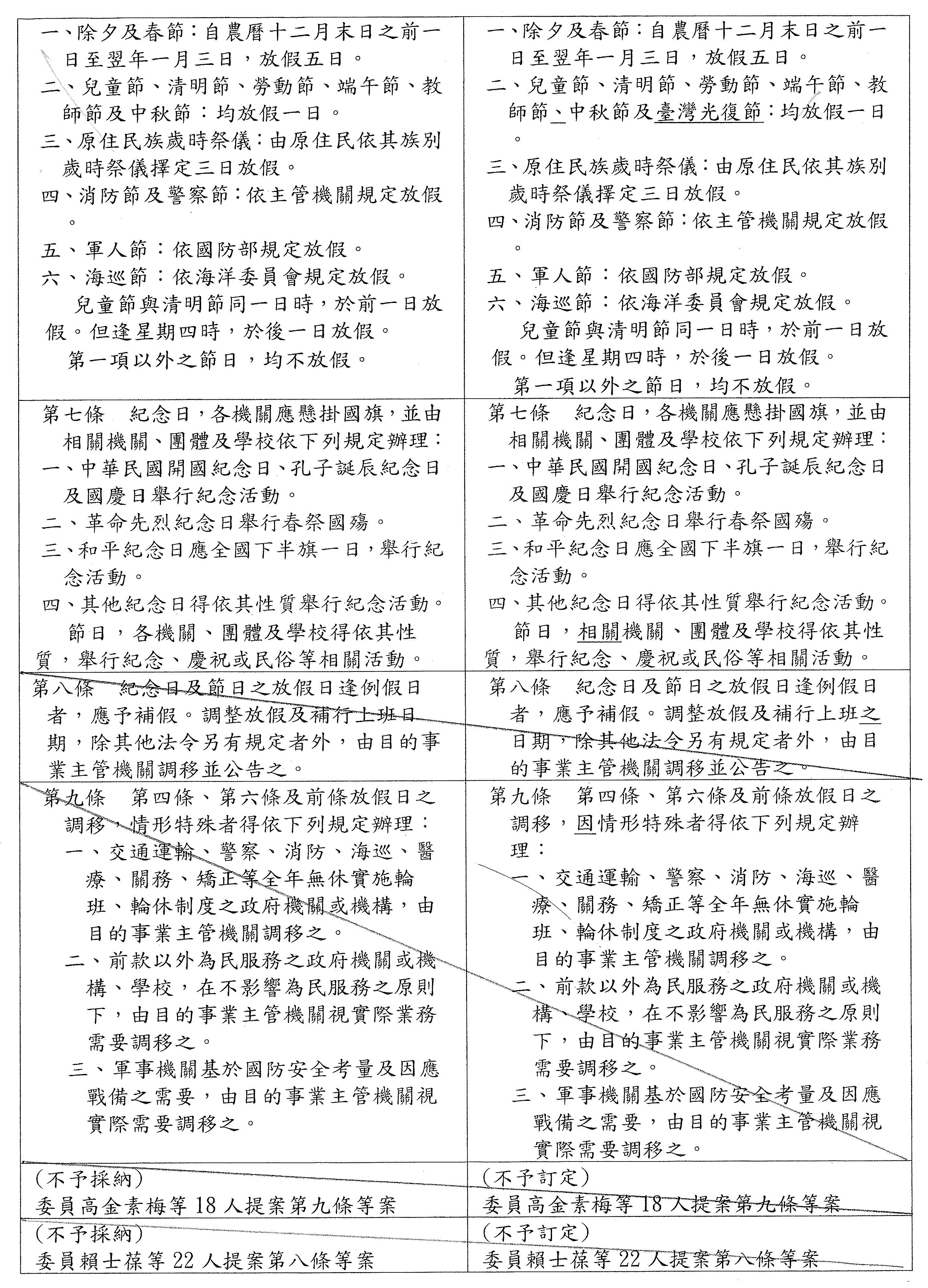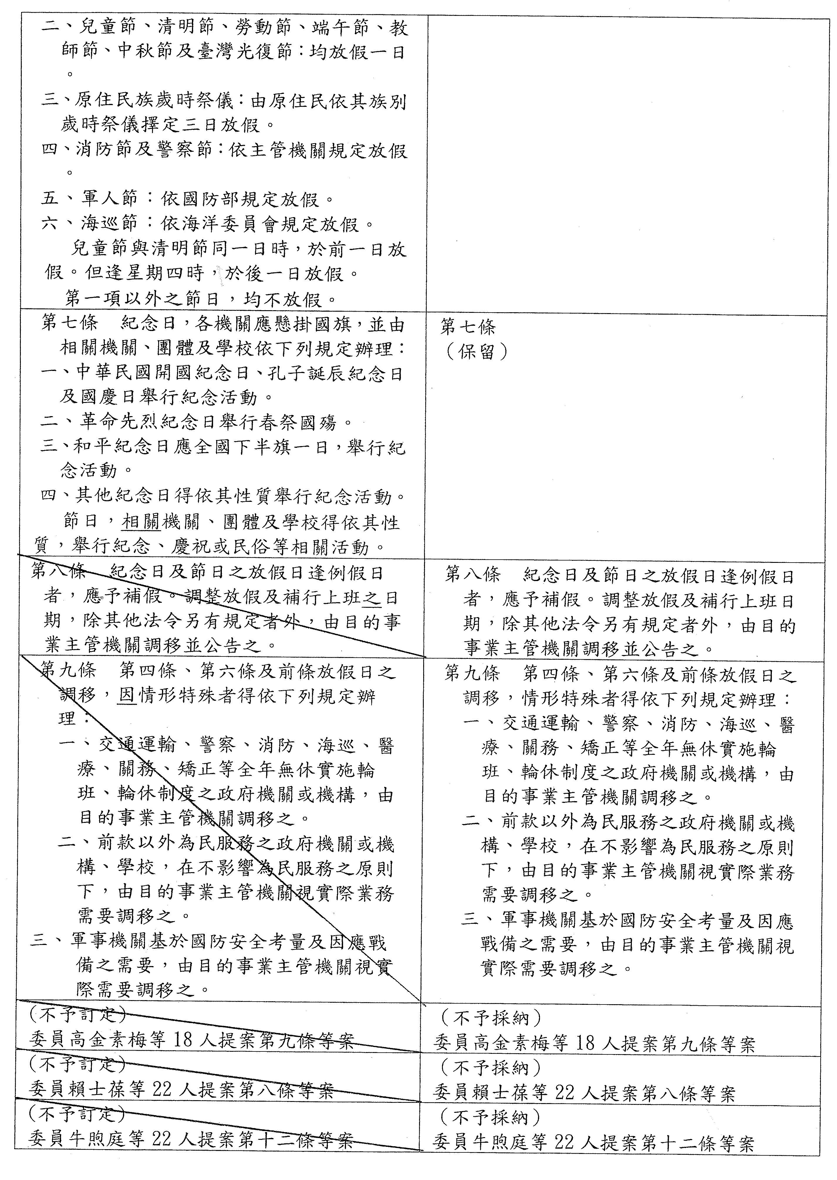 回顧2016年,民進黨政府施行一例一休之際,刪除原有7天國定假日,引發各界高度關注與討論,至今社會仍普遍感受到其負面的影響,尤其對於青年族群、長工時行業的基層勞工而言,更是實質的權益縮減。本黨團在廣納民間意見並審慎評估後,提出4加1版本的修法方案,恢復教師節9月28號、臺灣光復節暨古寧頭大捷紀念日10月25日、行憲紀念日12月25號、春節小年夜以及五一勞動節全國放假,希望在傳統節慶、歷史涵義與勞工需求之間取得兼顧與平衡。
