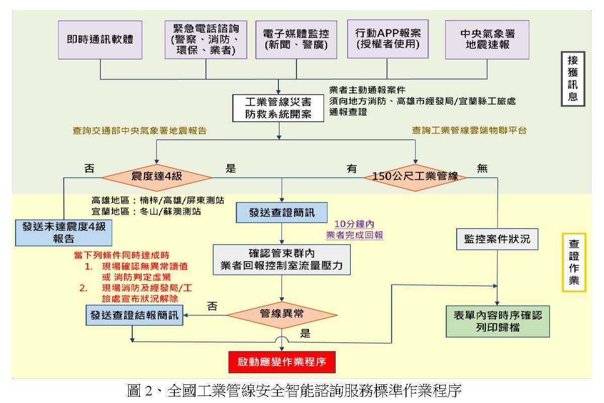 (一)委由工業技術研究院辦理全國工業管線安全智能諮詢服務,提供24小時不中斷服務,一旦發生任何工業管線事件,智能服務值班台均可於任何時段通知管束聯防業者進行查察確認,以維護管線安全,其標準作業程序如下圖2。