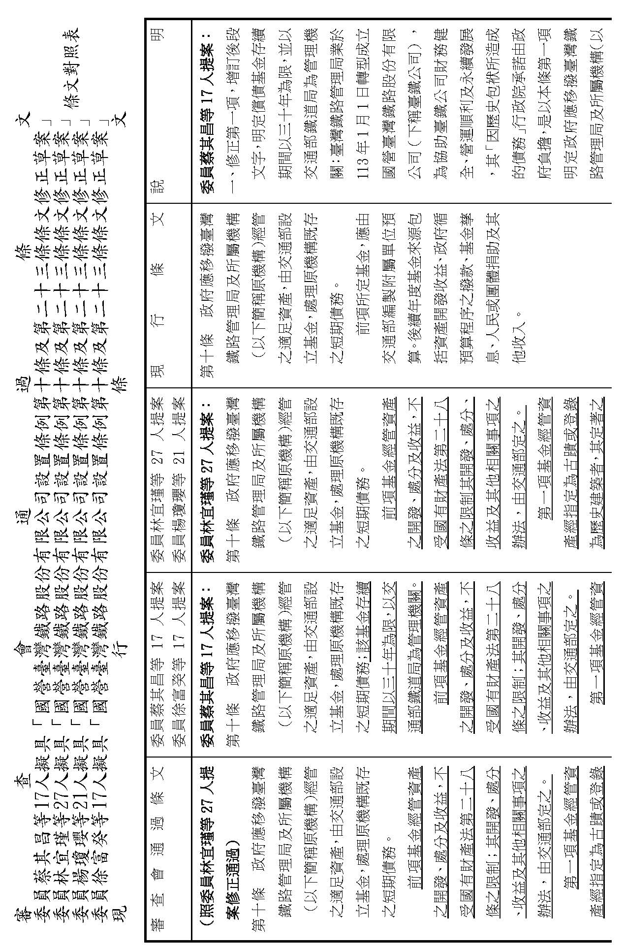 一、114年3月19日報告及詢答完畢,於4月30日進行條文審查。與會委員於聽取說明並經討論研商後,完成全案之審查,審查結果如下: