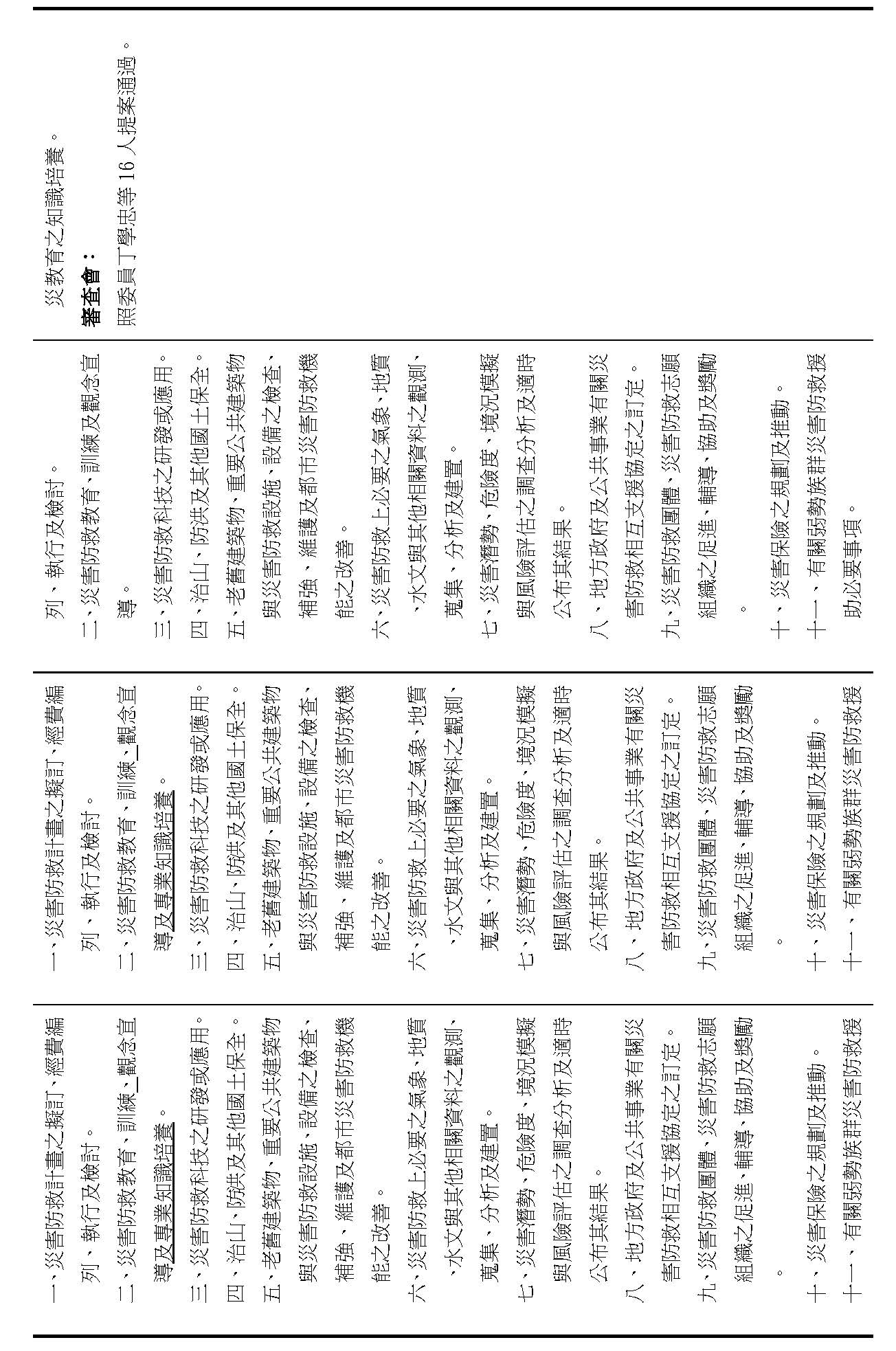 一、本次會議審查大院委員擬具「災害防救法」條文修正草案等4案。
