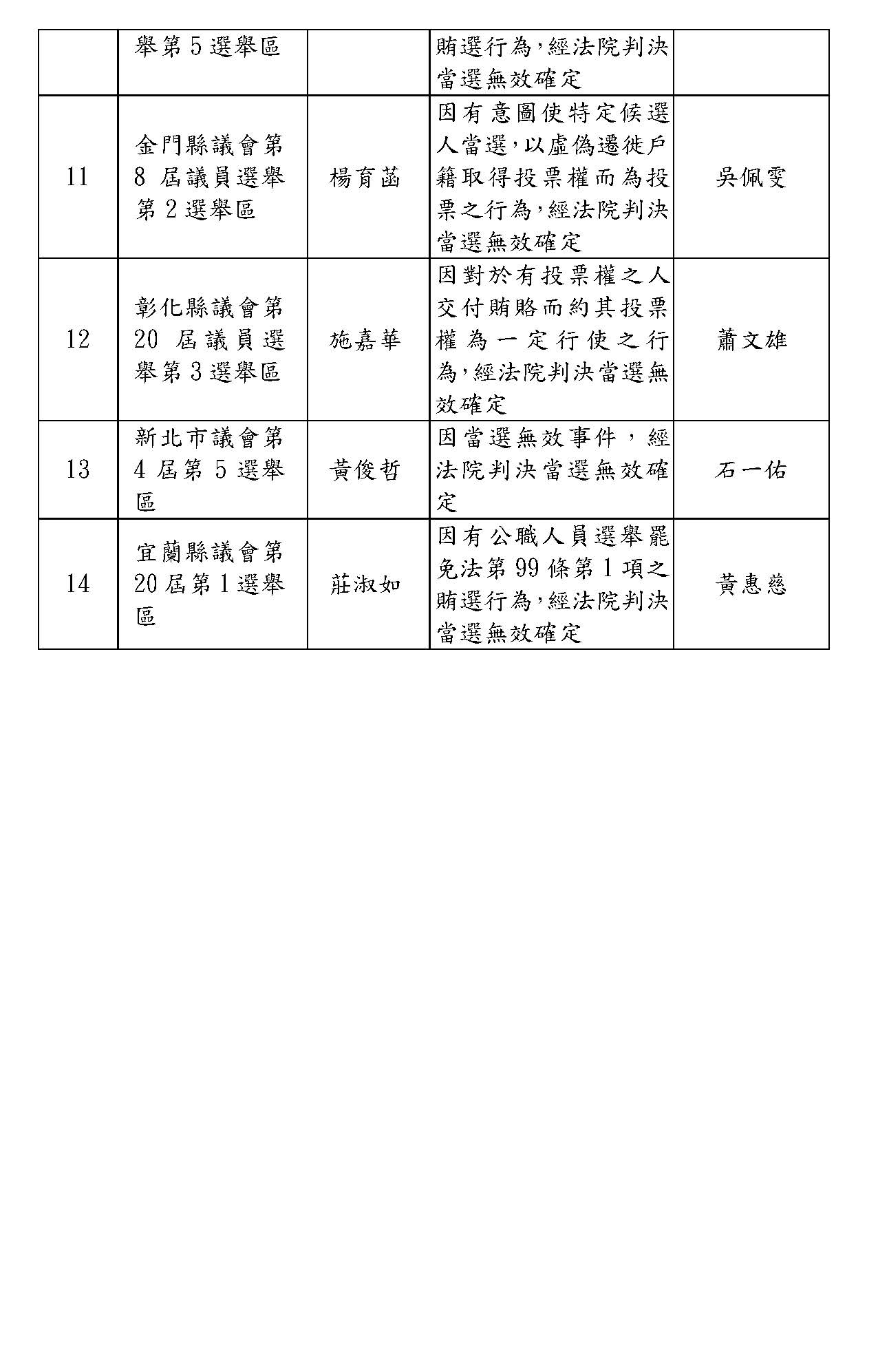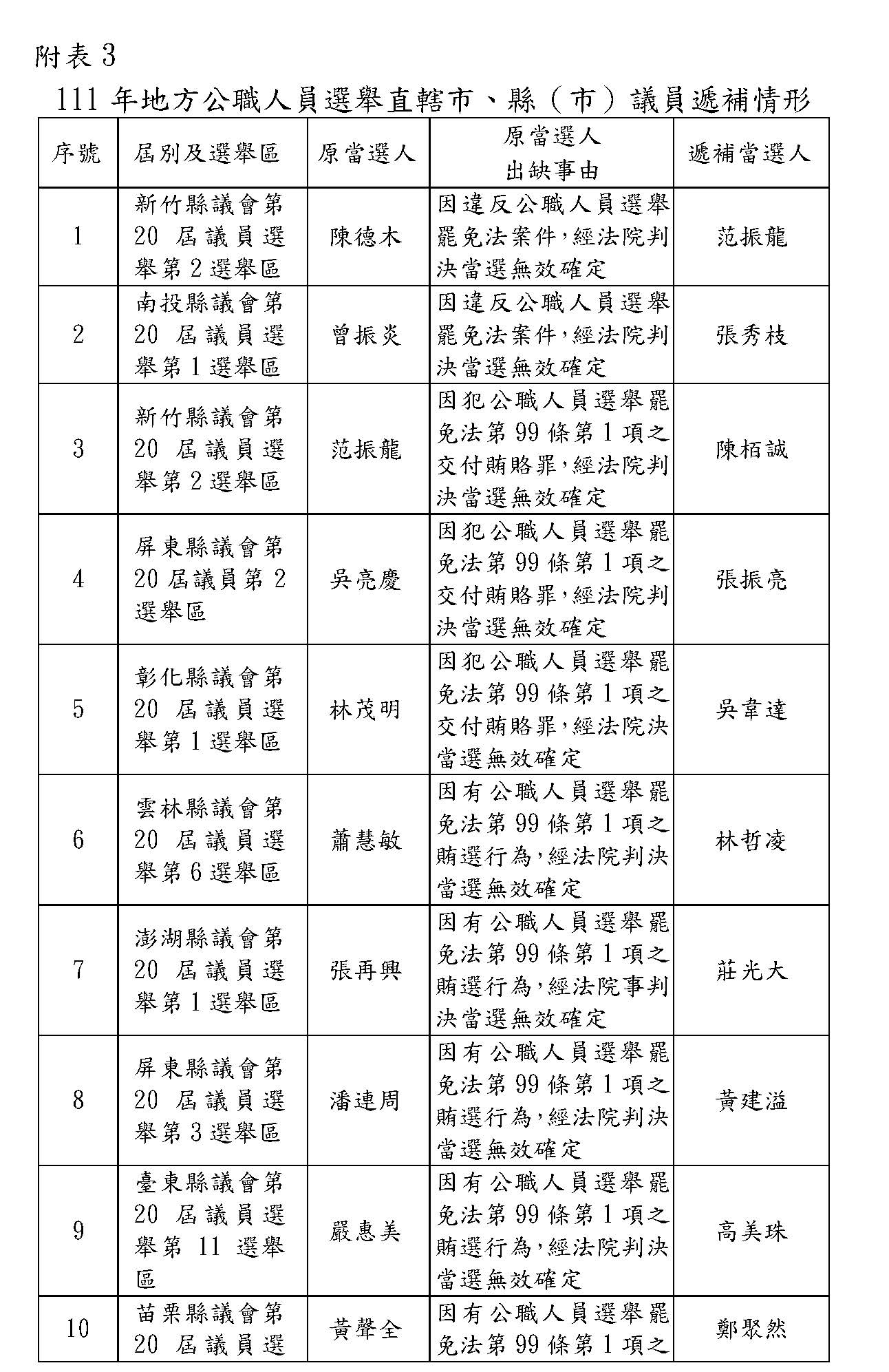 截至目前為止,已遞補本屆直轄市、縣(市)議員14人,遞補情形詳如附表3。