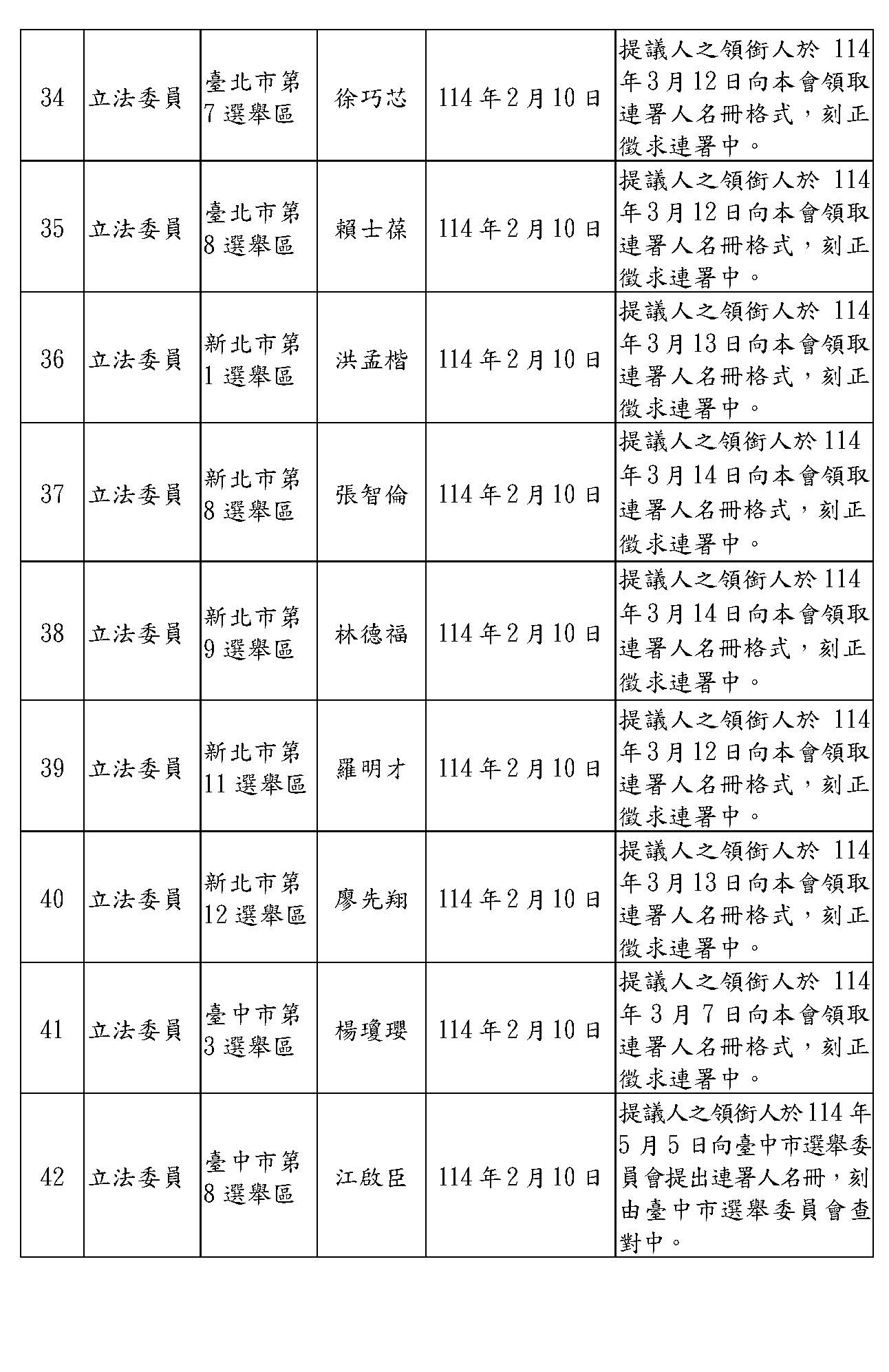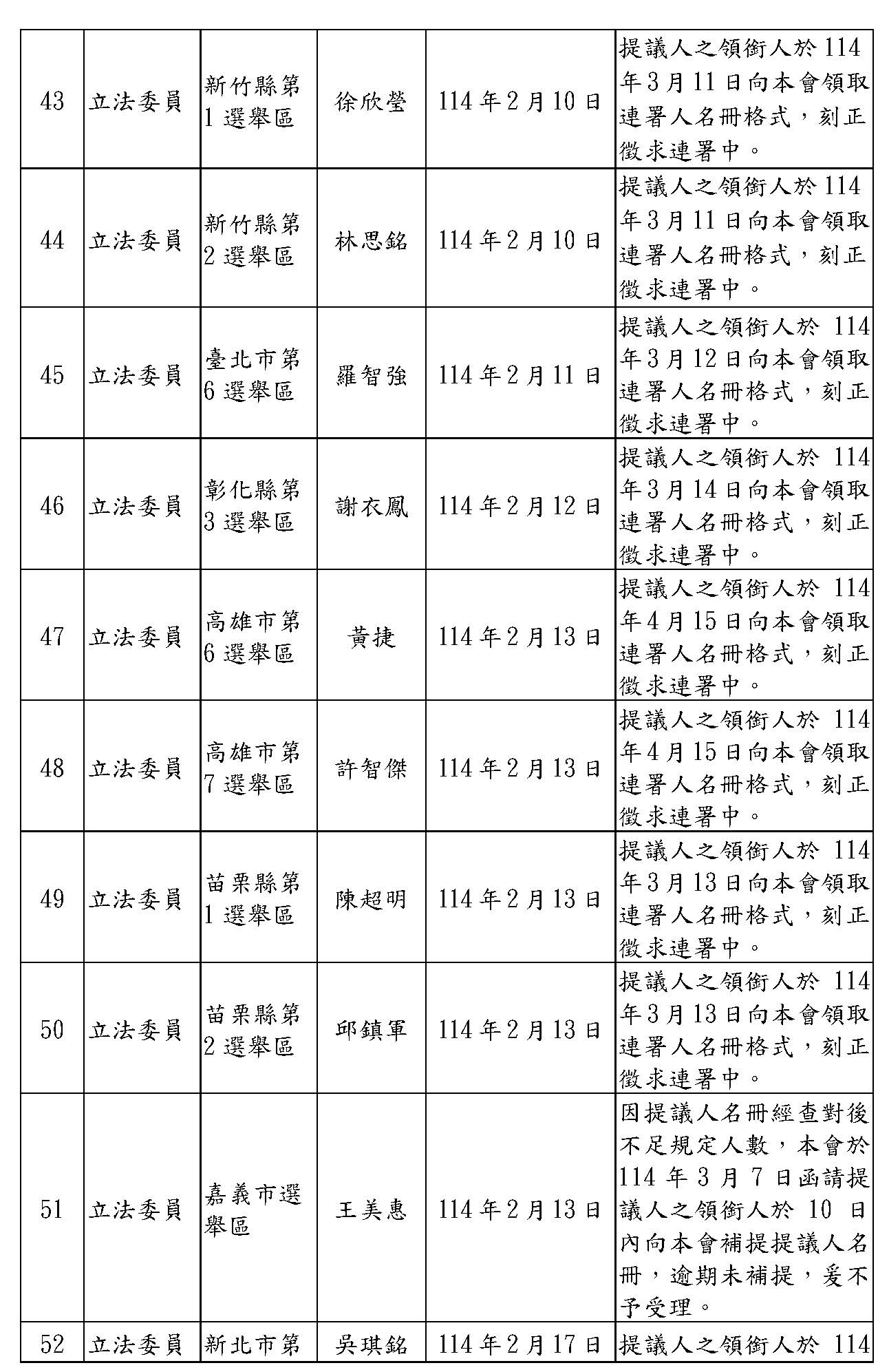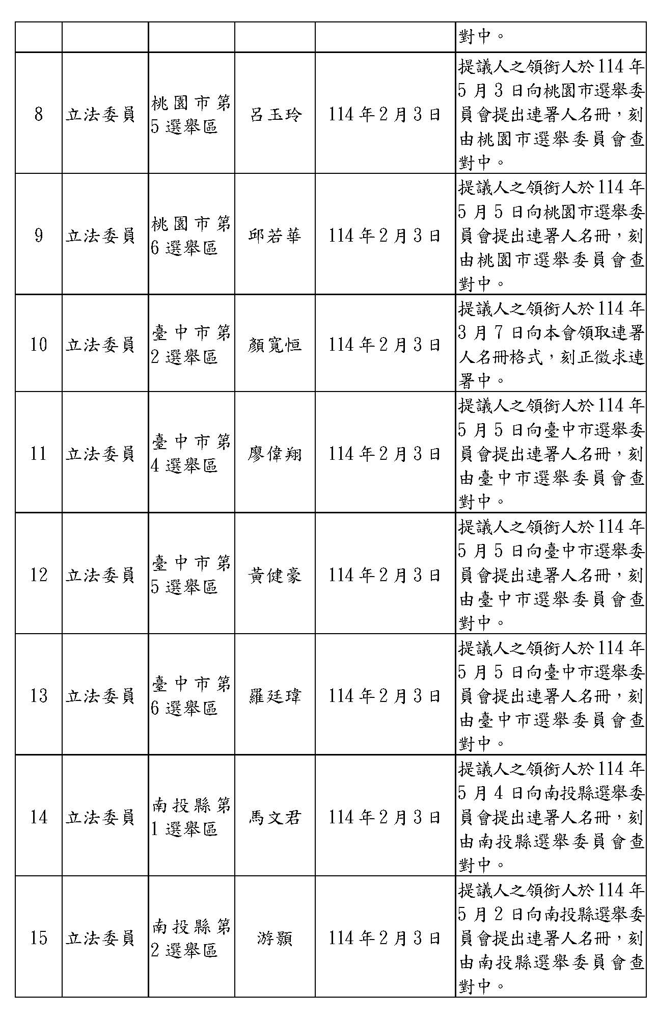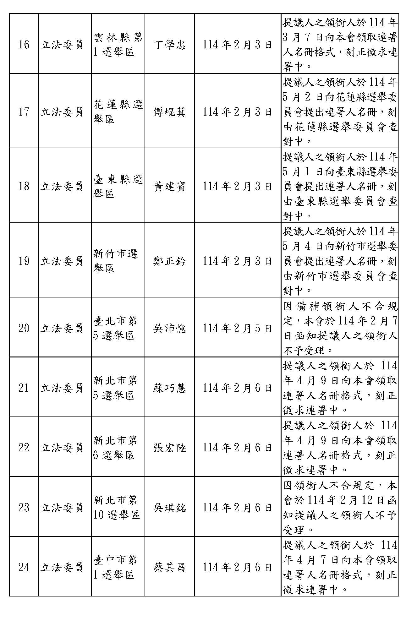 (一)立法委員罷免案54案,其中因領銜人、備補領銜人不合規定不予受理2案,因逾期未補提提議人名冊不予受理2案,選舉委員會查對連署人名冊中16案,提議人之領銜人徵求連署中34案。這個數字應該要做個更新,到昨天下午下班為止選舉委員會查對連署人名冊已經增加到20案。