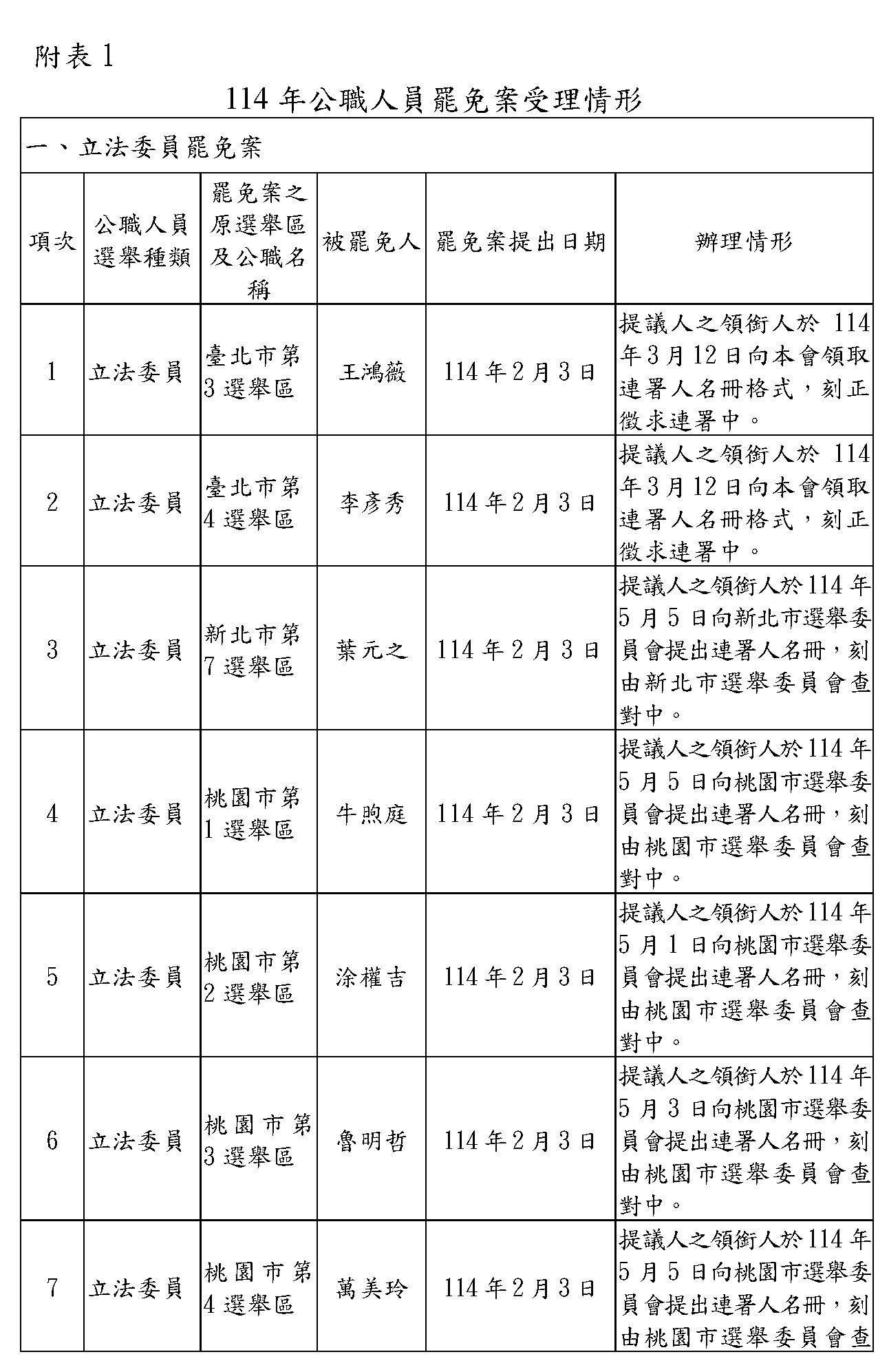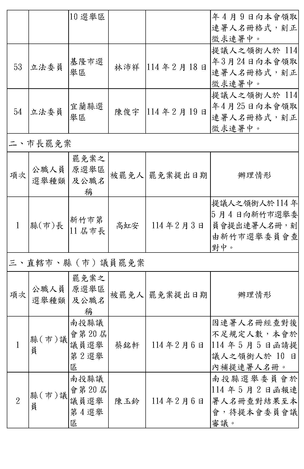 自114年2月3日至114年2月19日止,本會受理立法委員及地方公職人員罷免案計64案,其中立法委員罷免案54案,市長罷免案1案,直轄市議員、縣(市)議員罷免案9案,截至114年5月5日止,各案辦理情形如次(詳如附表1),請各位委員參閱,說明如下: