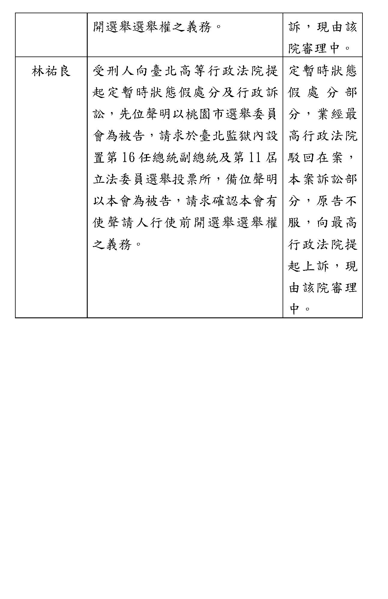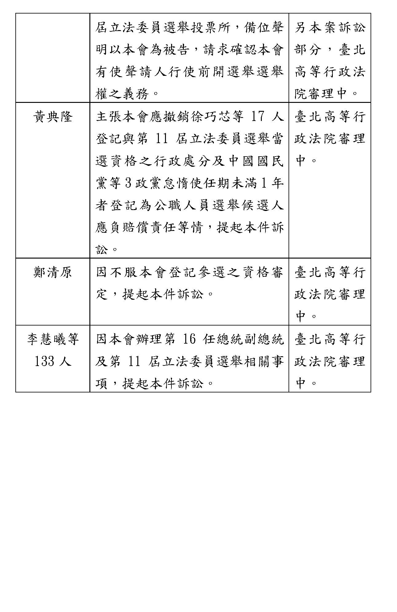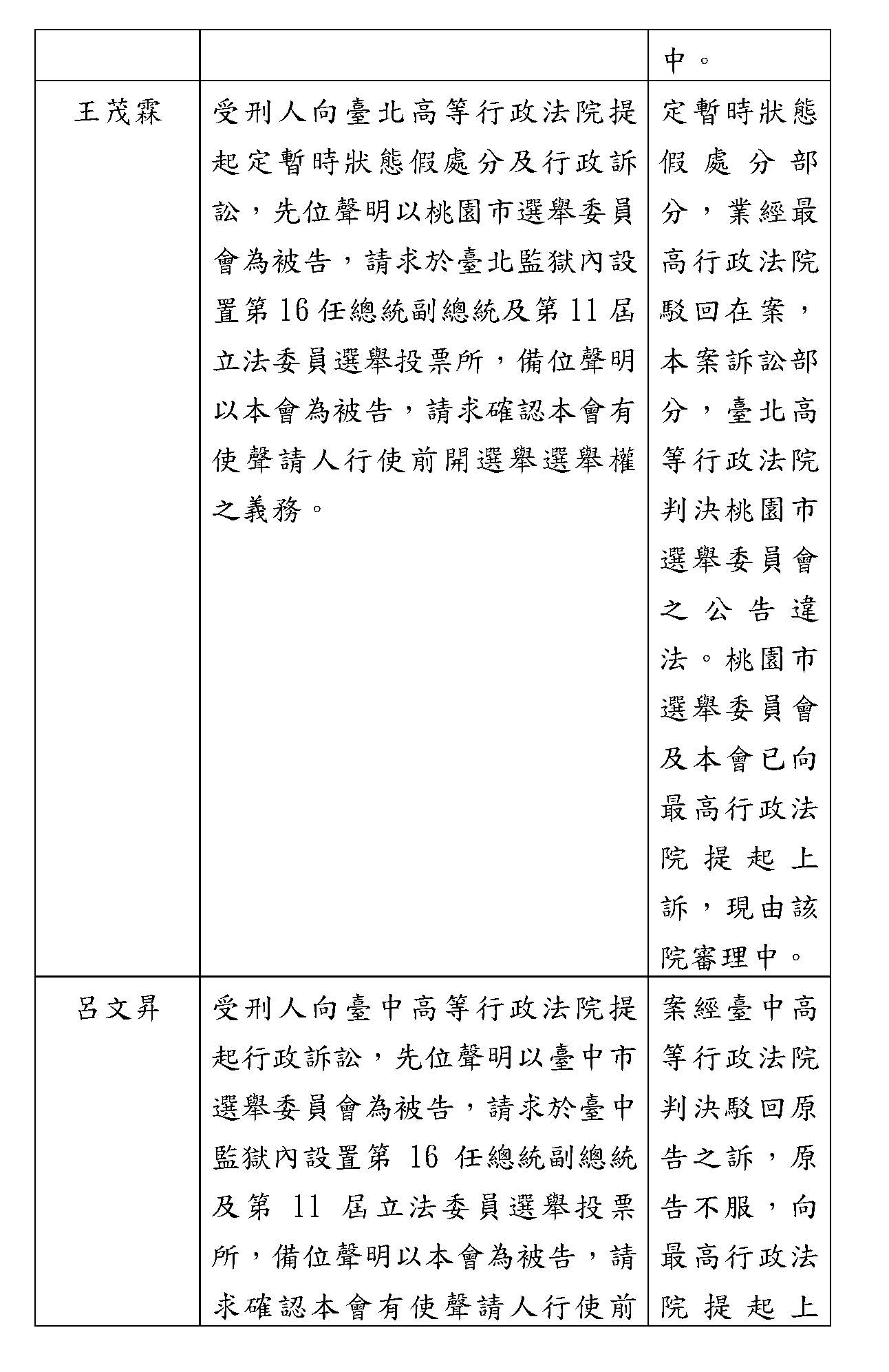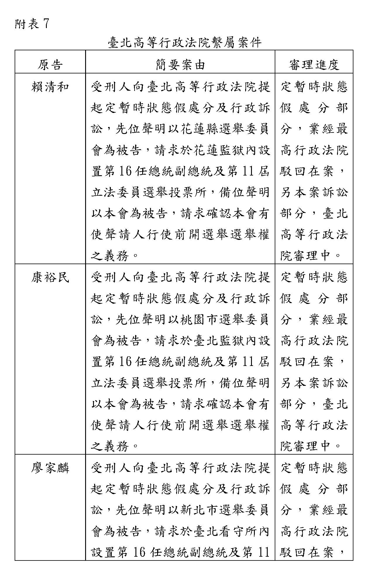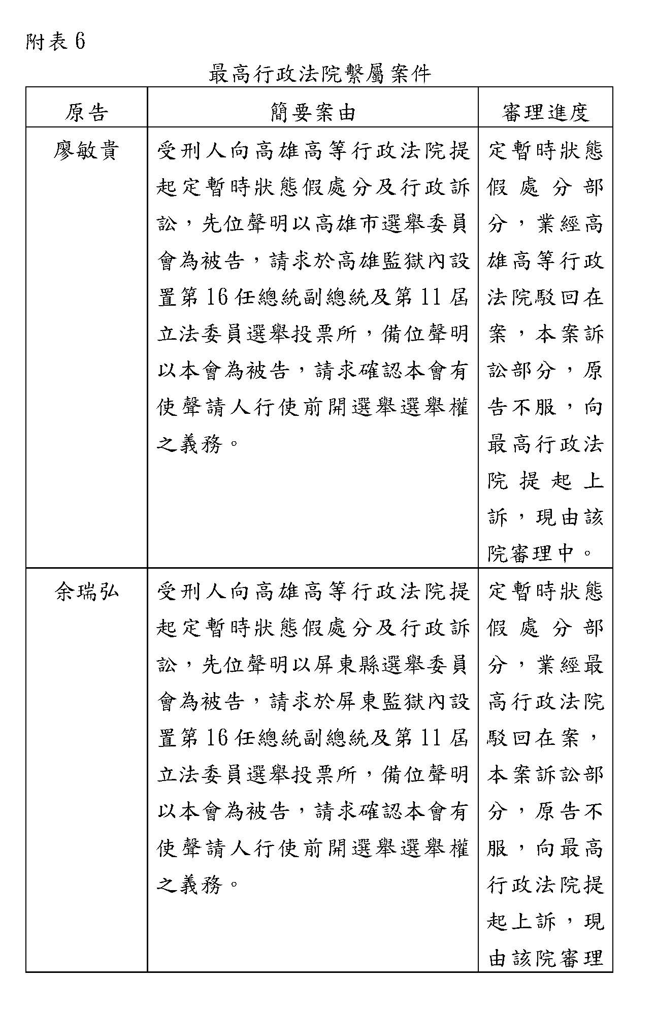 選舉爭訟案件目前尚繫屬中之案件檢署計有最高行政政法院5件、臺北高等行政法院6件,各該訴訟案件之進度詳如附表6、7。