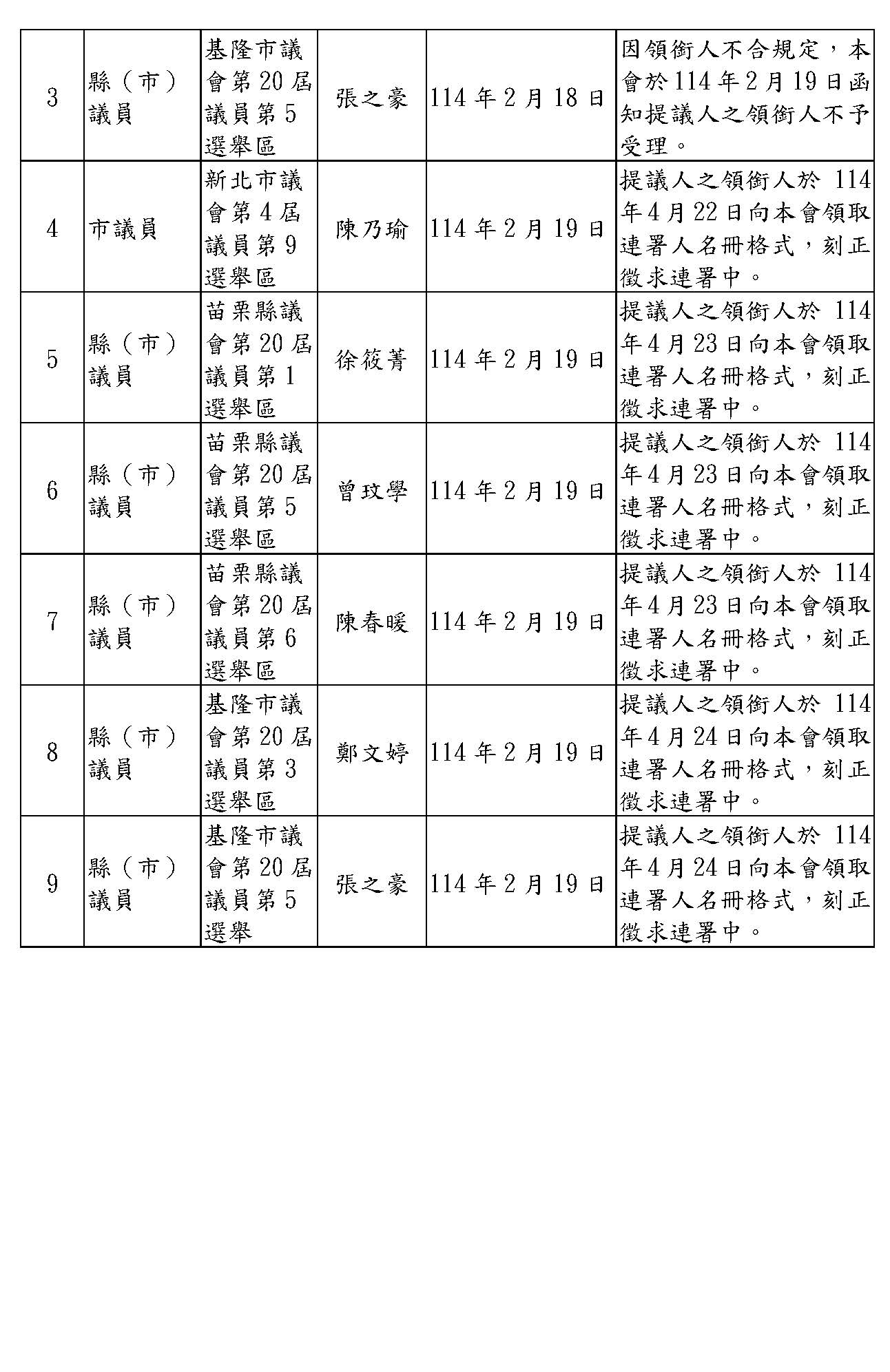 (三)直轄市、縣(市)議員罷免案9案,其中因領銜人不合規定不予受理1案,連署人名冊查對結果待提本會委員會議審議1案,函請提議人之領銜人補提連署人名冊1案,提議人之領銜人徵求連署中6案。