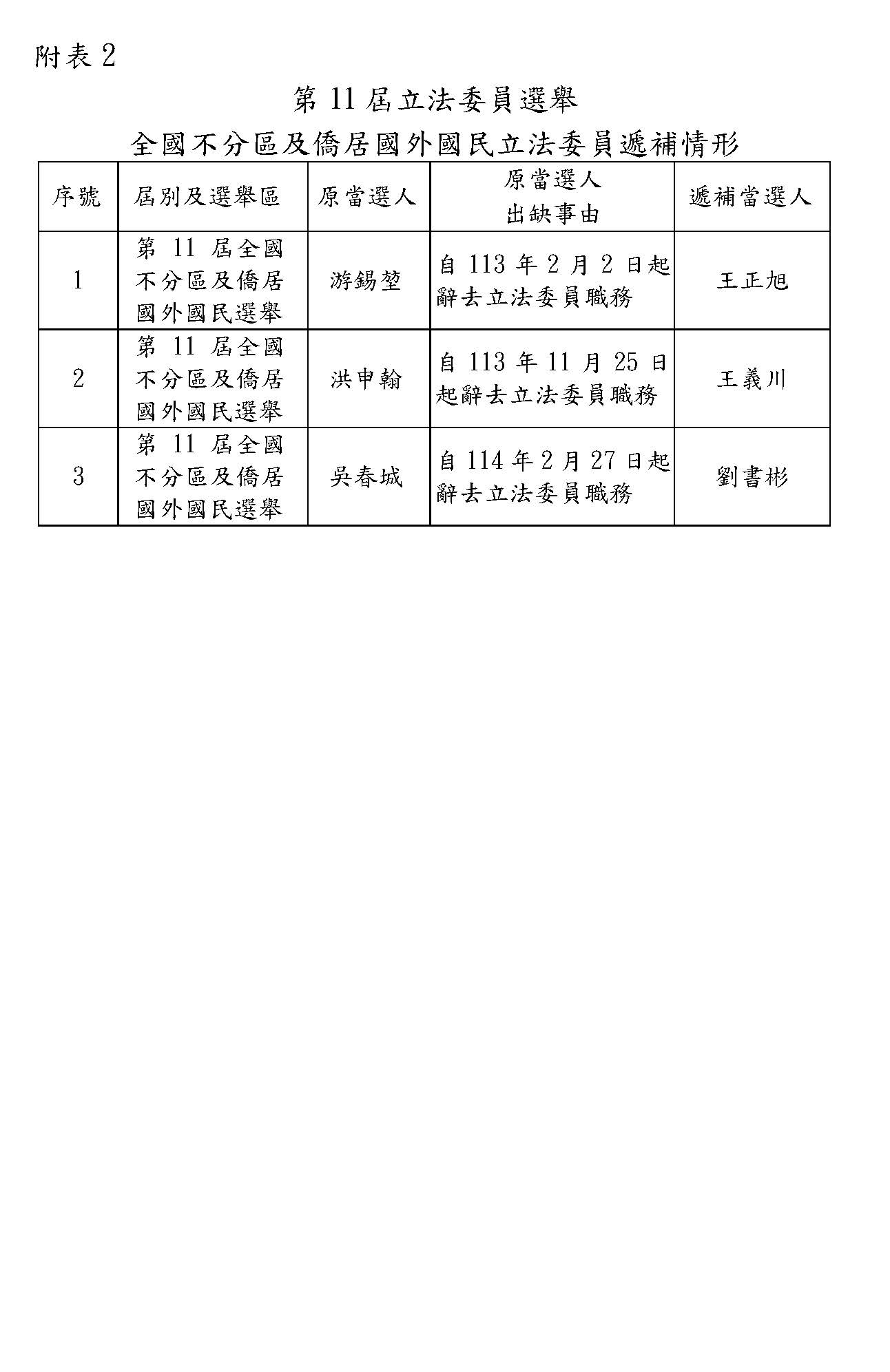 截至目前為止,以遞補本屆全國不分區及僑居國外國民立法委員3人,遞補情形詳如附表2。