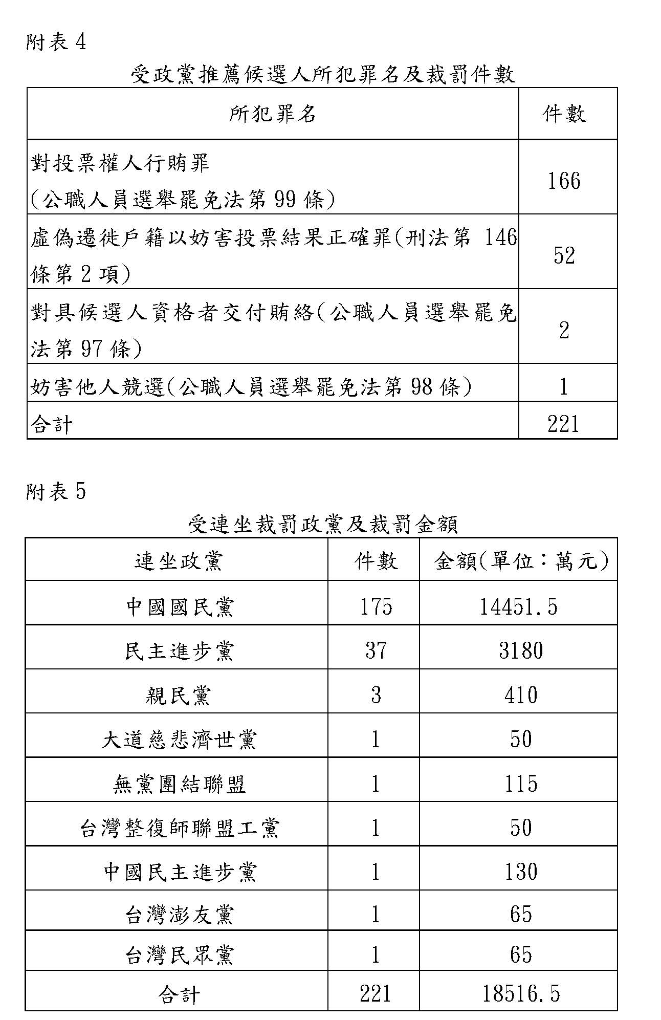本會自101年4月3日起,迄今計裁罰221件,裁罰金額累計新臺幣1億8,516萬5千元,受連坐裁罰政黨、受政黨推薦候選人所犯罪名及裁罰金額等詳如附表4、5。