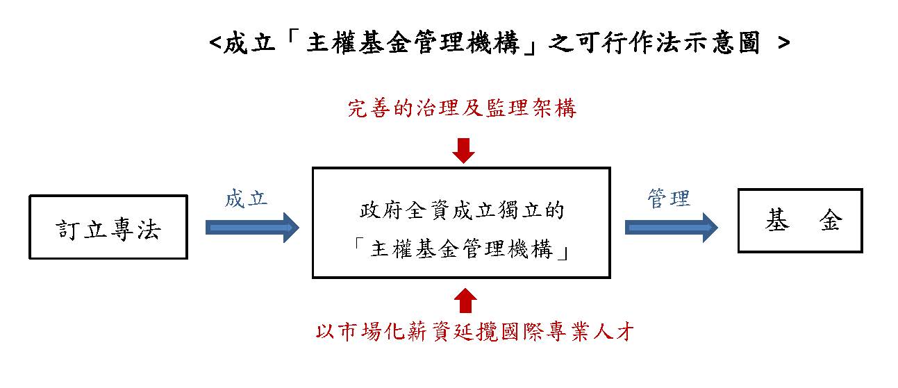 (四)制定合適專法:目前設立主權基金之國家,如韓國、挪威、愛爾蘭、澳洲、紐西蘭等,多以專法規範主權財富基金之設立及運作。我國主權基金的設立,應制定專法,設立專責管理機構,明訂主權基金的設立目的、資金來源、完善治理及監理架構,以確保主權基金營運公開透明,並符合政策目標。
