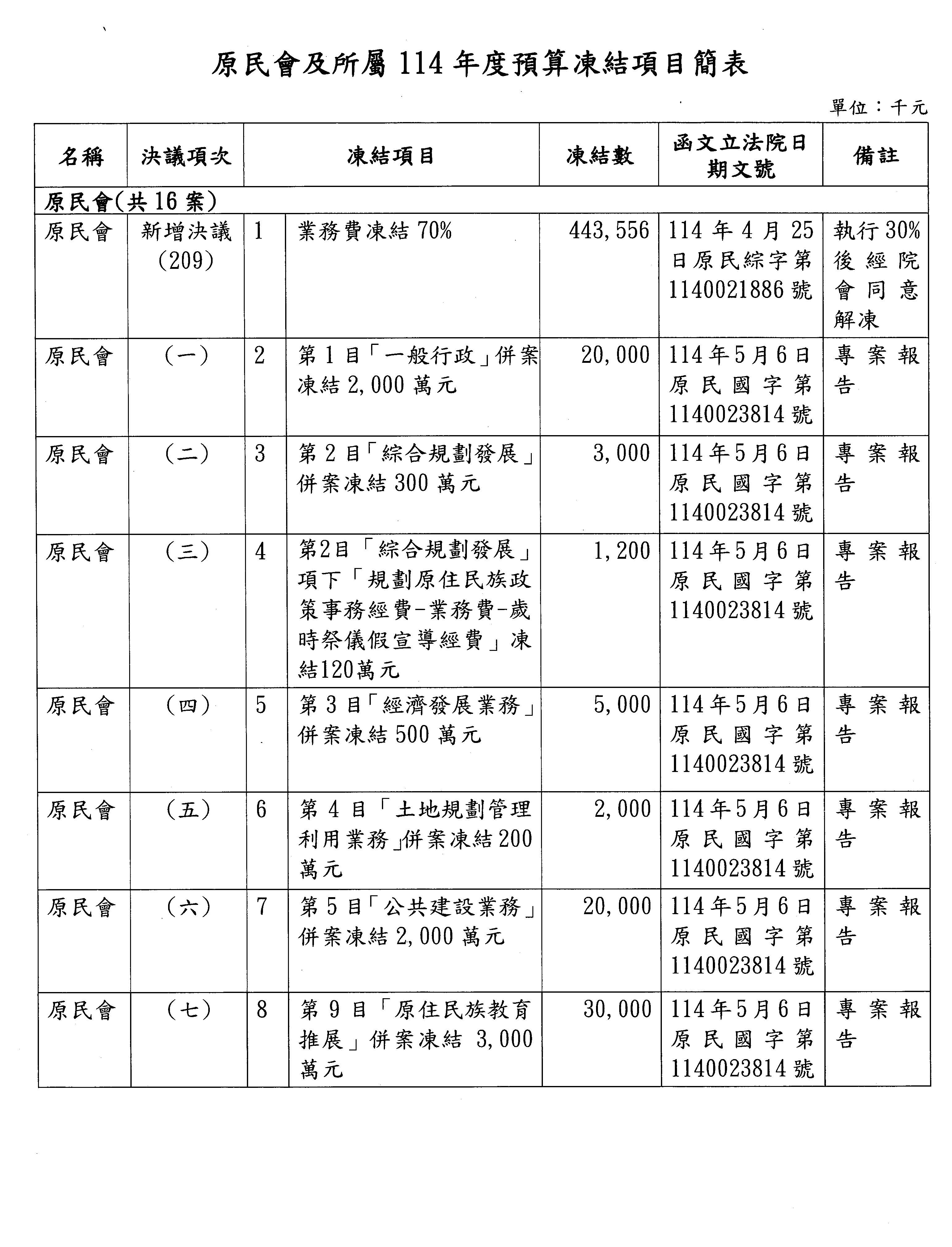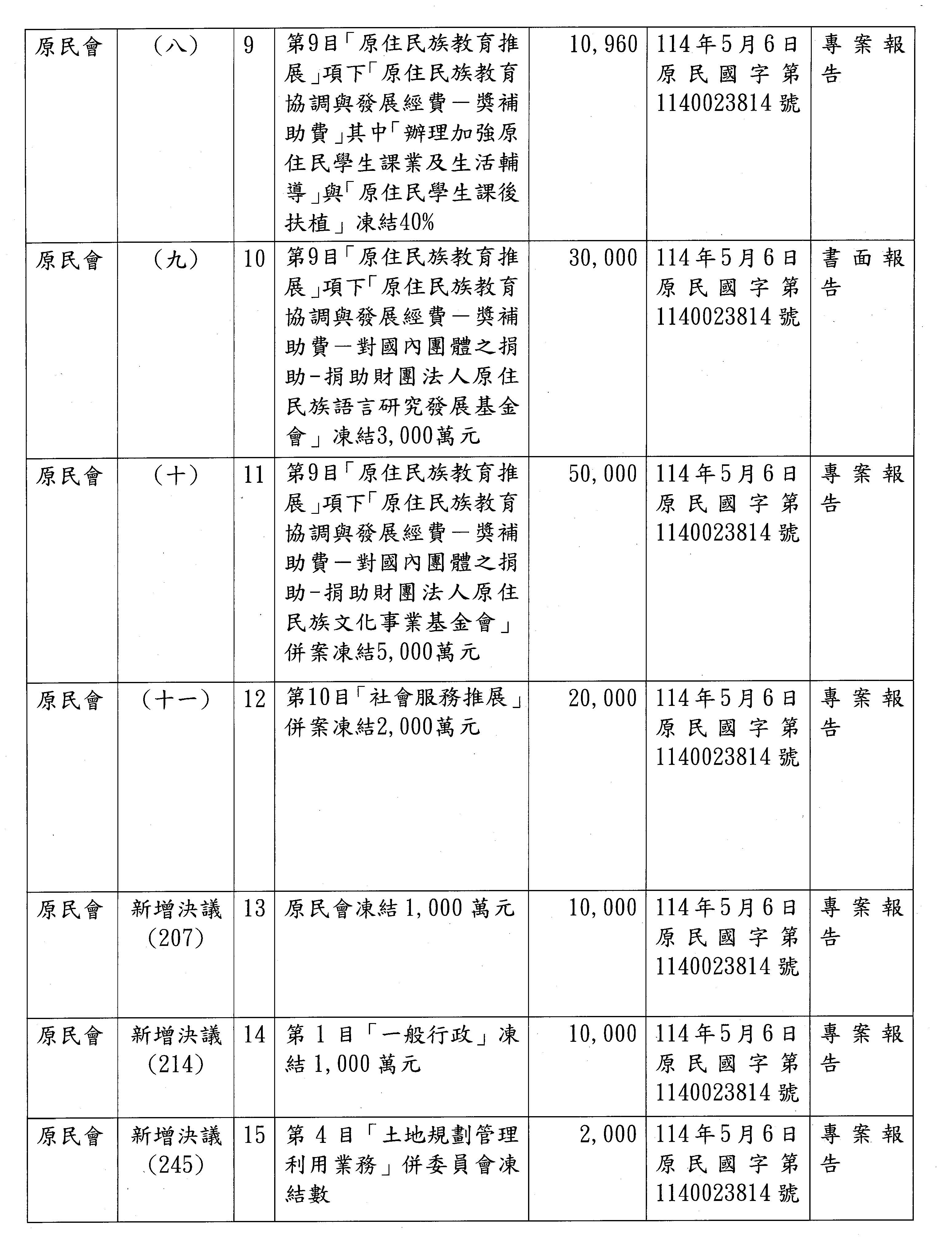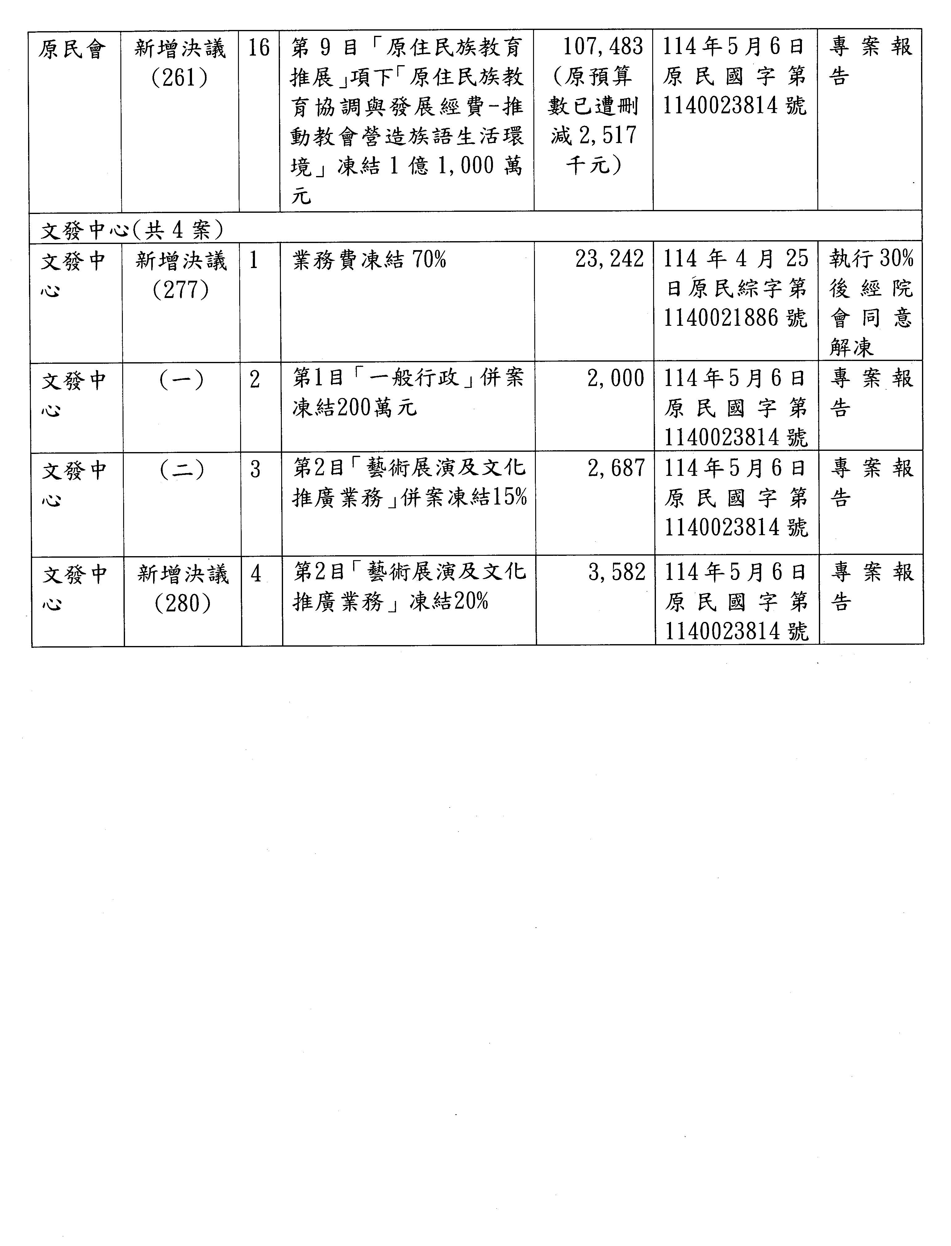(二)原住民族委員會函,為114年度中央政府總預算決議,檢送第2款第8項決議(一)至(十一)、第2款第9項決議(一)、(二)及新增決議(二○七)、(二一四)、(二四五)、(二六一)、(二八○)預算凍結報告,請查照案。