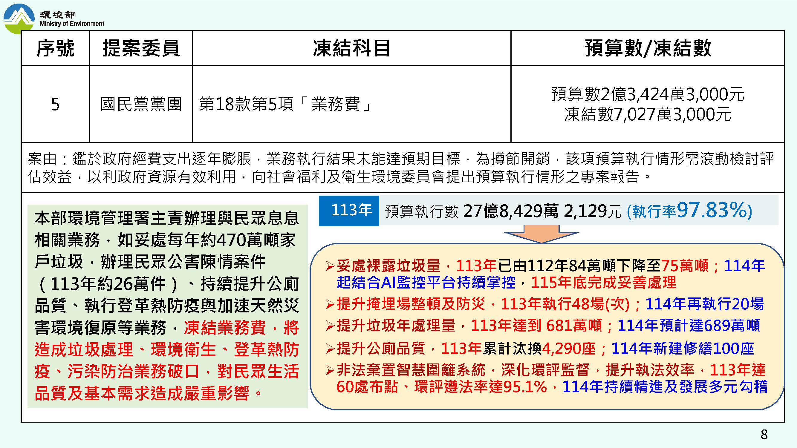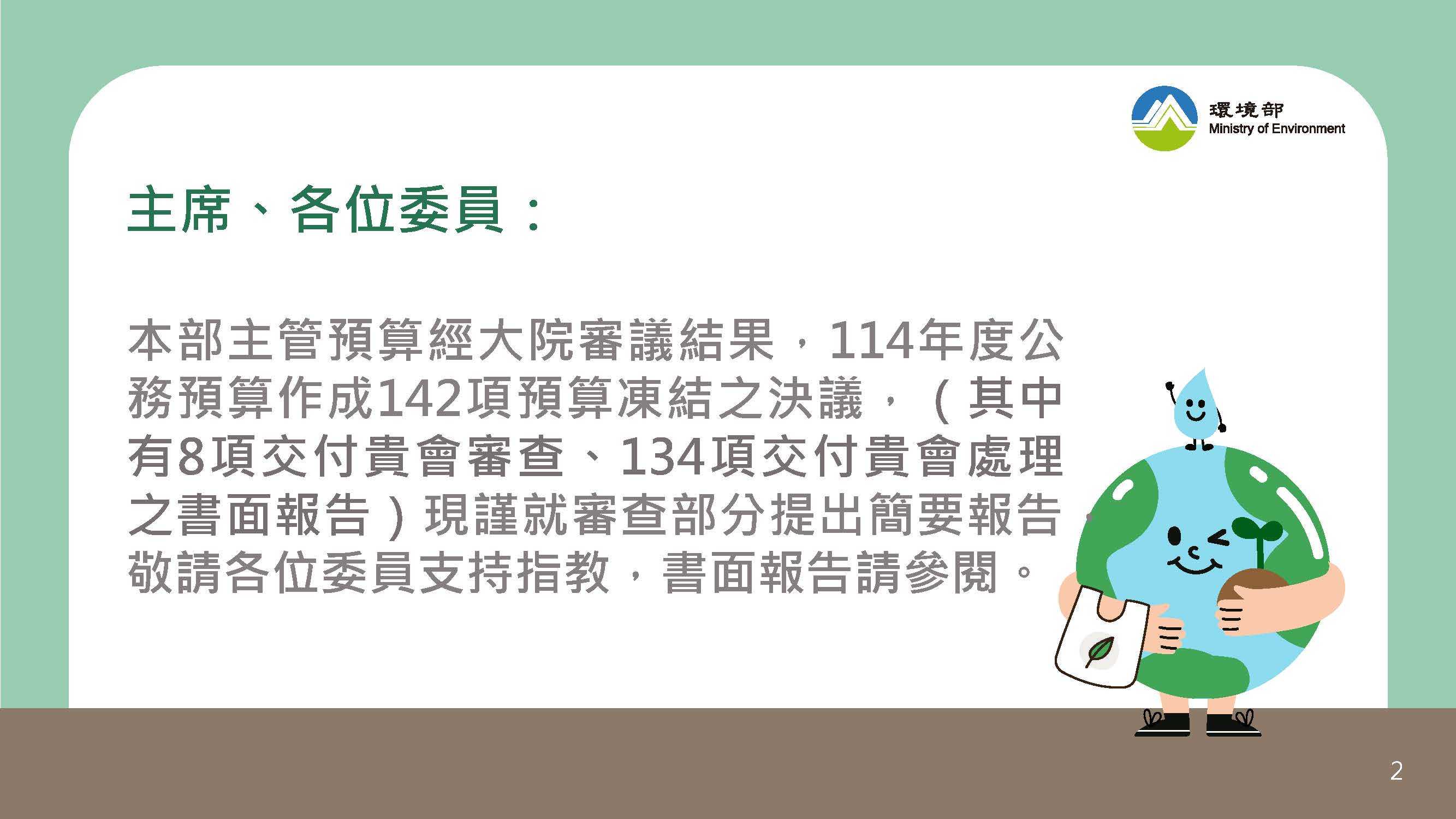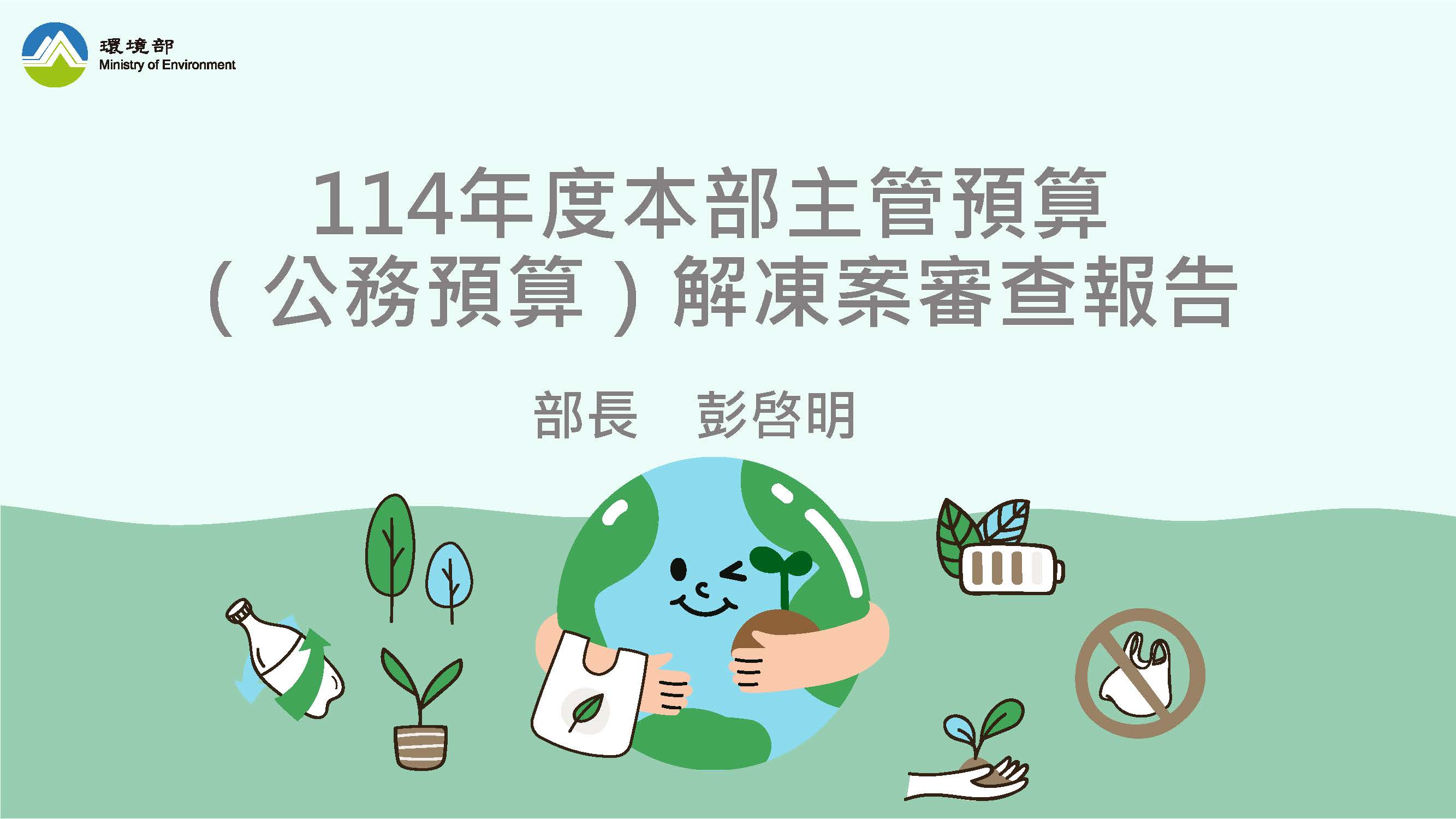 (九十二)環境部函,為114年度中央政府總預算決議,檢送第18款第5項決議(二)「一般行政」項下「環境管理基本行政工作維持」之「水電費」預算凍結20萬元書面報告。