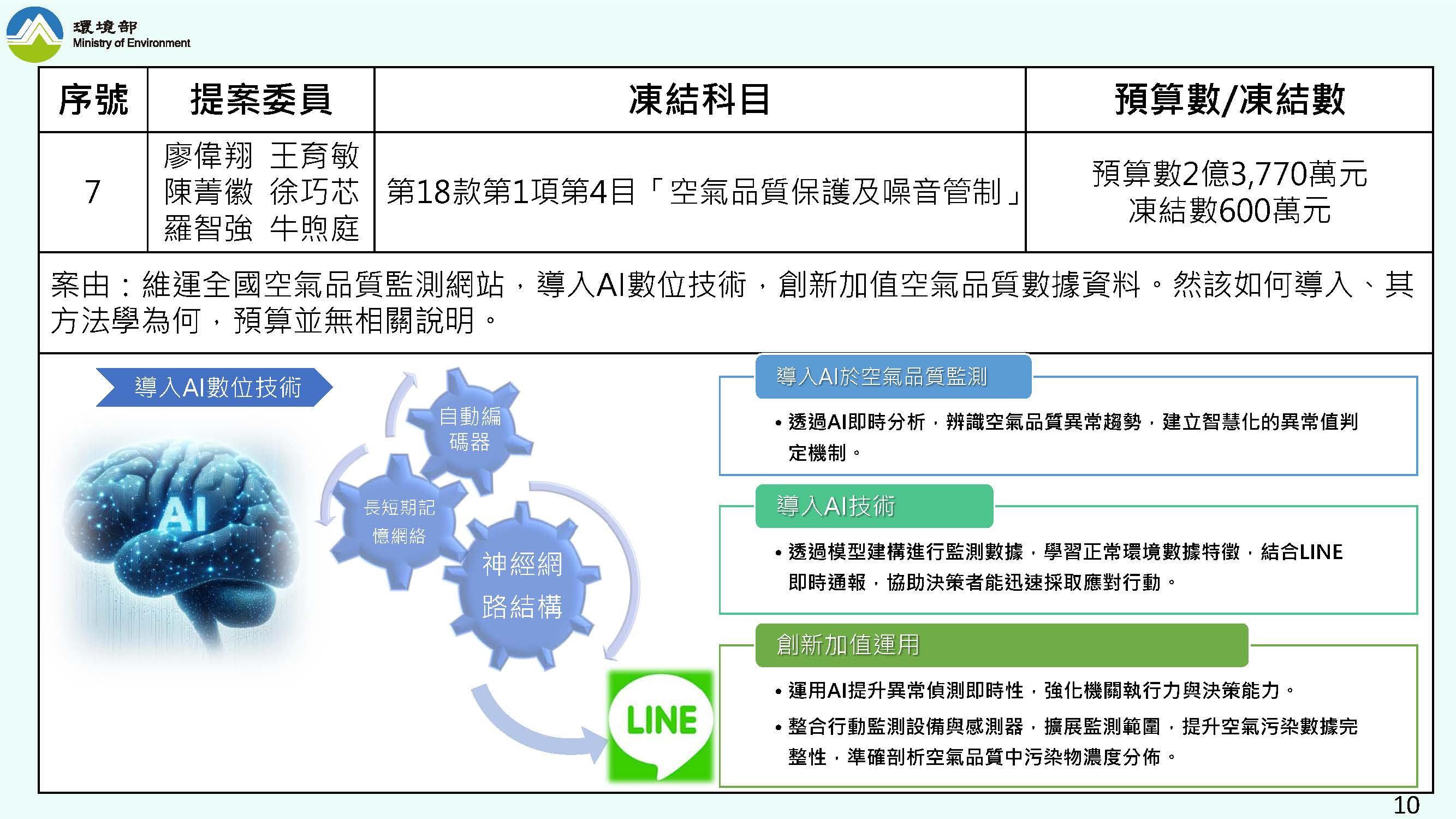 (二十一)環境部函,為114年度中央政府總預算決議,檢送第18款第1項決議(二十)「空氣品質保護及噪音管制」預算凍結100萬元書面報告。