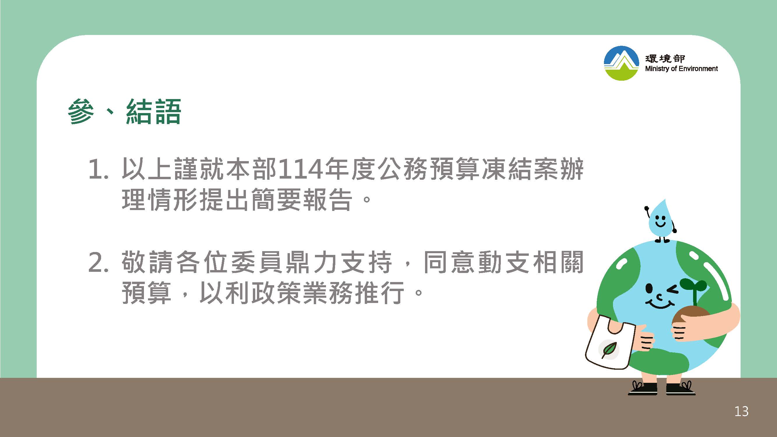 (十三)環境部函,為114年度中央政府總預算決議,檢送第18款第1項決議(十一)「綜合企劃及管制考核」項下「生活轉型環標管理」預算凍結100萬元書面報告。