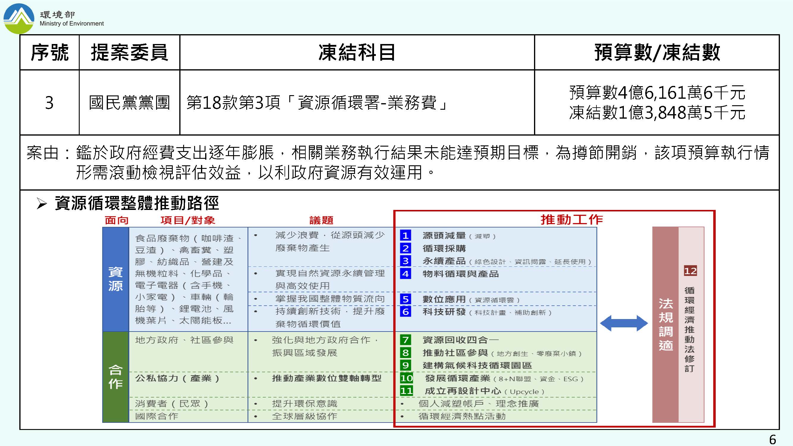 (二)環境部函,為114年度中央政府總預算決議,檢送第18款第3項新增決議(三六九)「資源循環及廢棄物管理」預算凍結百分之三十書面報告。