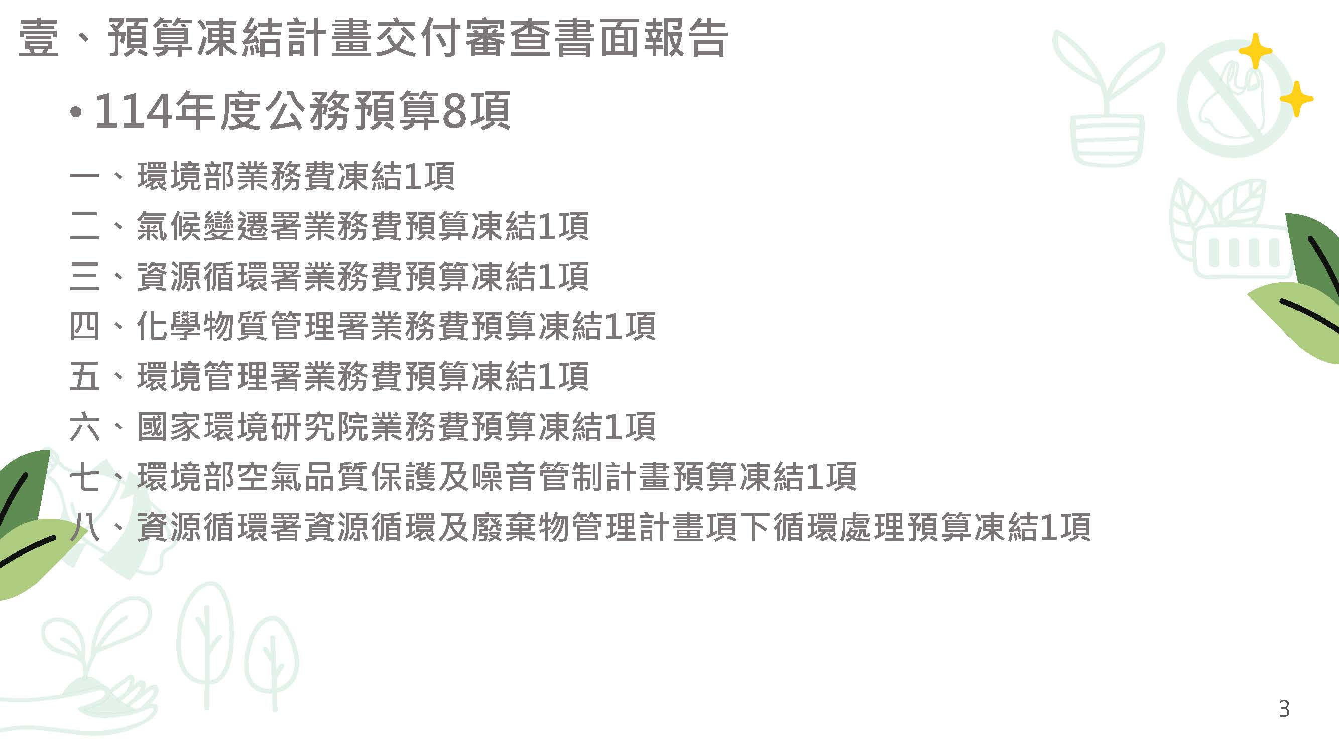 (三)環境部函,為114年度中央政府總預算決議,檢送第18款第1項決議(一)「業務費」預算凍結300萬元書面報告。