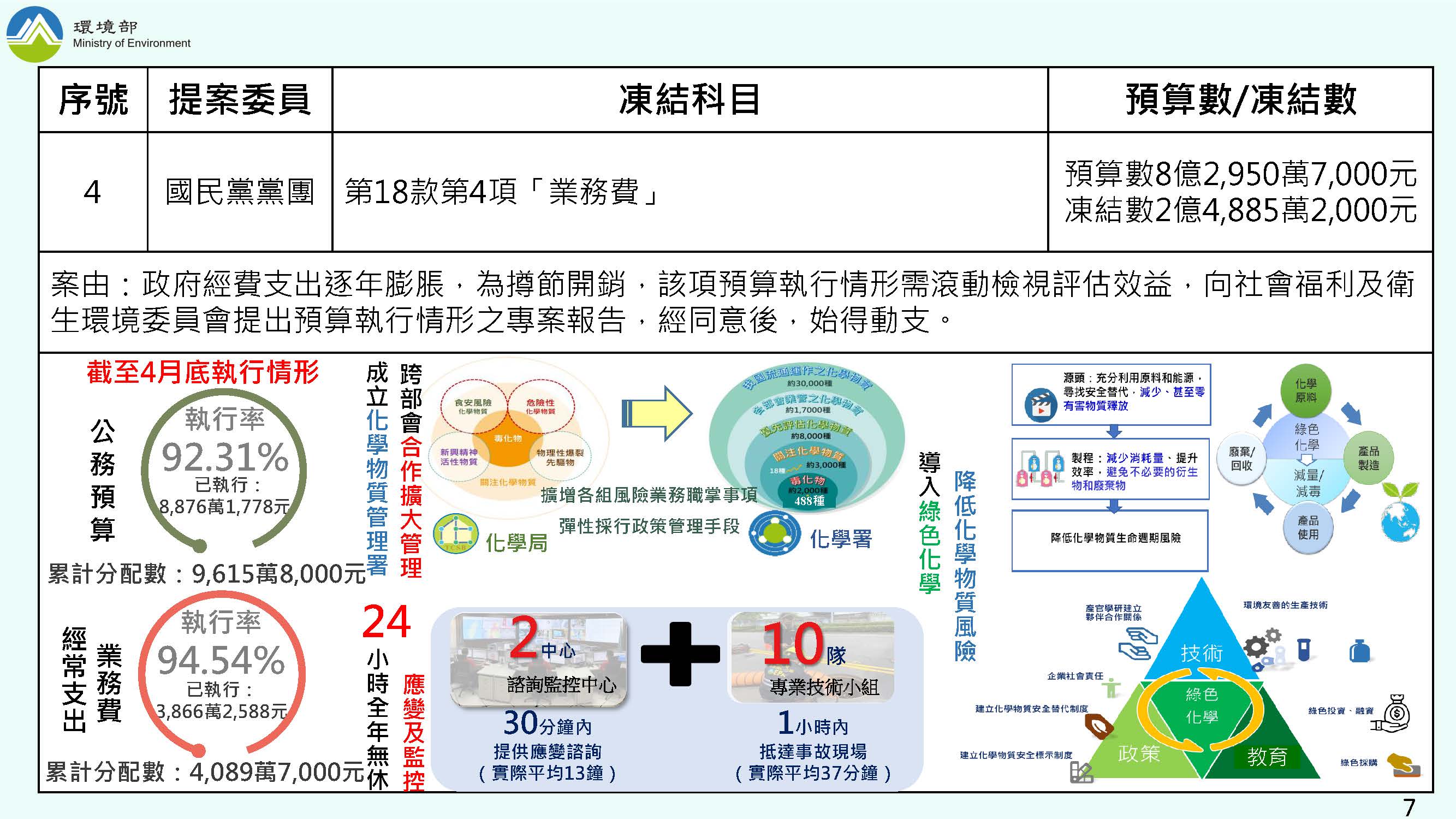 (七十三)環境部函,為114年度中央政府總預算決議,檢送第18款第4項決議(五)「化學物質管理業務」預算凍結300萬元書面報告。