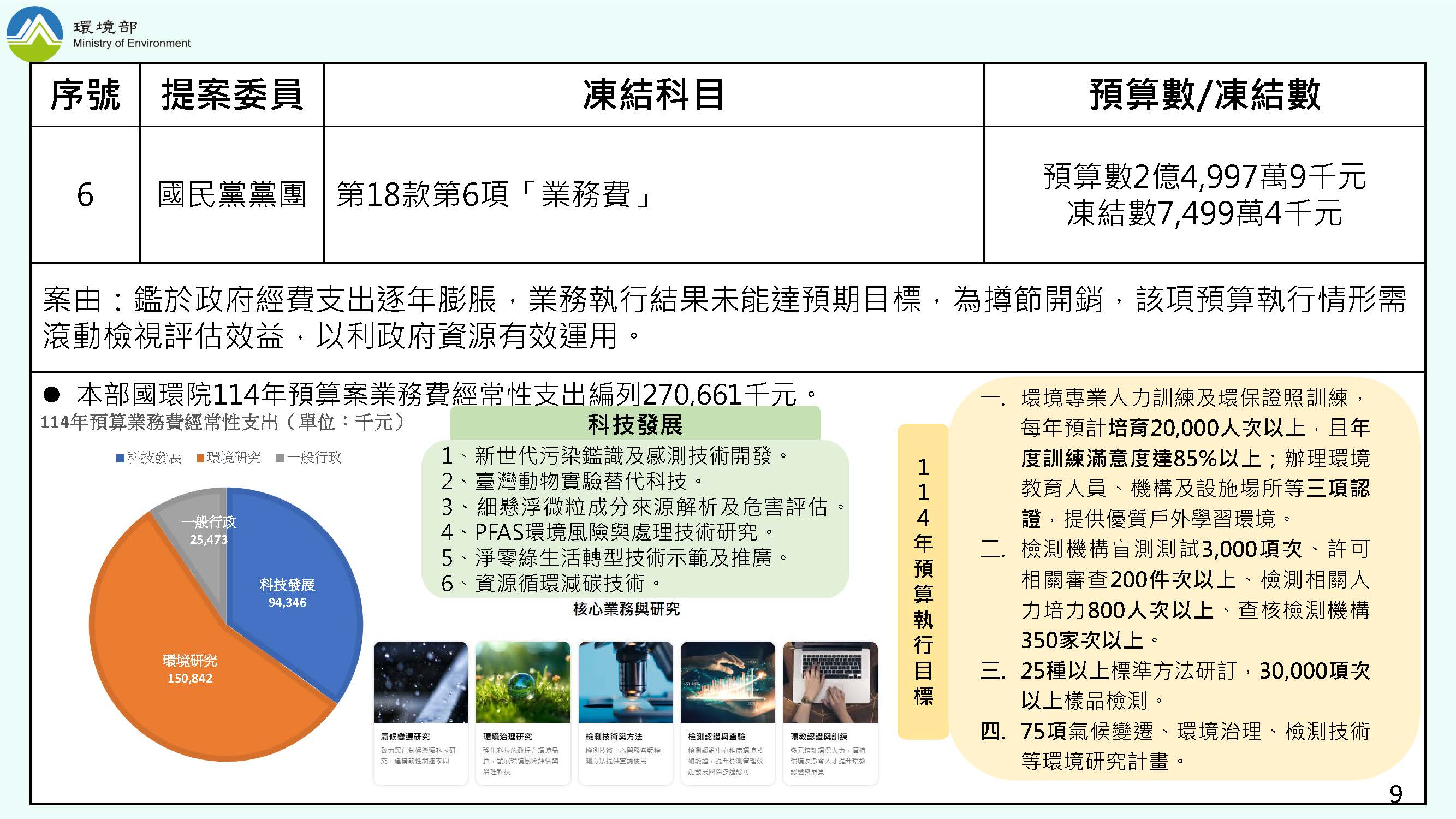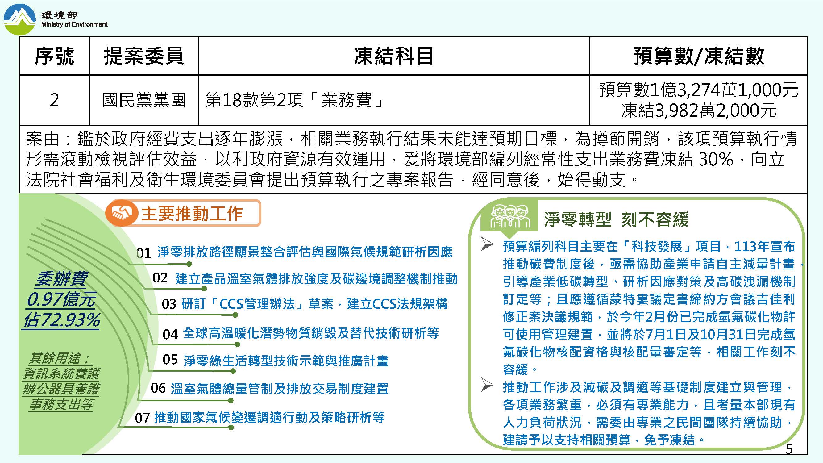 (五)環境部函,為114年度中央政府總預算決議,檢送第18款第1項決議(三)「科技發展」項下「環境科學及技術之研究」預算凍結10萬元書面報告。