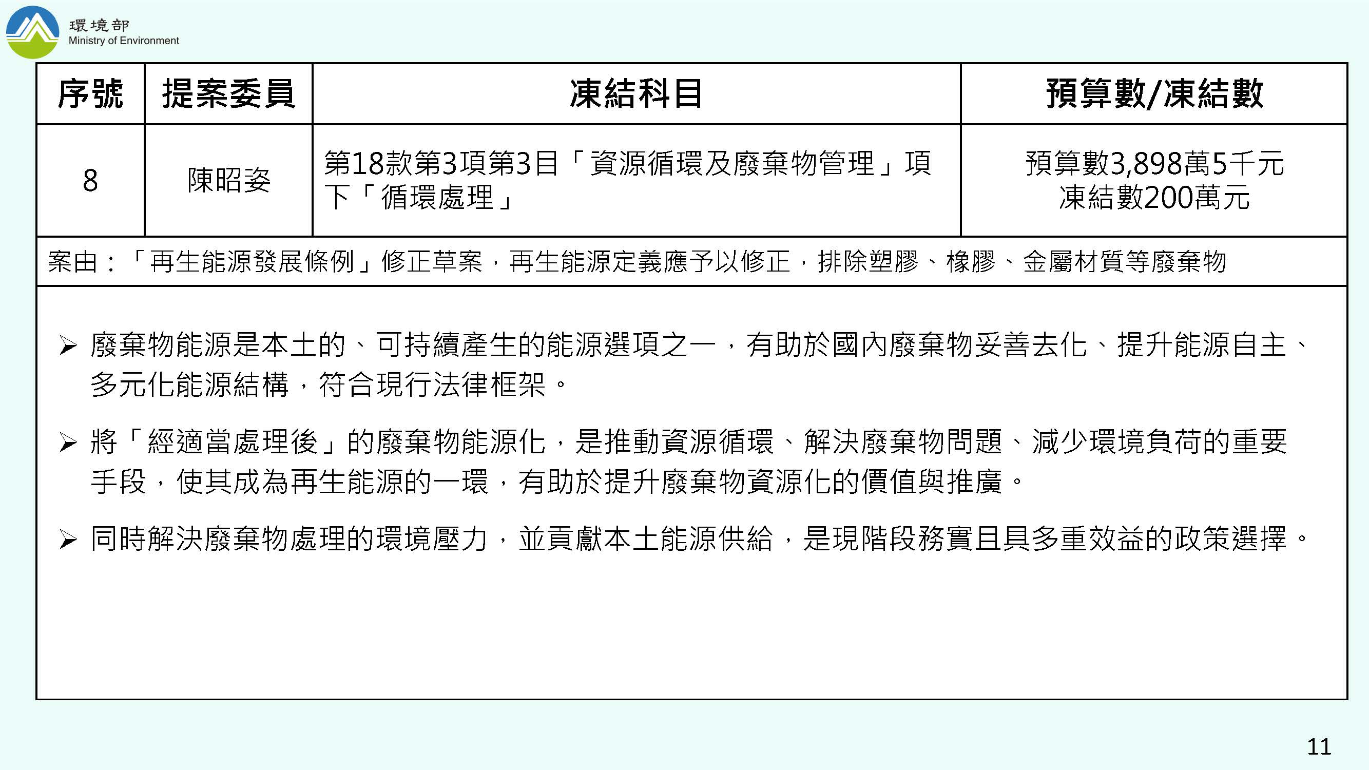 (十一)環境部函,為114年度中央政府總預算決議,檢送第18款第1項決議(九)「一般行政」項下「基本行政工作維持」之「特別費」預算凍結1/10書面報告。