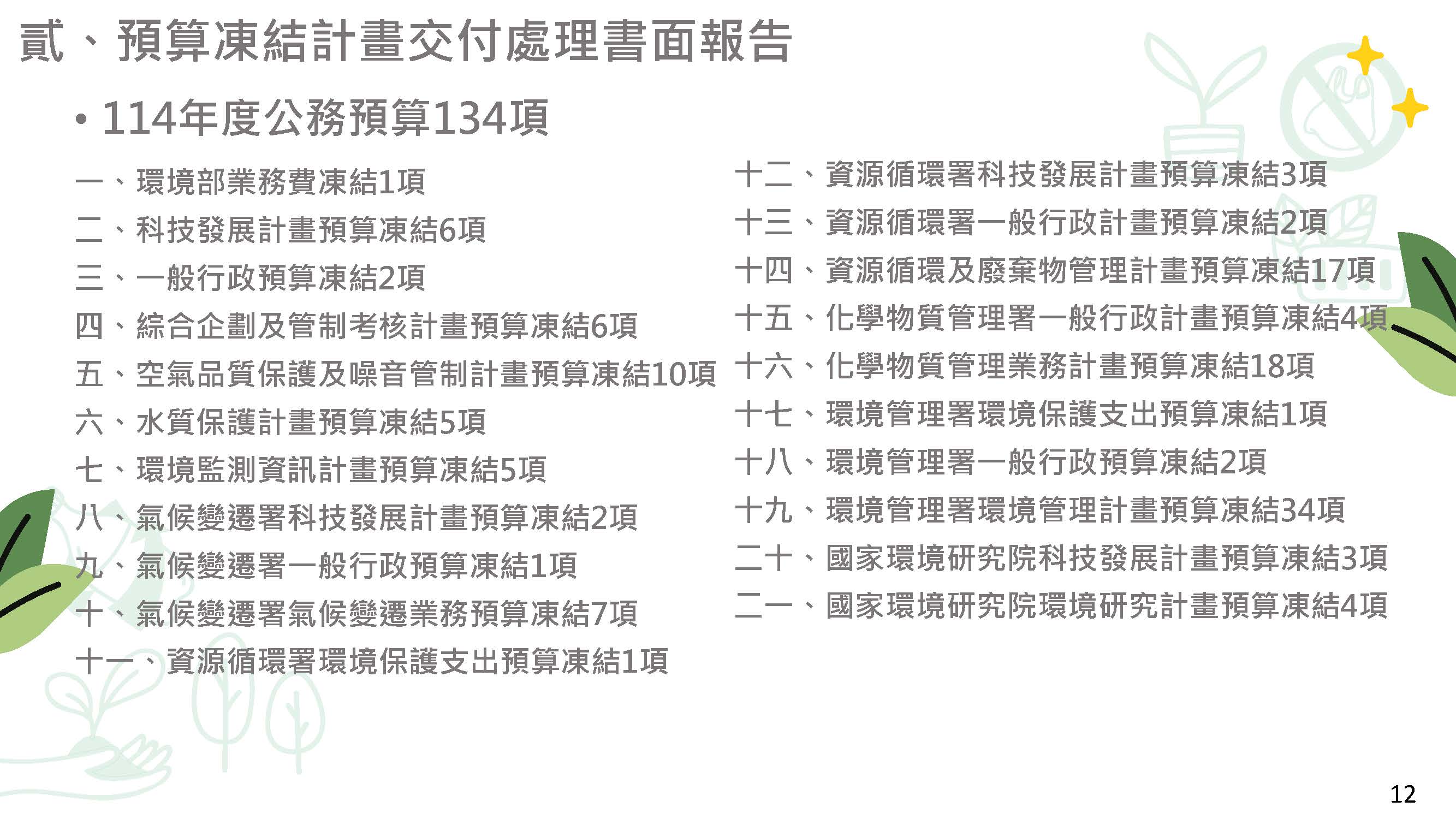 (十二)環境部函,為114年度中央政府總預算決議,檢送第18款第1項決議(十)「綜合企劃及管制考核」預算凍結300萬元書面報告。