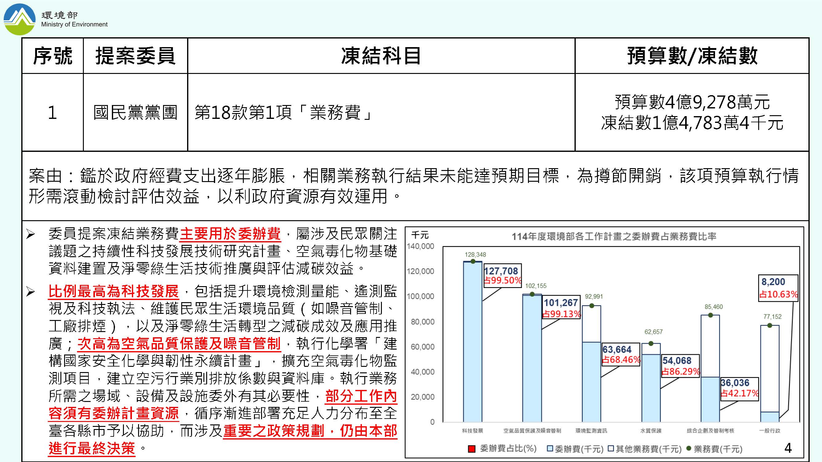 (四)環境部函,為114年度中央政府總預算決議,檢送第18款第1項決議(二)「科技發展」項下「業務費」預算凍結300萬元書面報告。