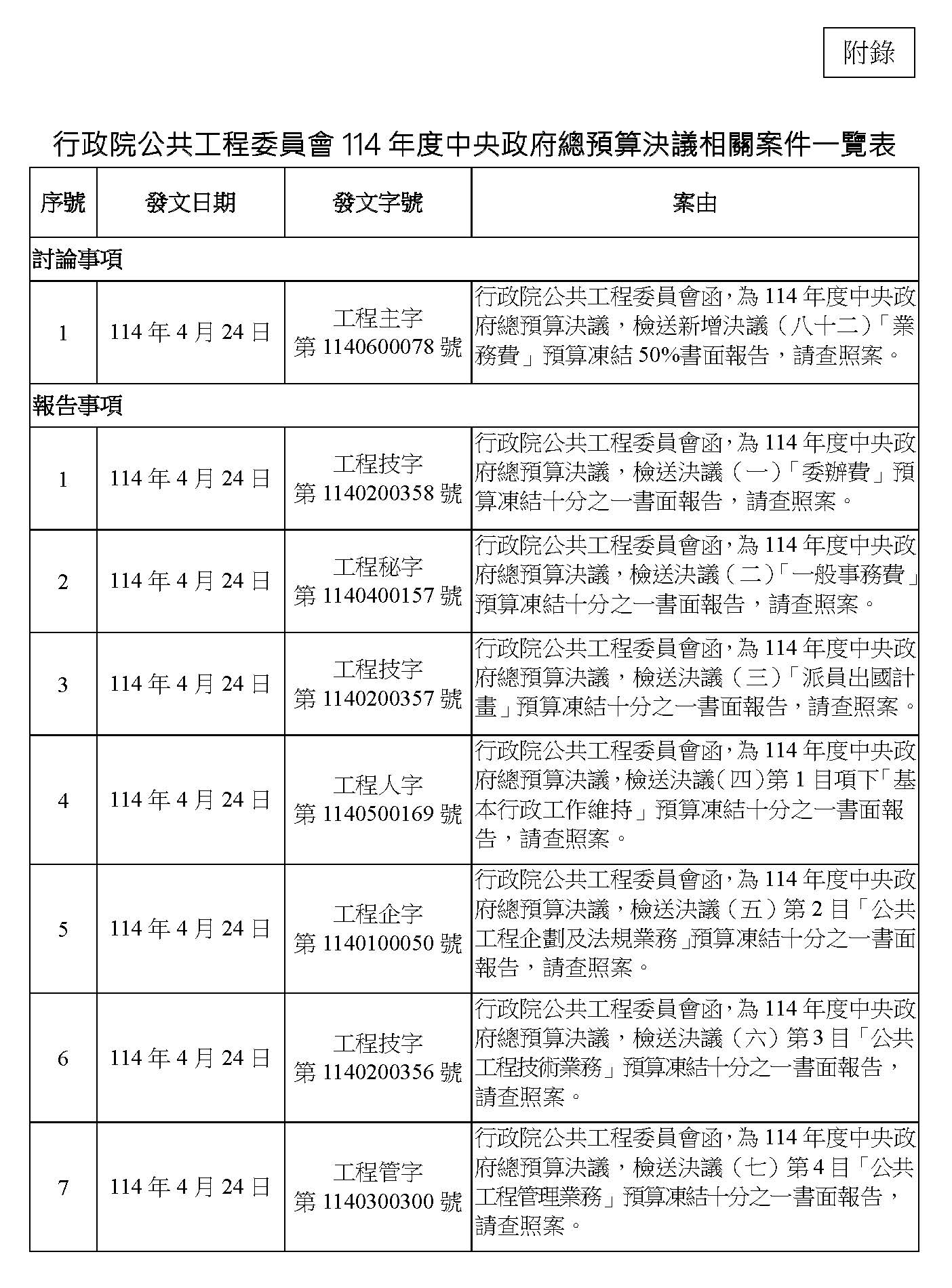 四、處理114年度中央政府總預算關於行政院公共工程委員會預算凍結案計7案: