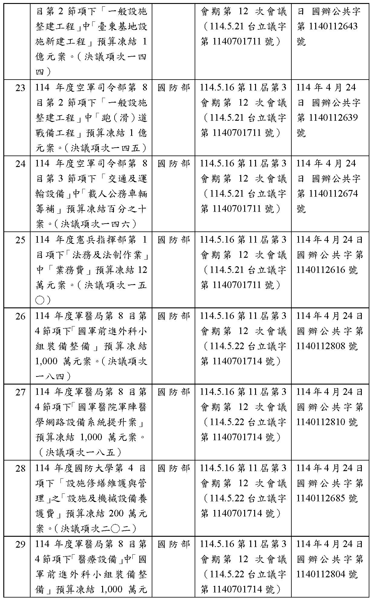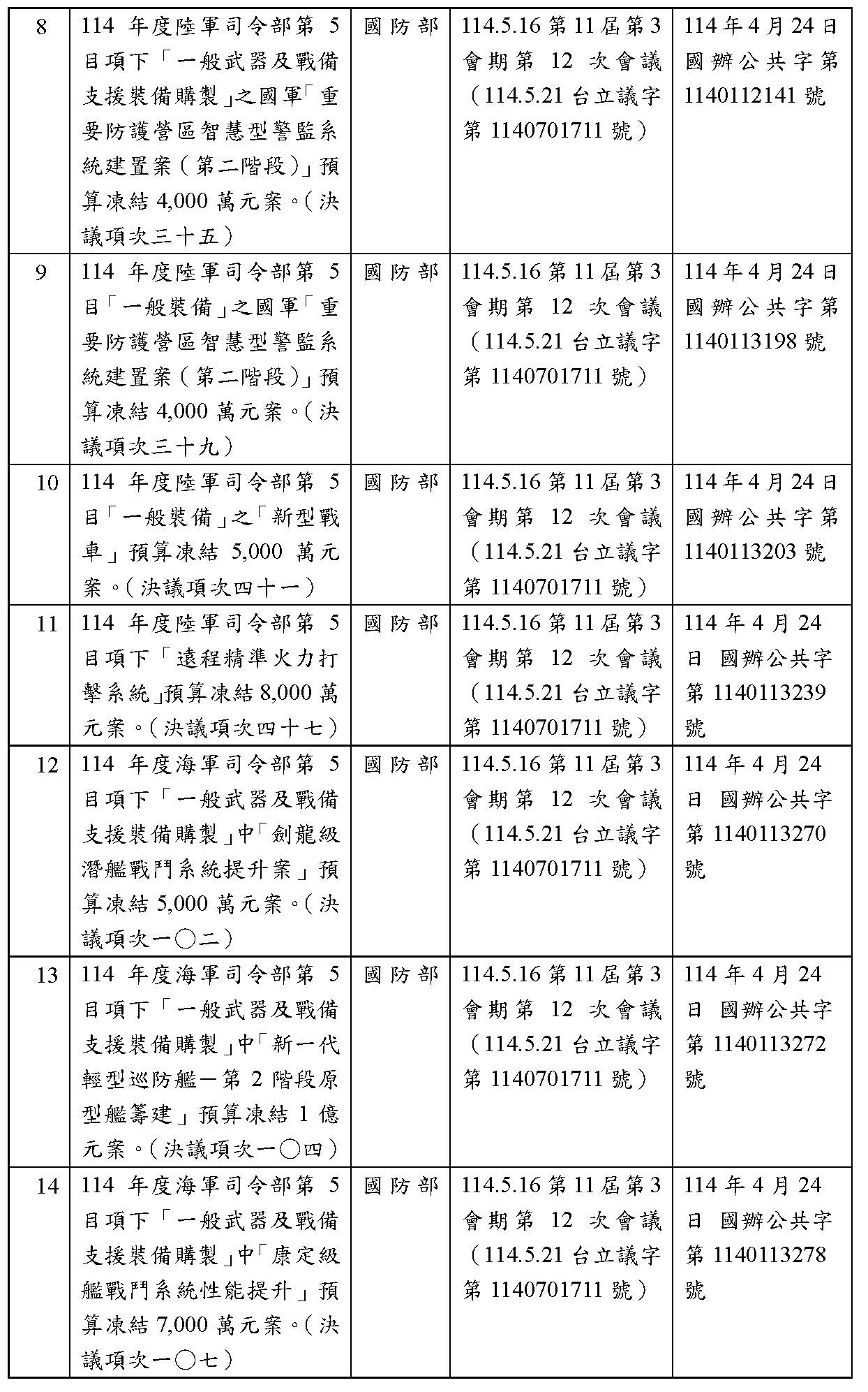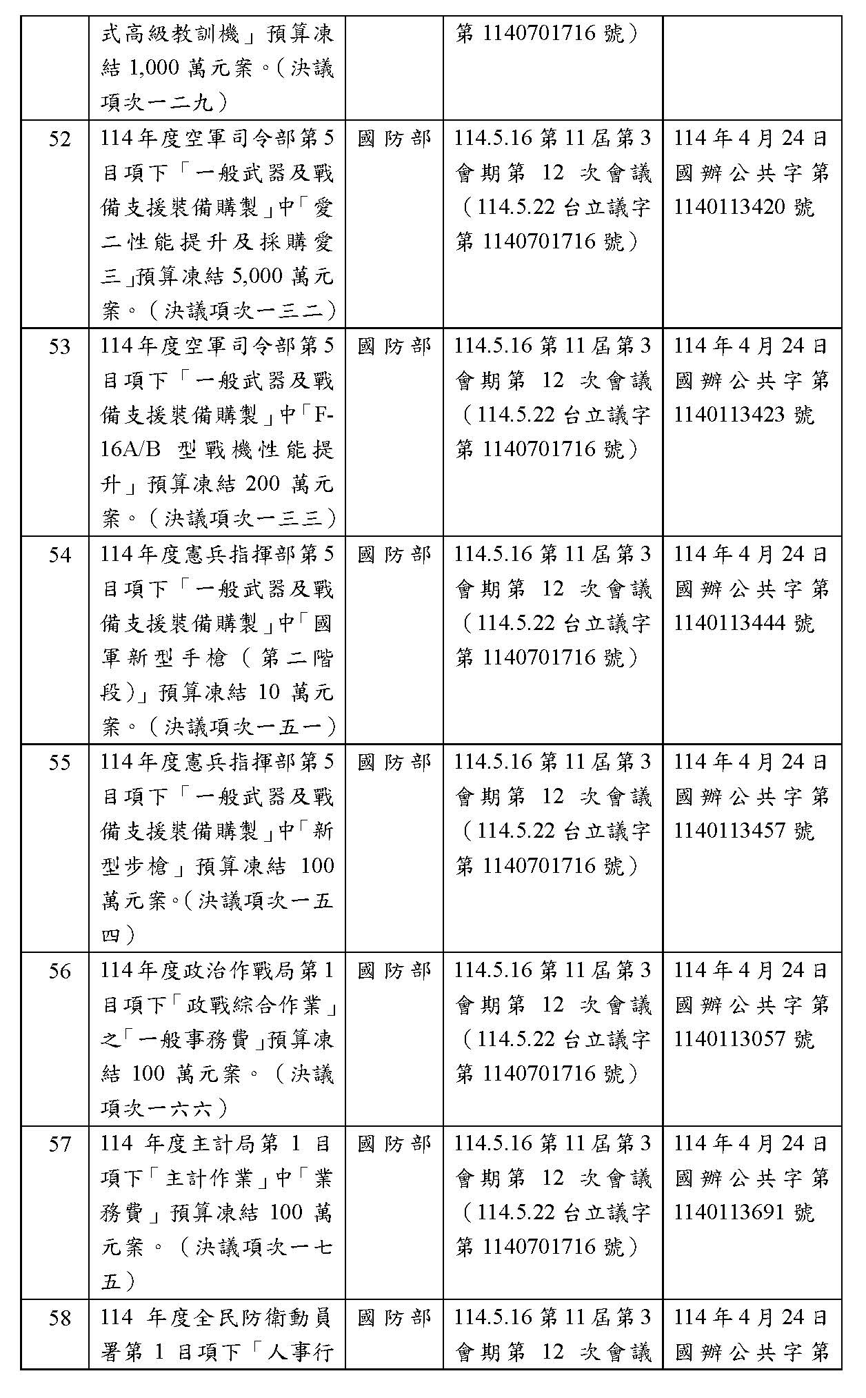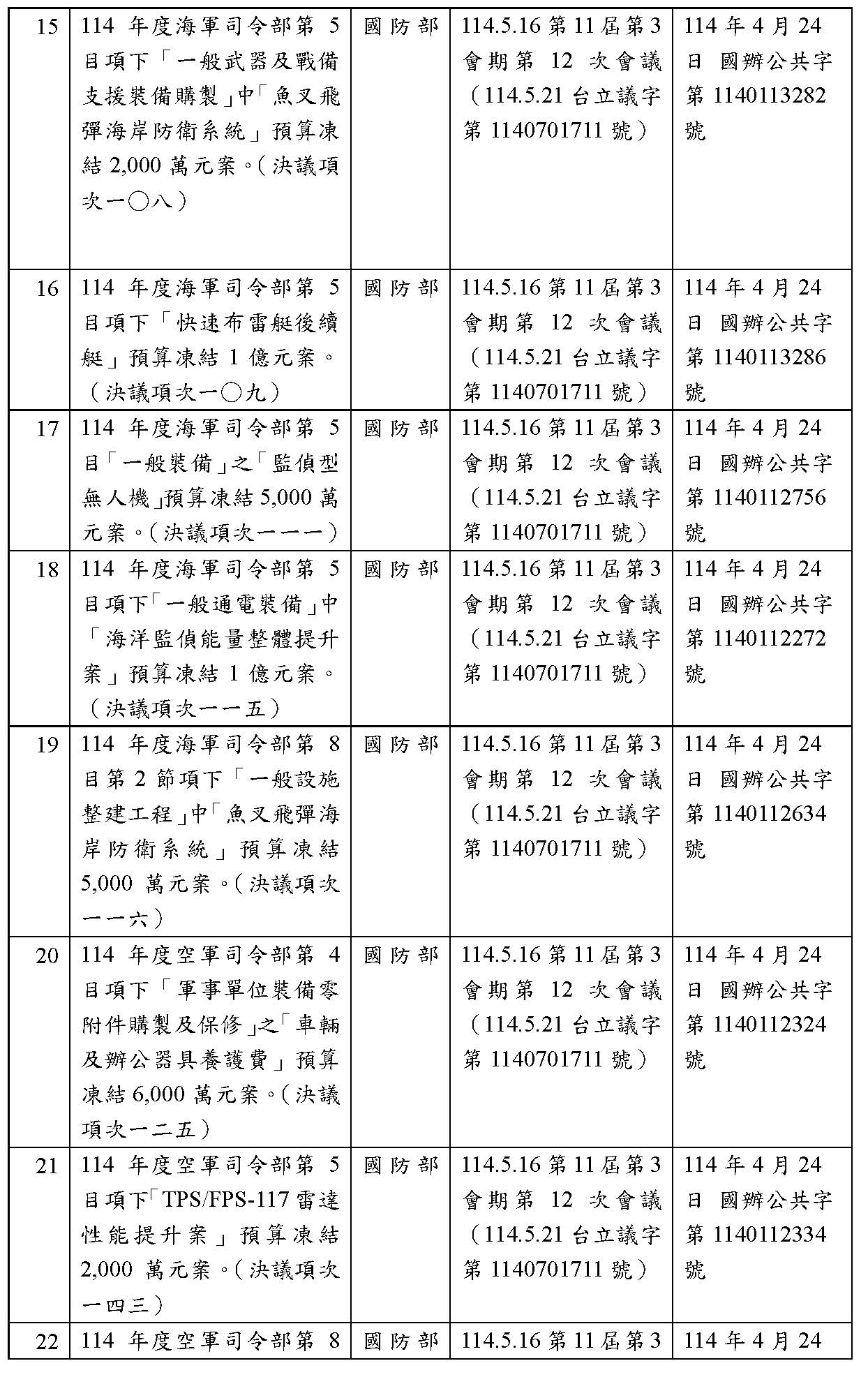 處理院會交付114年度中央政府總預算決議,國防部主管預算凍結案: