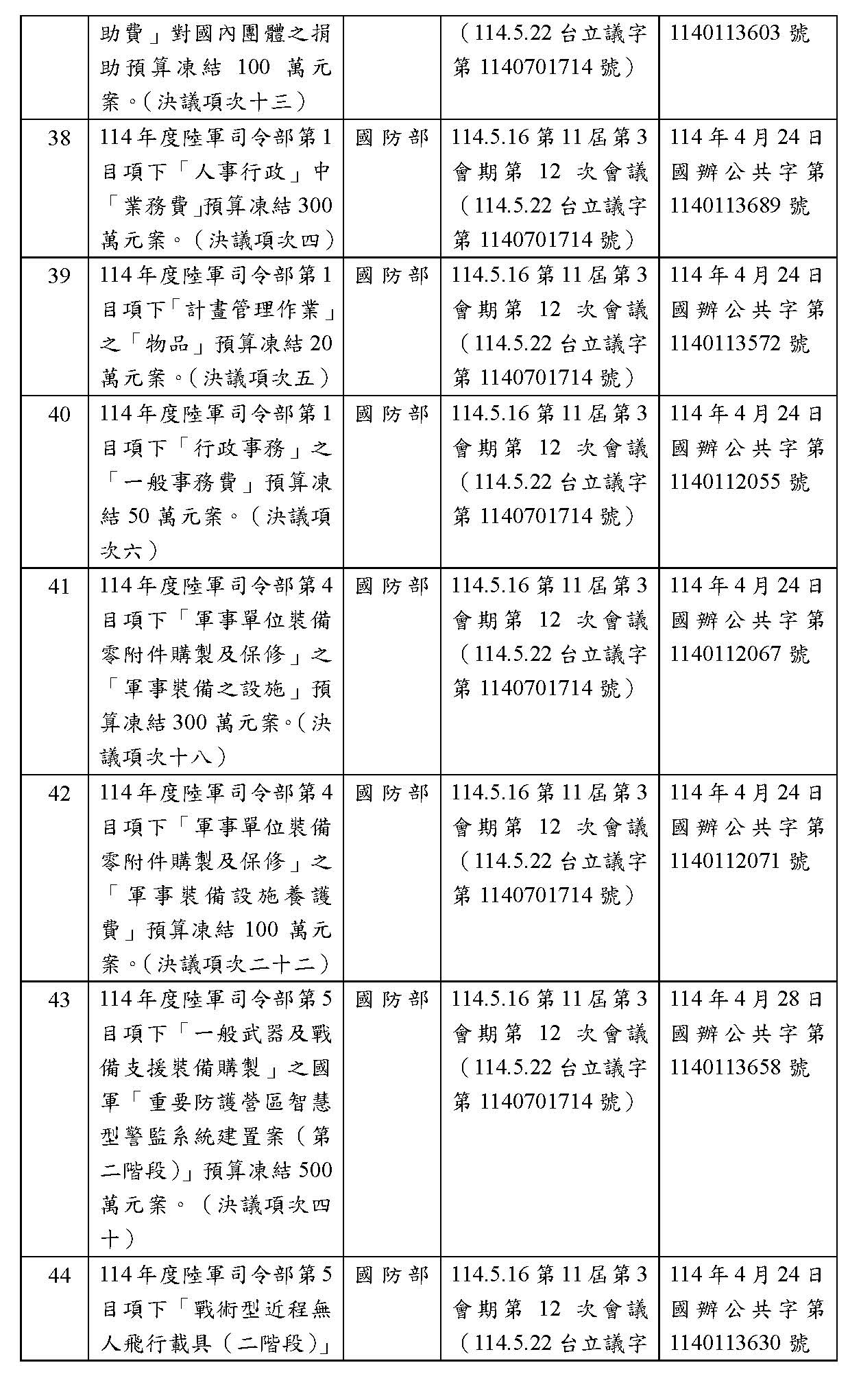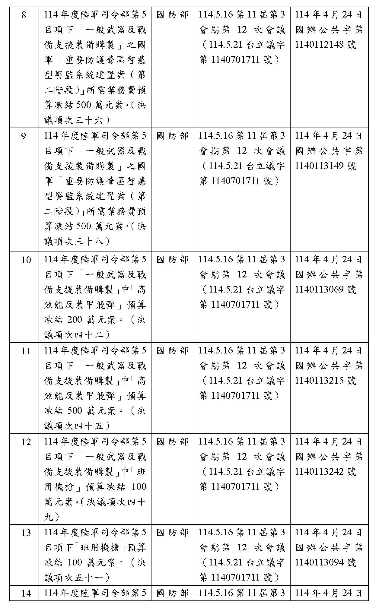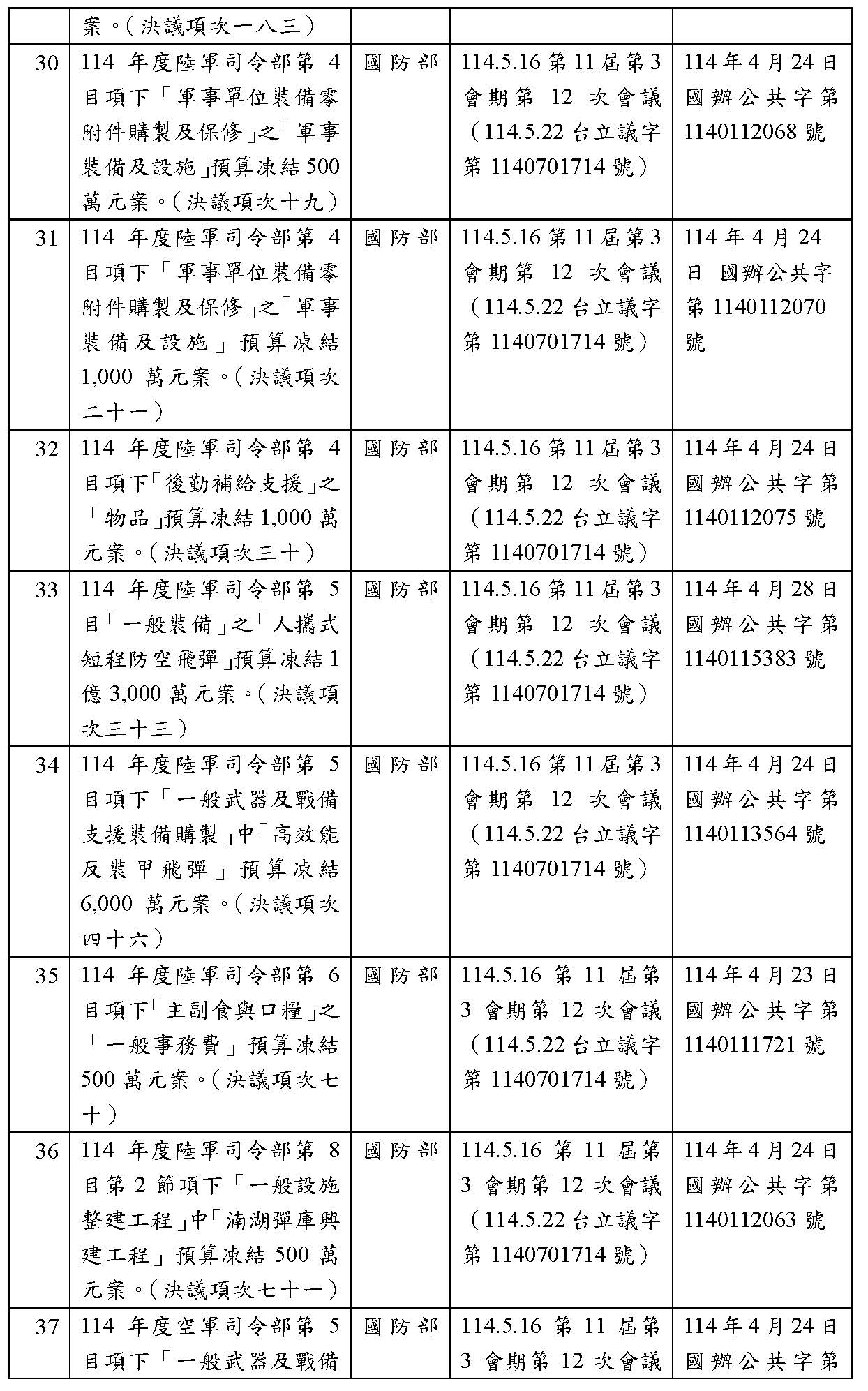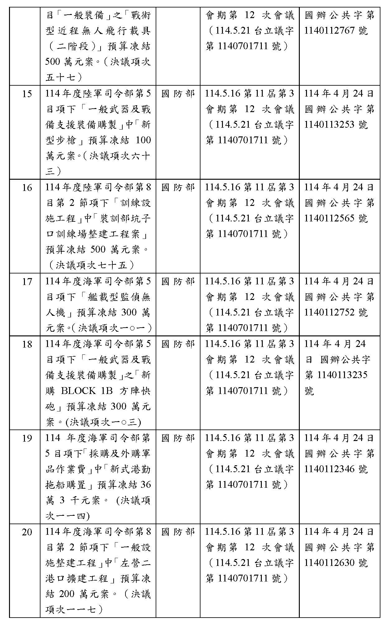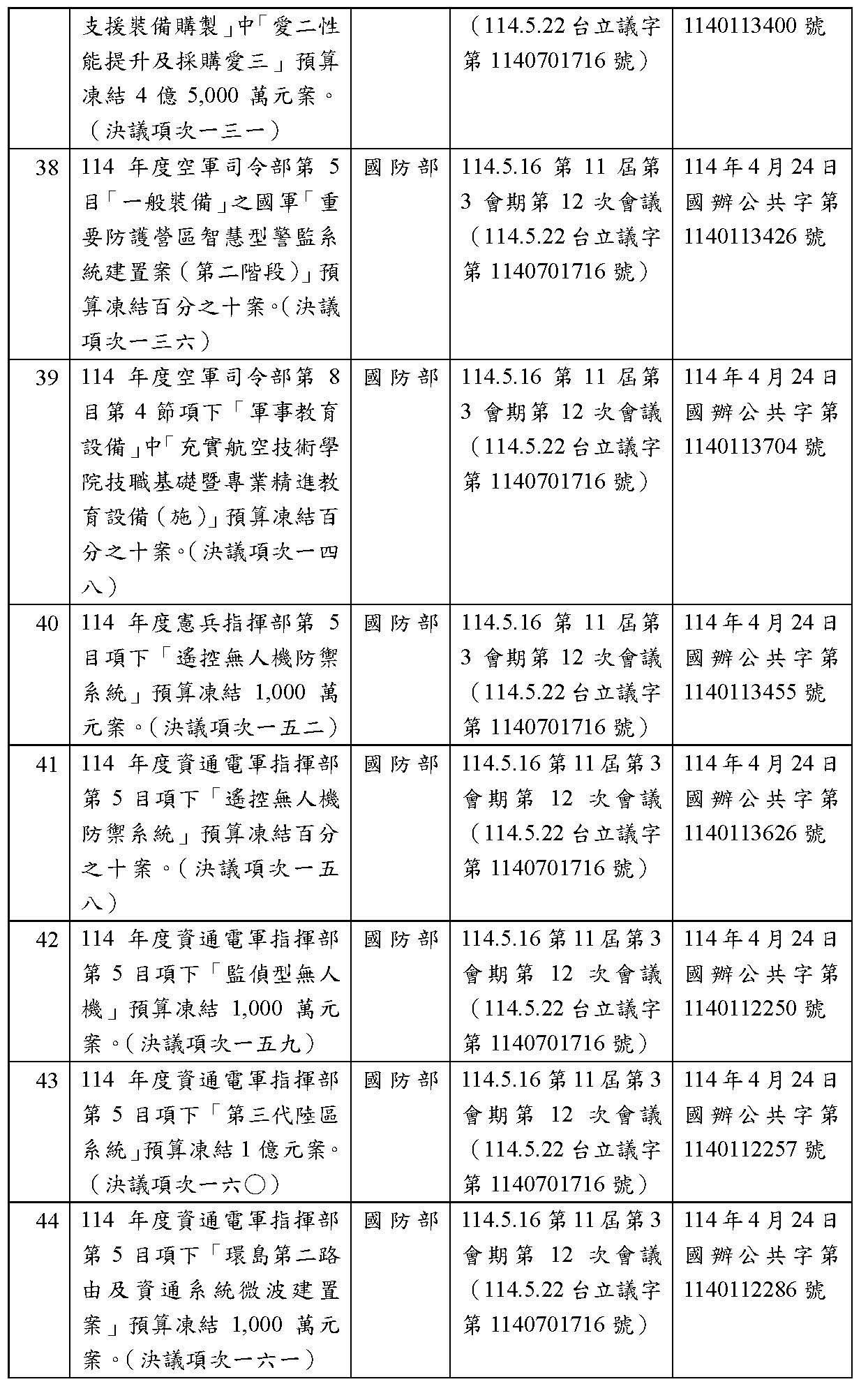 處理院會交付114年度中央政府總預算決議,國防部主管預算凍結案: