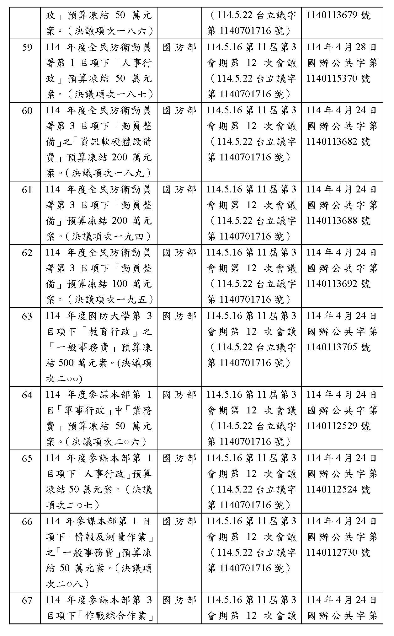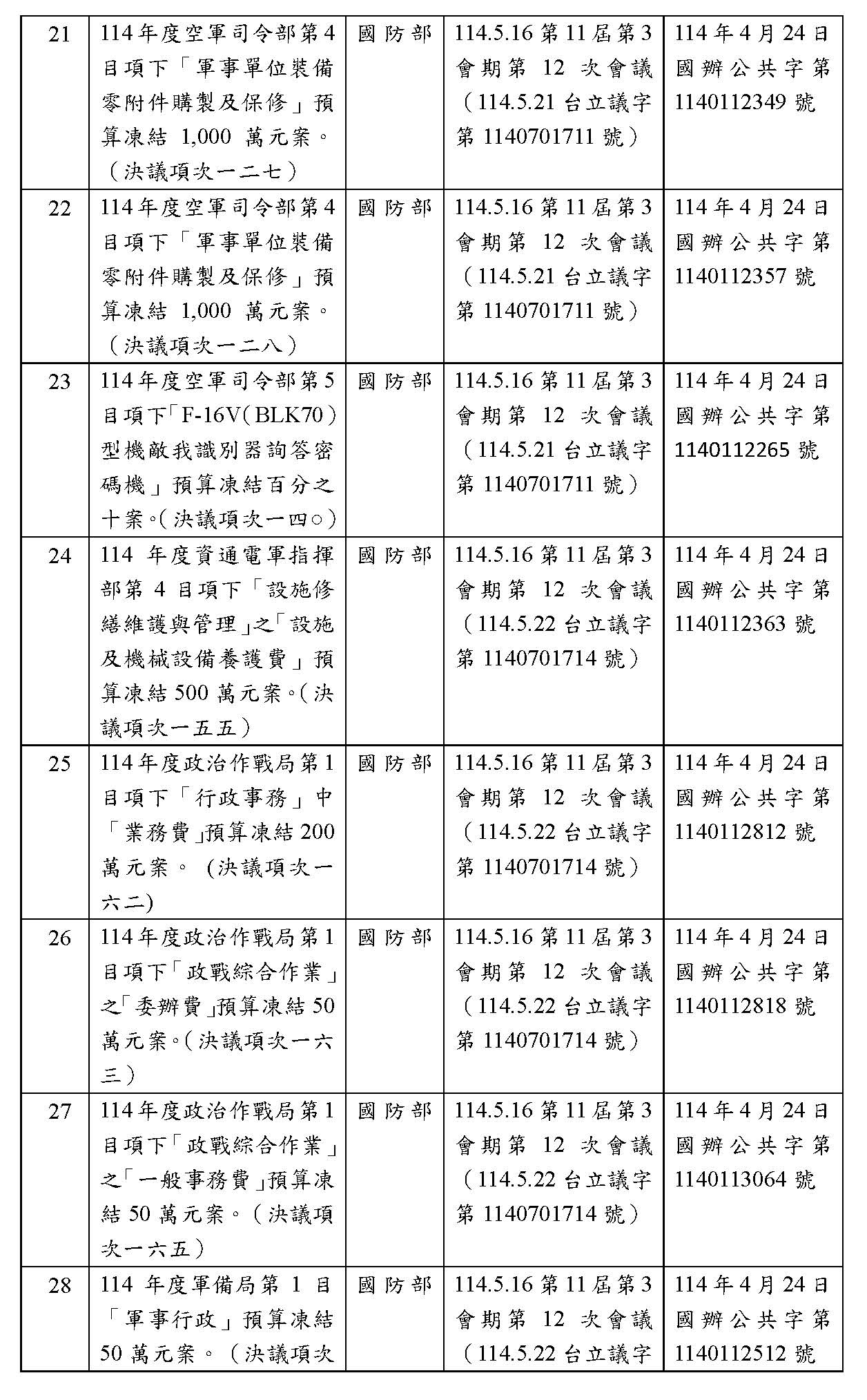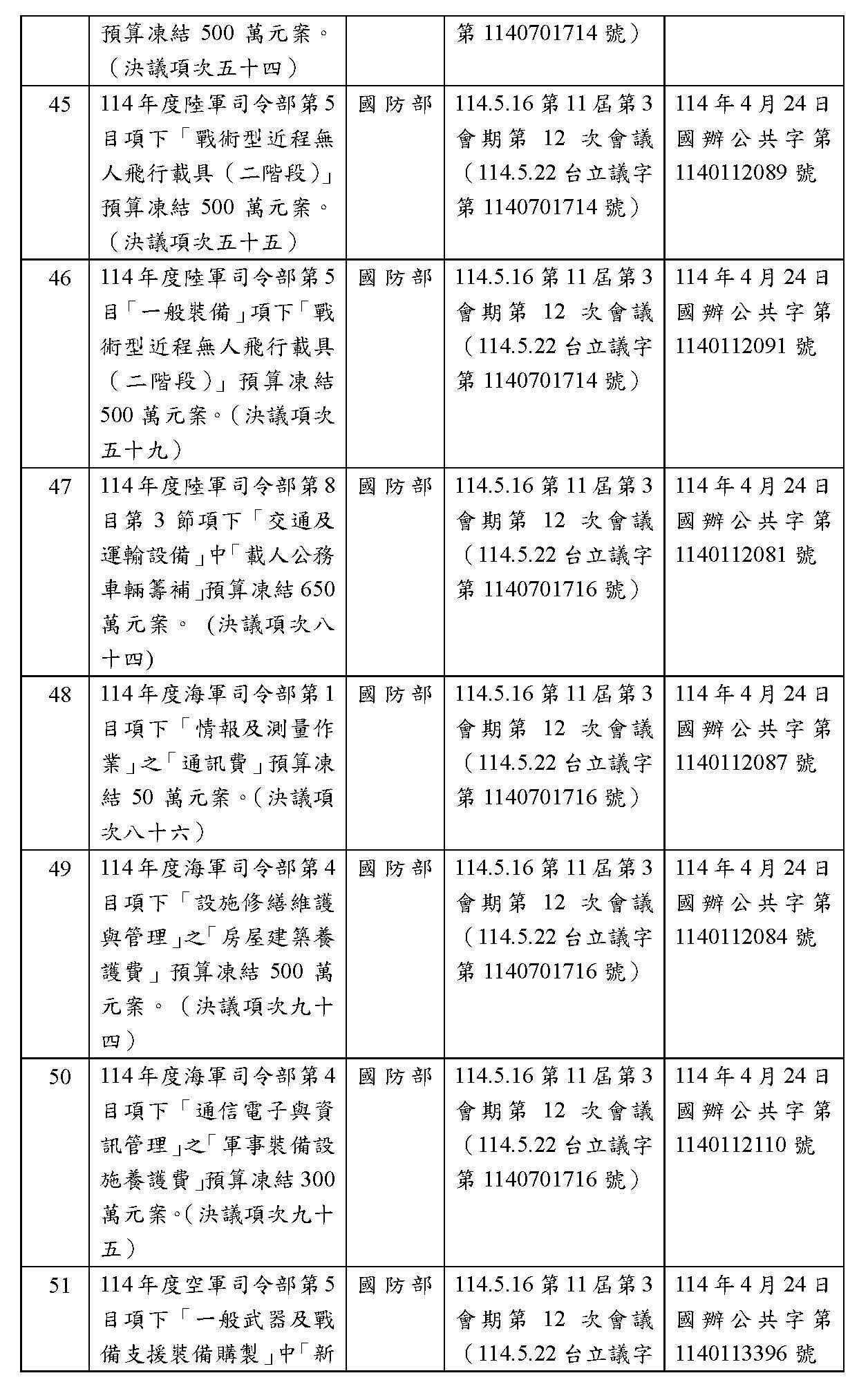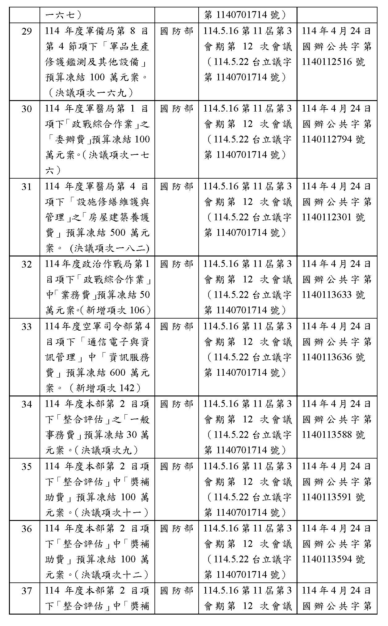 處理院會交付114年度中央政府總預算決議,國防部主管預算凍結案: