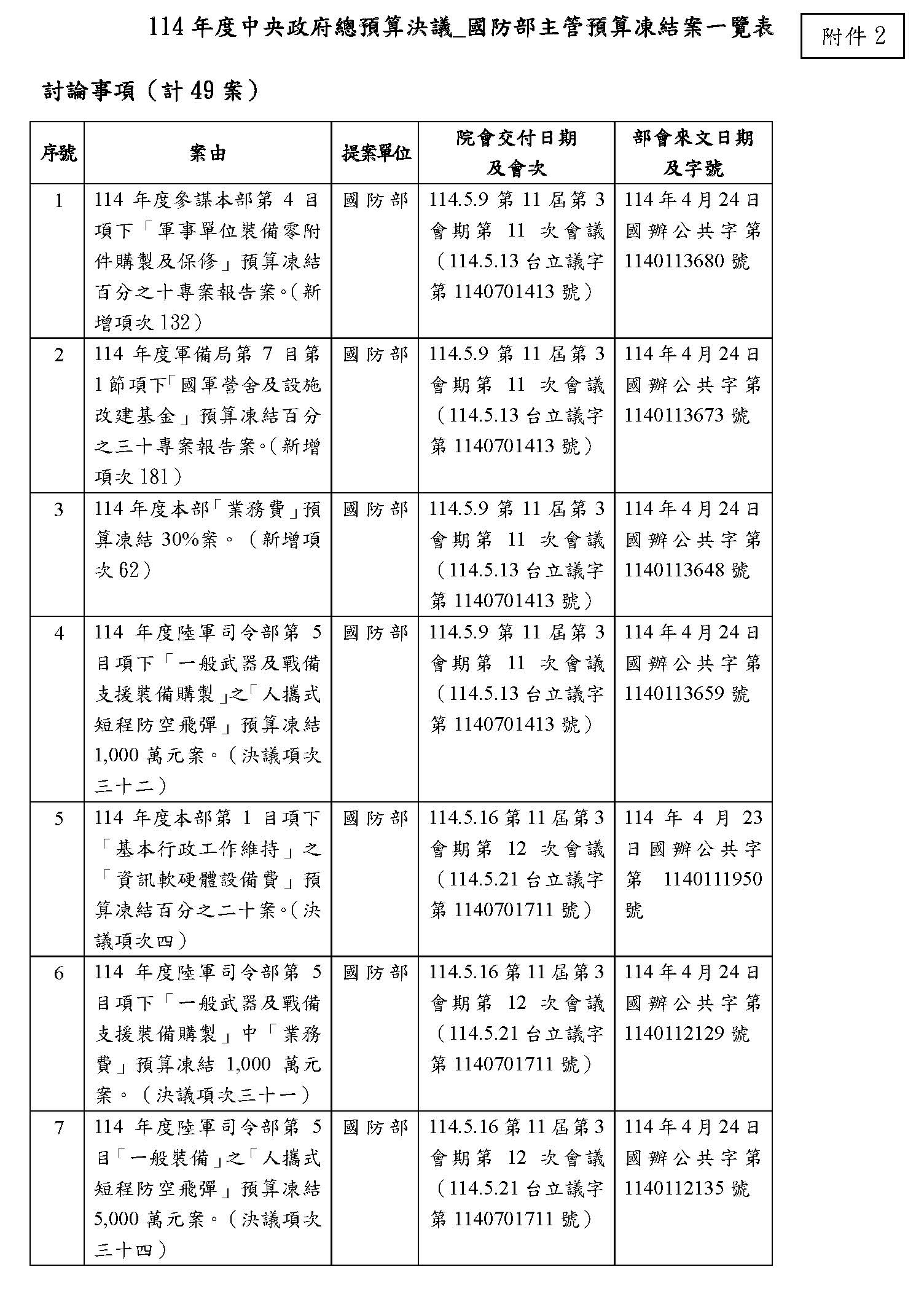 三、國防部主管預算凍結案等47案。(詳如附件2,第3案至第49案)