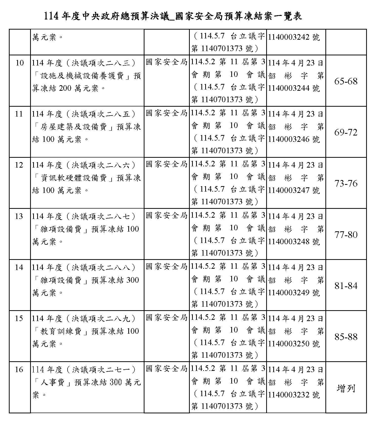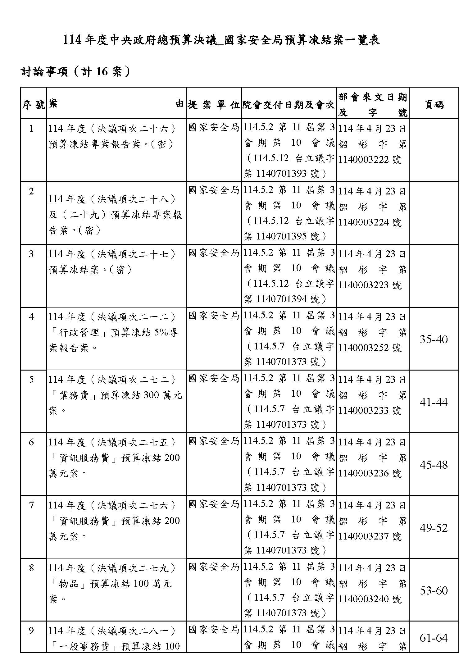 處理院會交付114年度中央政府總預算決議,國家安全局預算凍結案: