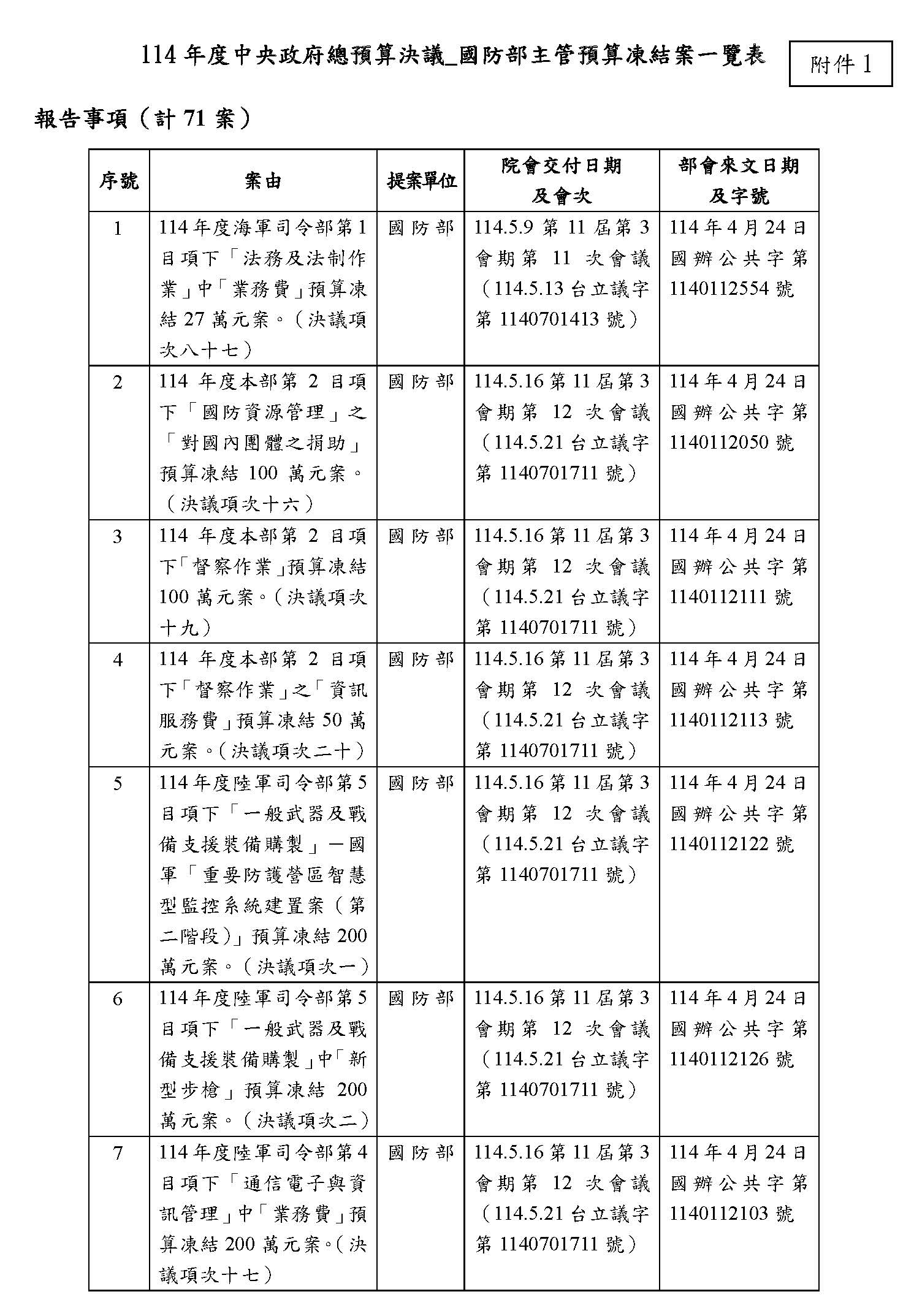 二、處理院會交付114年度中央政府總預算決議,國防部主管預算提出書面報告後始得動支等71案。(詳如附件1)