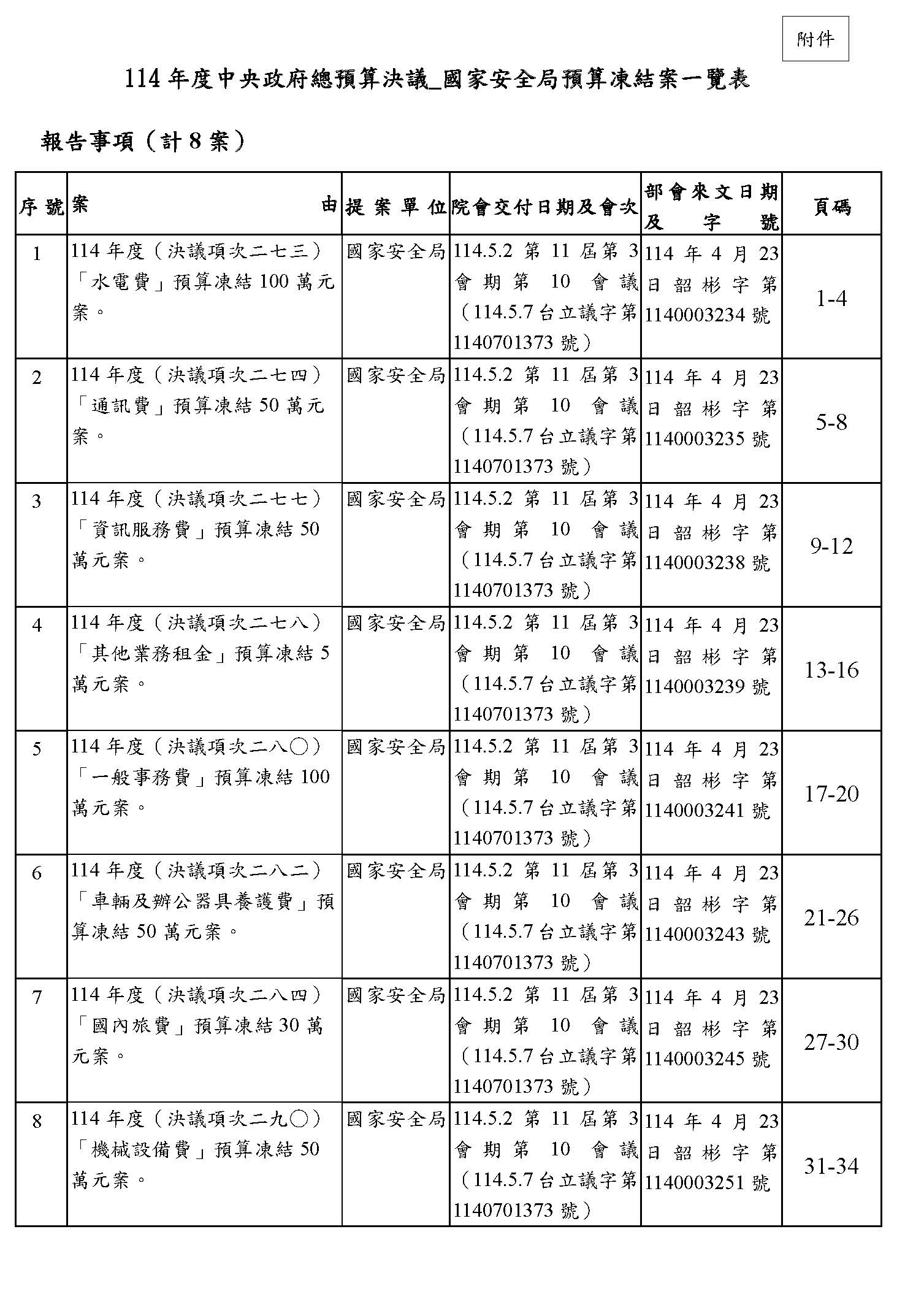 二、處理院會交付114年度中央政府總預算決議,國家安全局預算提出書面報告後始得動支等8案。(詳如附件)