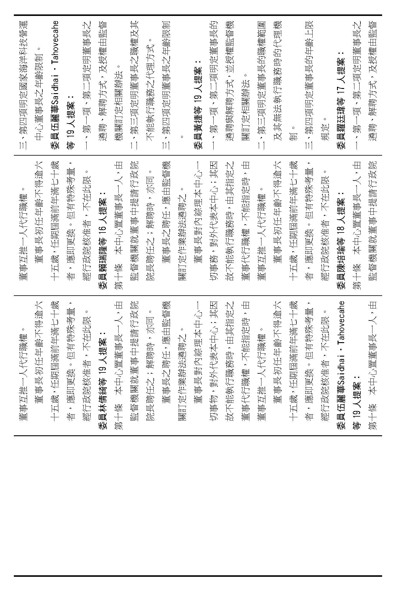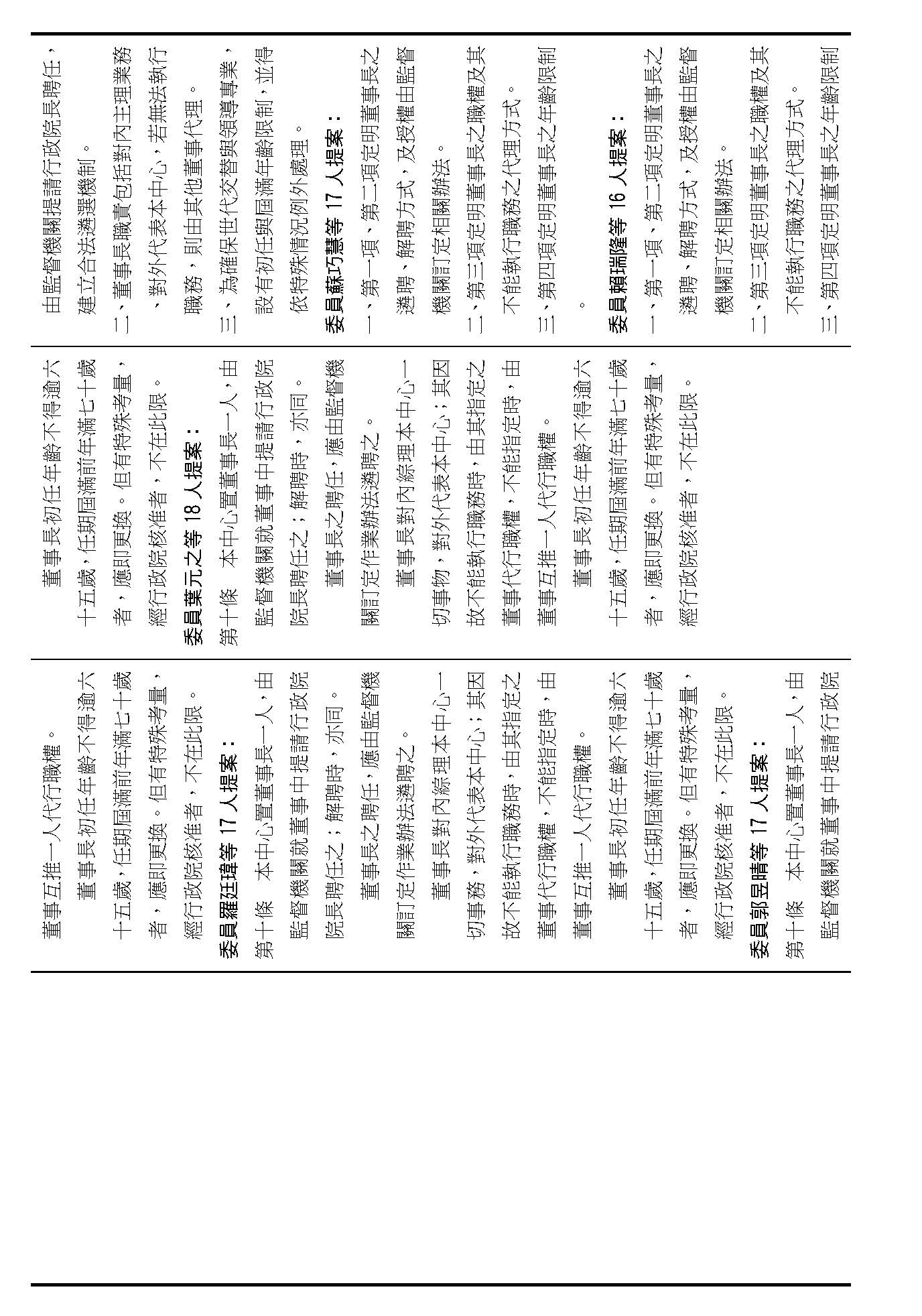 第十條是中心董事長的聘任、職權、代理方式及年齡的限制,在場委員有沒有什麼意見?(無)如果沒有的話,我們就按照行政院的提案通過。