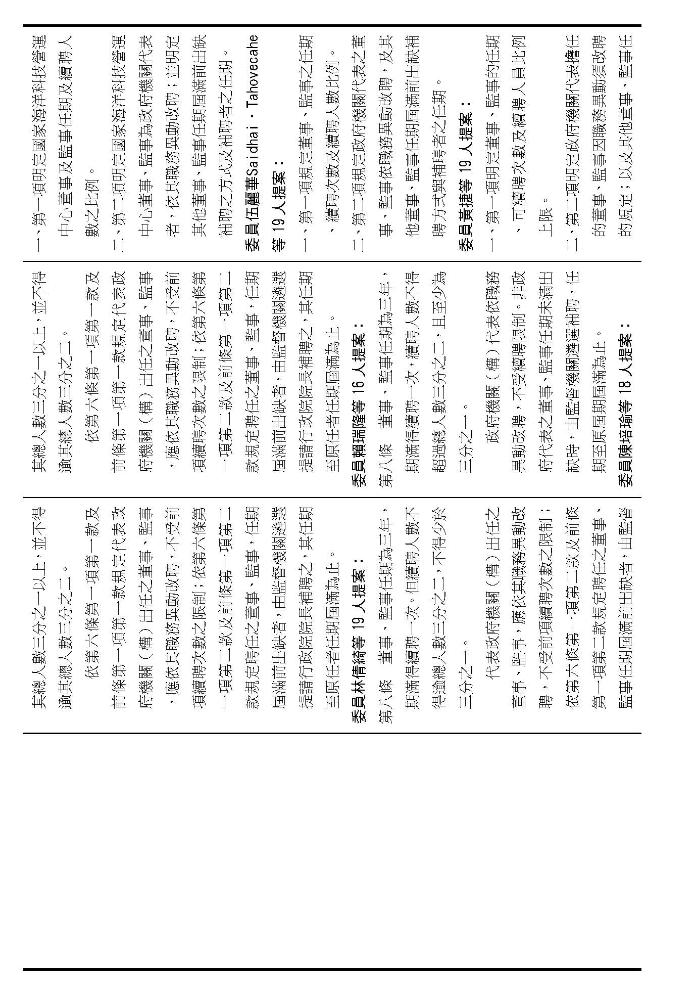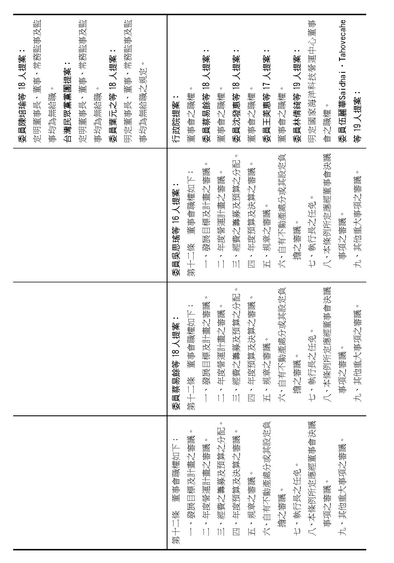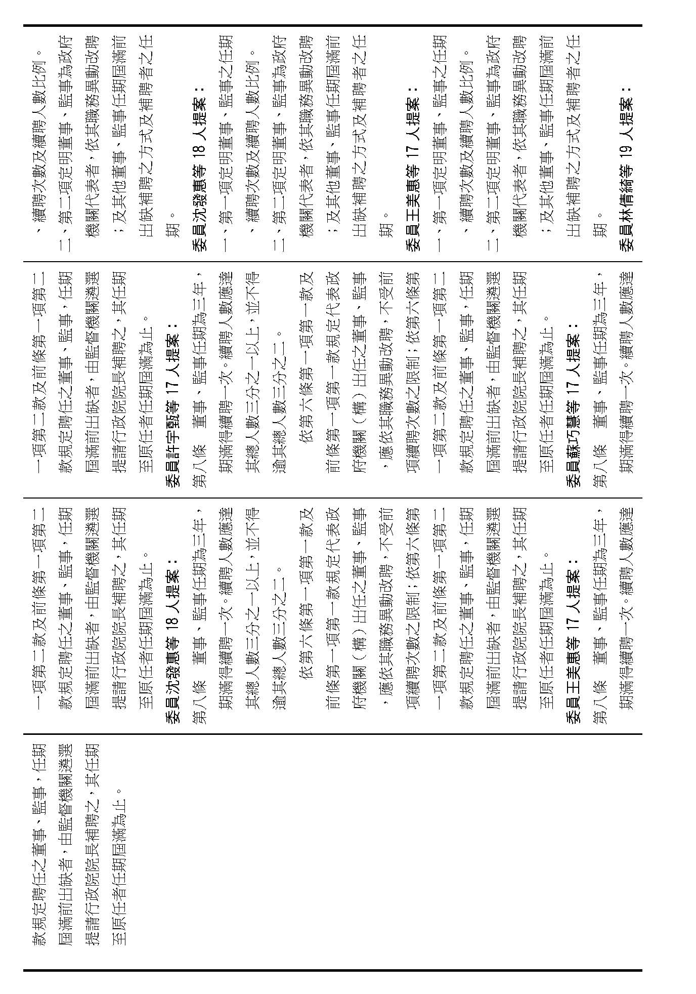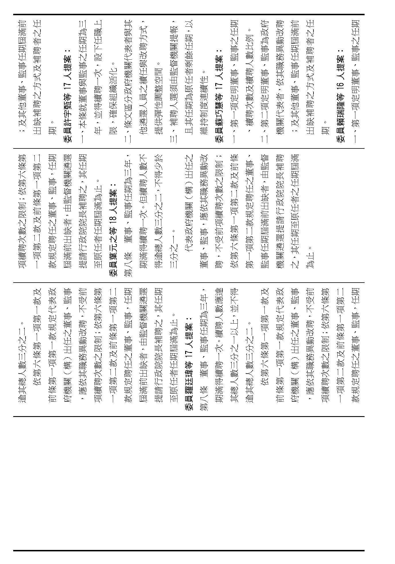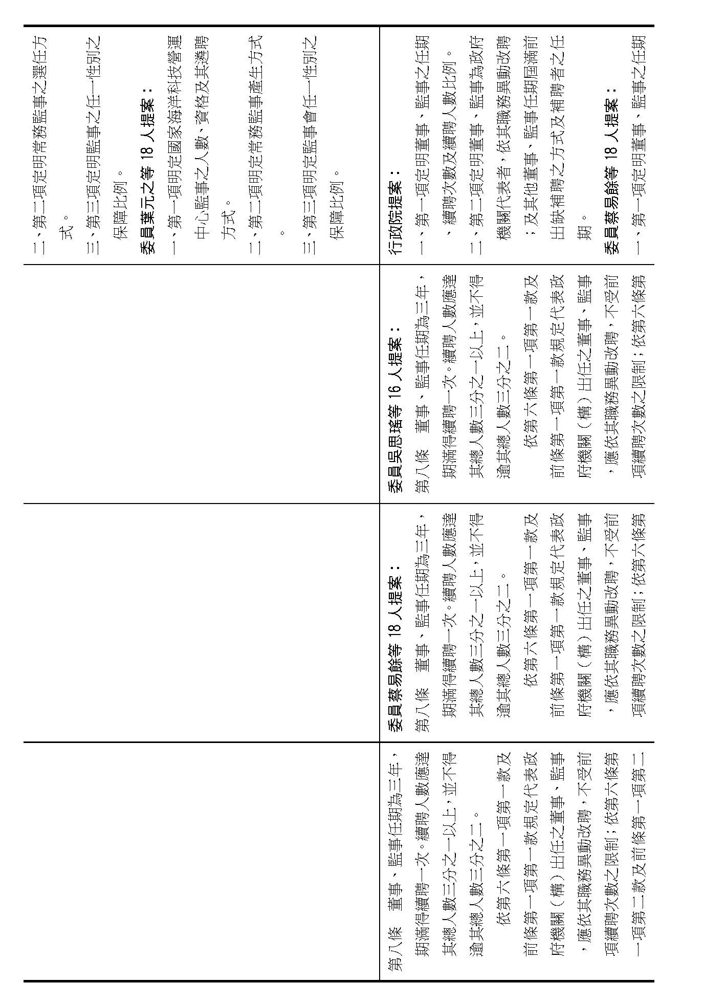 第八條是董事及監事的任期、解聘還有補聘的方式,這條提案的內容都大同小異,如果在場委員沒有其他的意見的話,我們就按照行政院的提案通過。