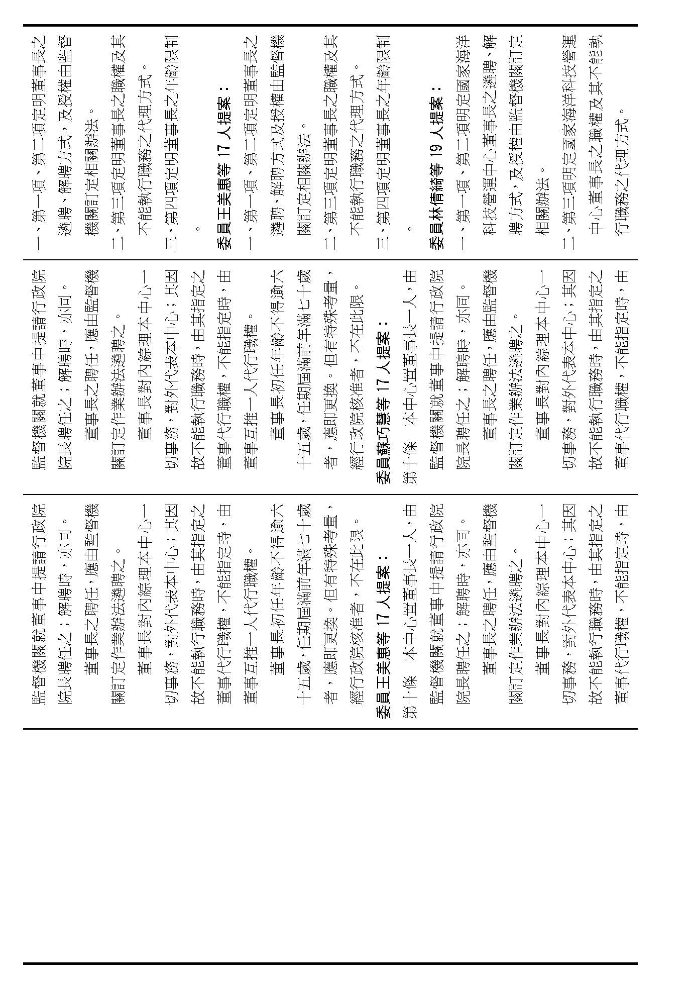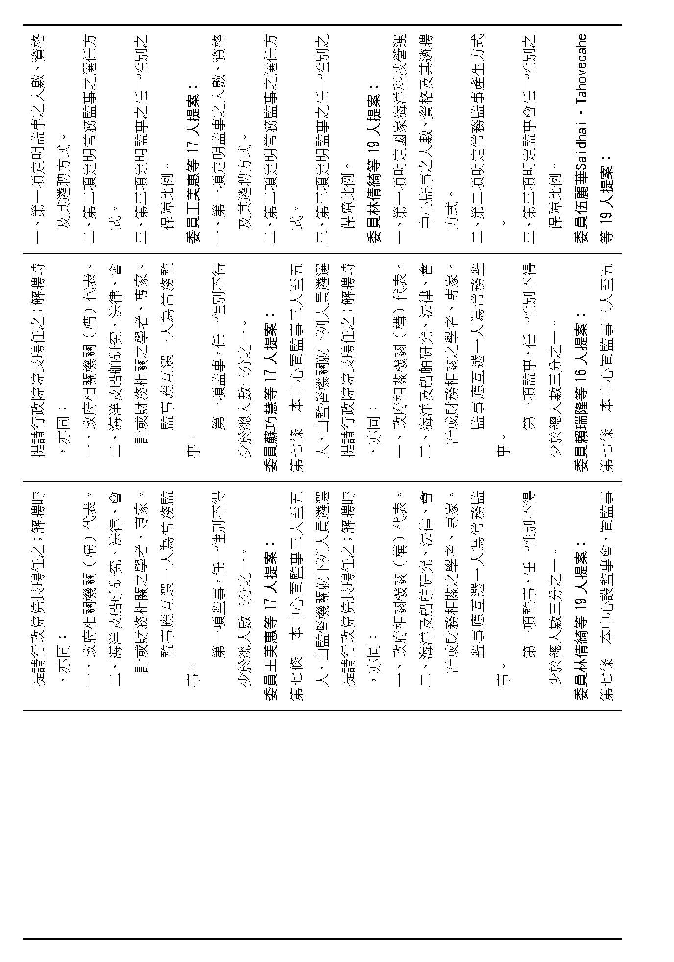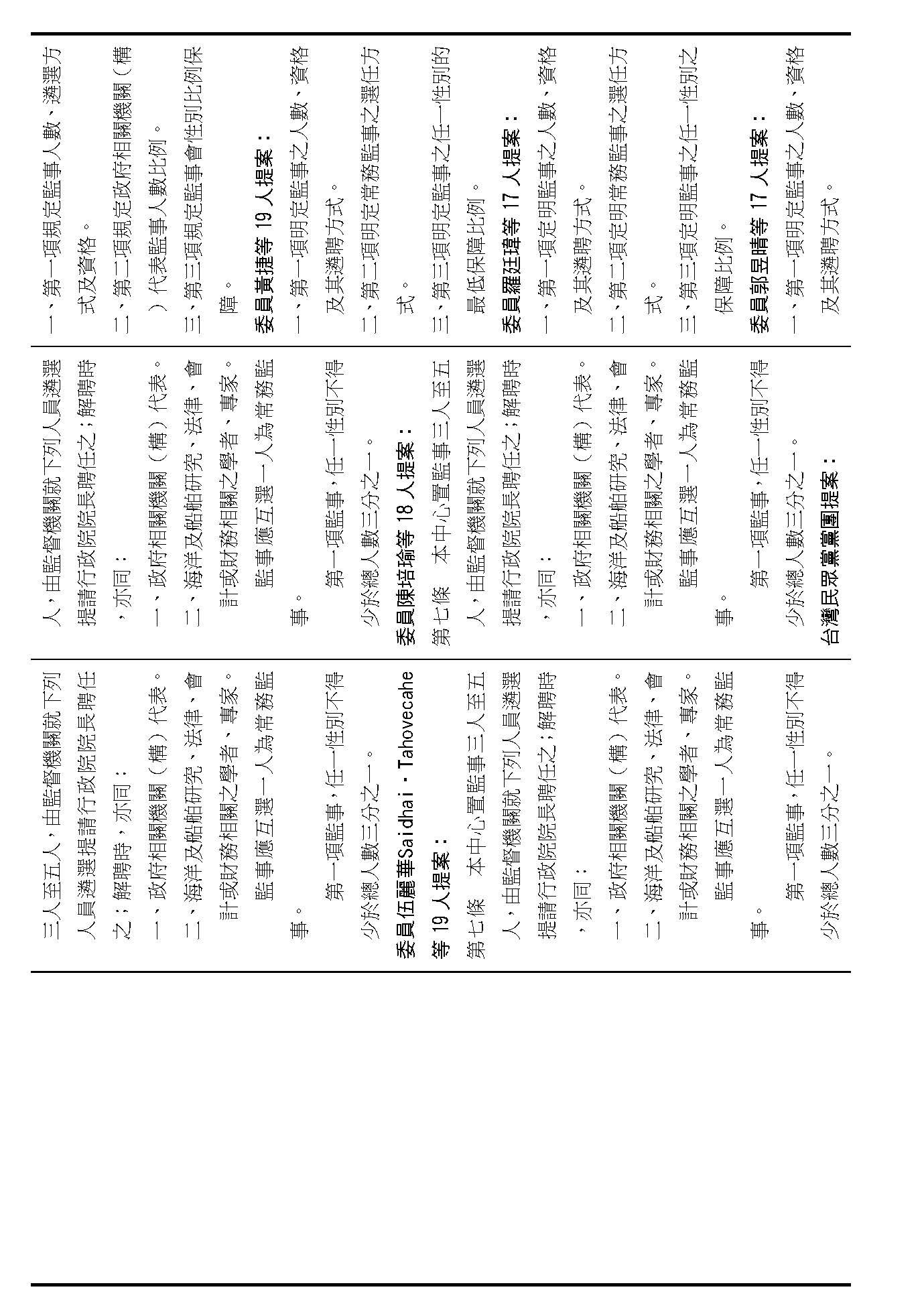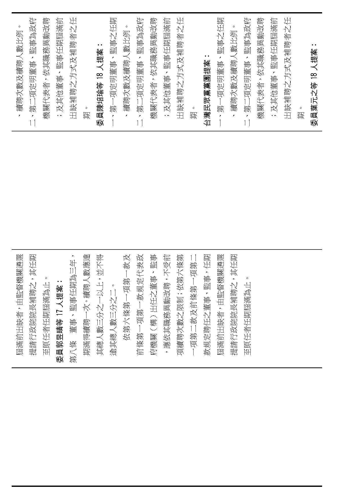 第八條是董事及監事的任期、解聘還有補聘的方式,這條提案的內容都大同小異,如果在場委員沒有其他的意見的話,我們就按照行政院的提案通過。