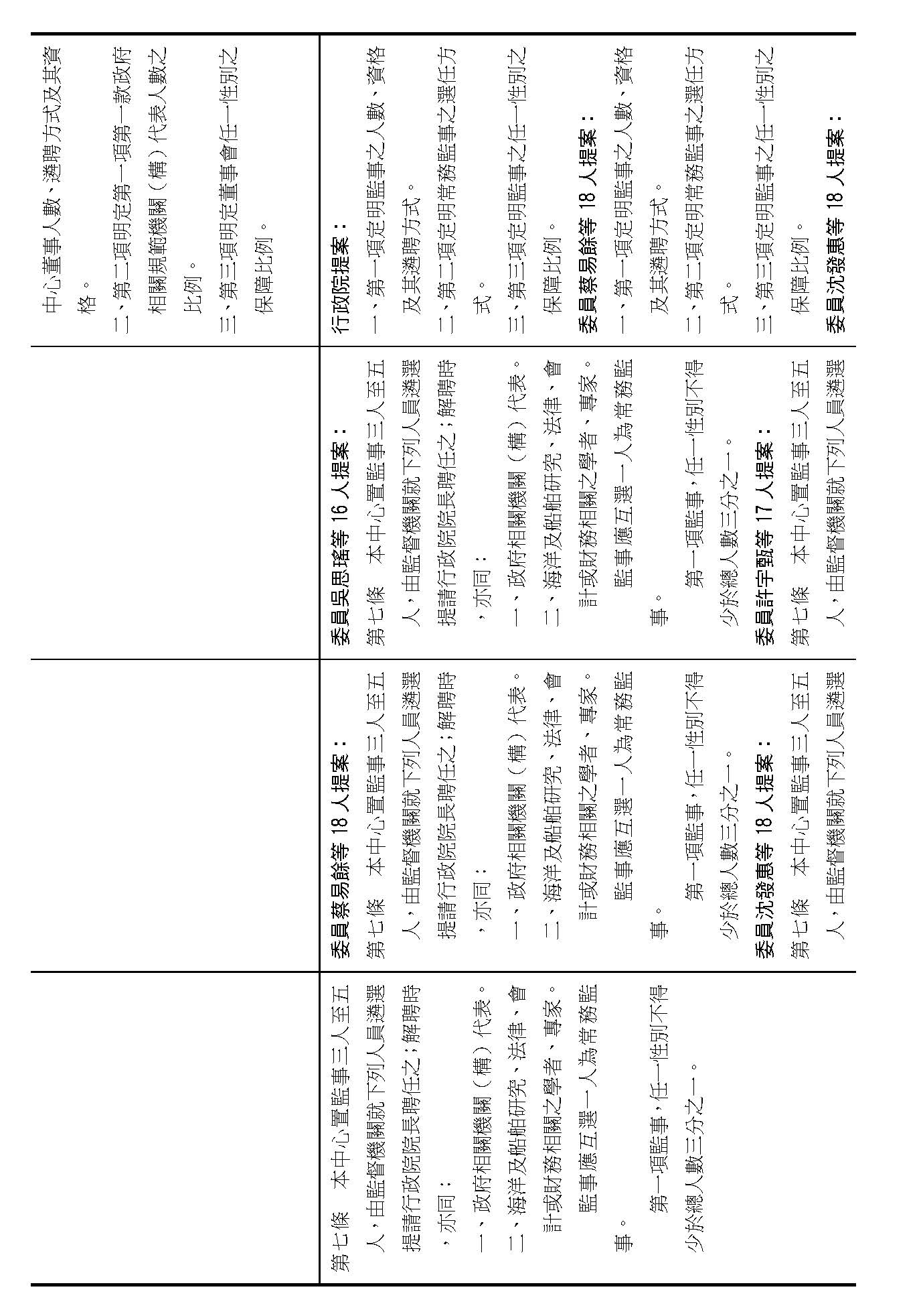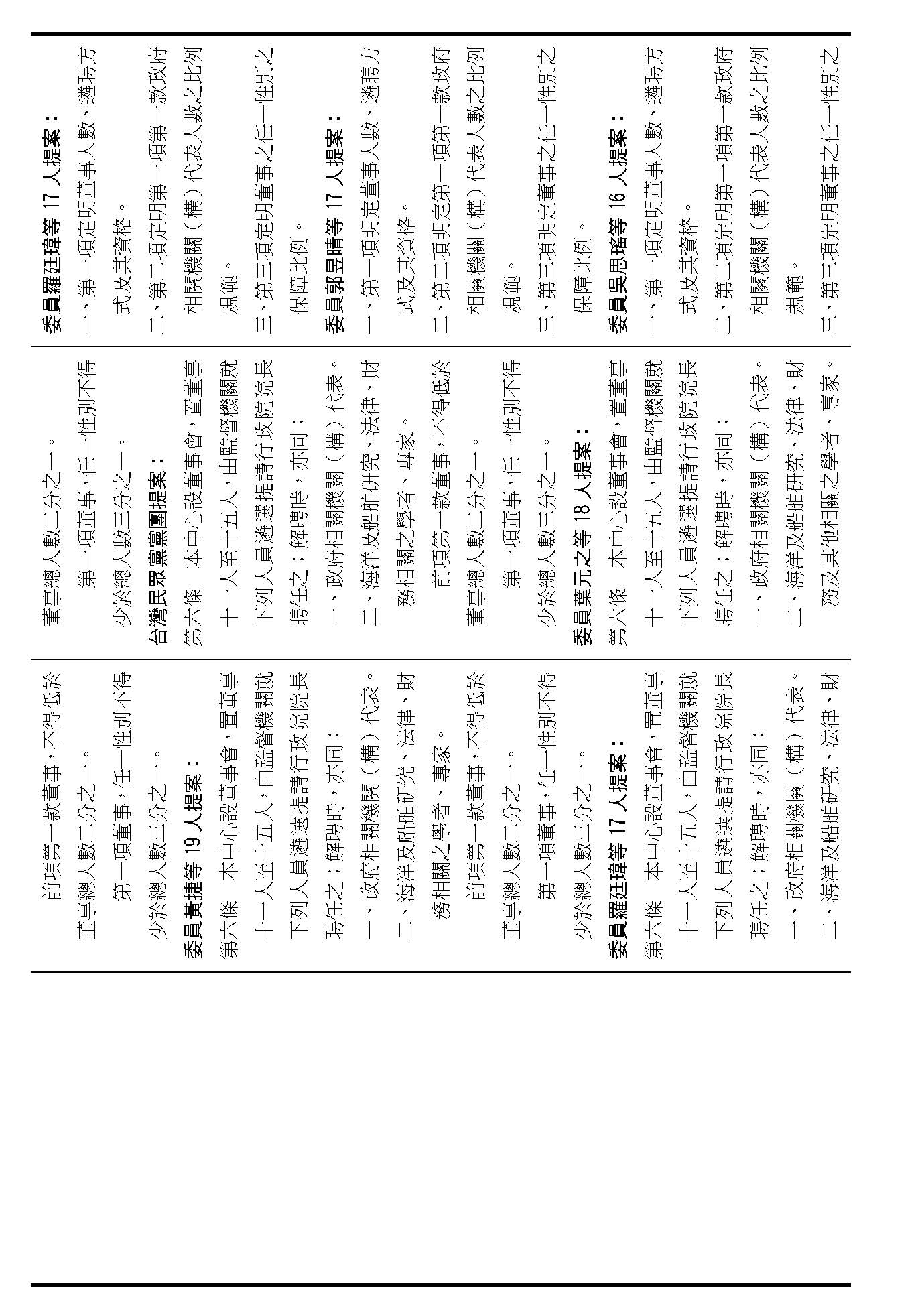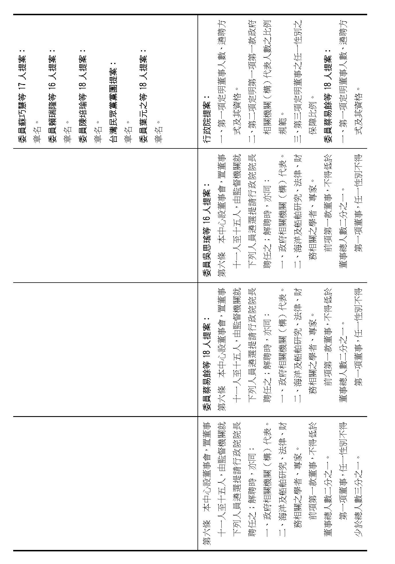 第六條是董事的人數、資格還有遴聘,我看提案也都相同,我們是不是按照行政院的提案通過?(是)第六條就按照行政院的提案通過。