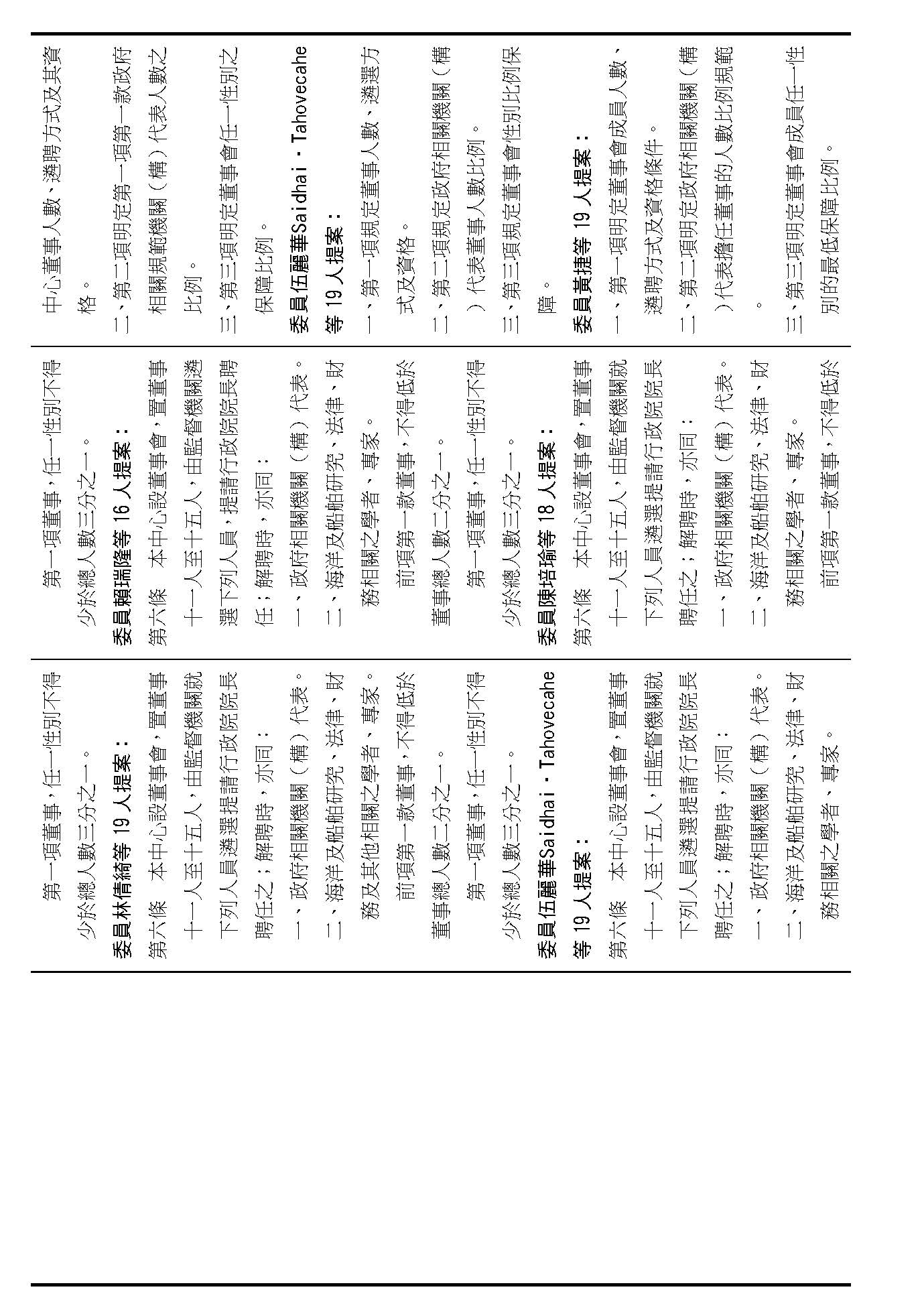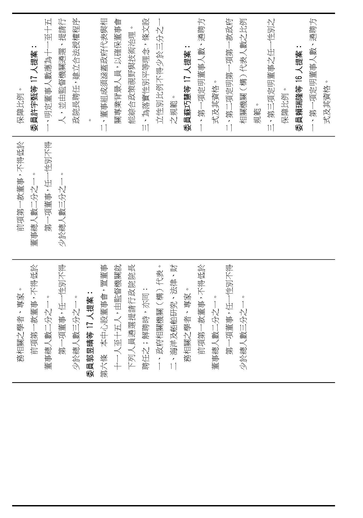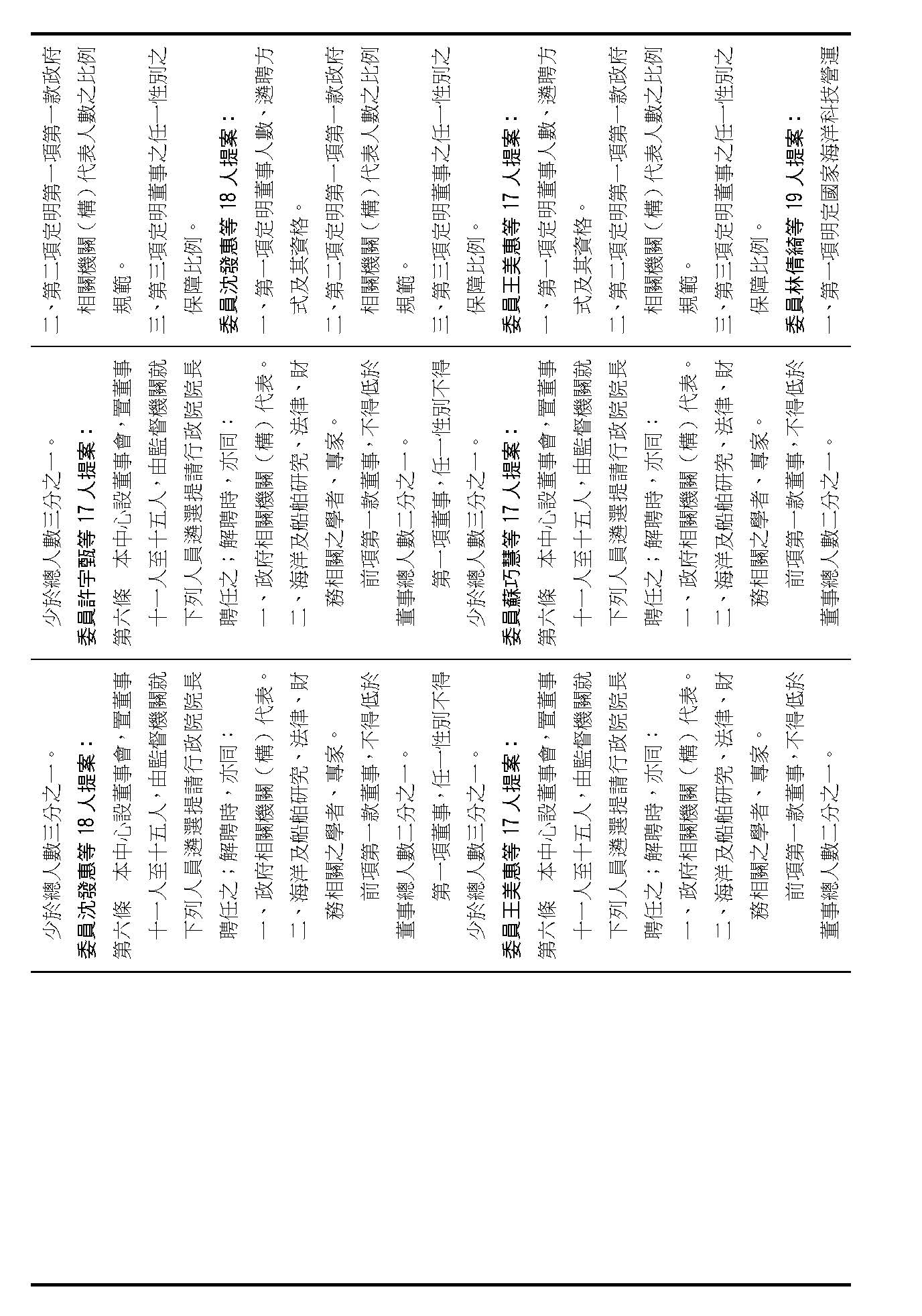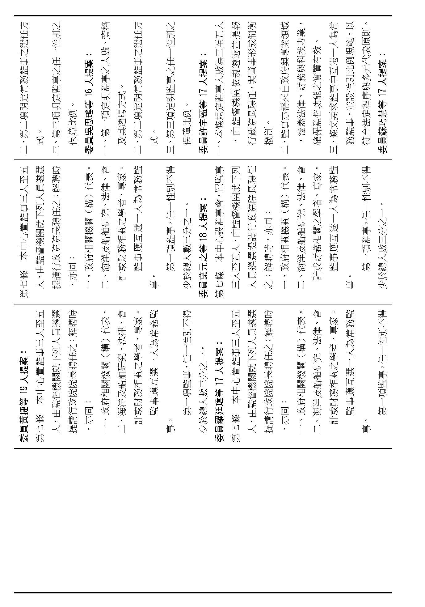 第六條是董事的人數、資格還有遴聘,我看提案也都相同,我們是不是按照行政院的提案通過?(是)第六條就按照行政院的提案通過。