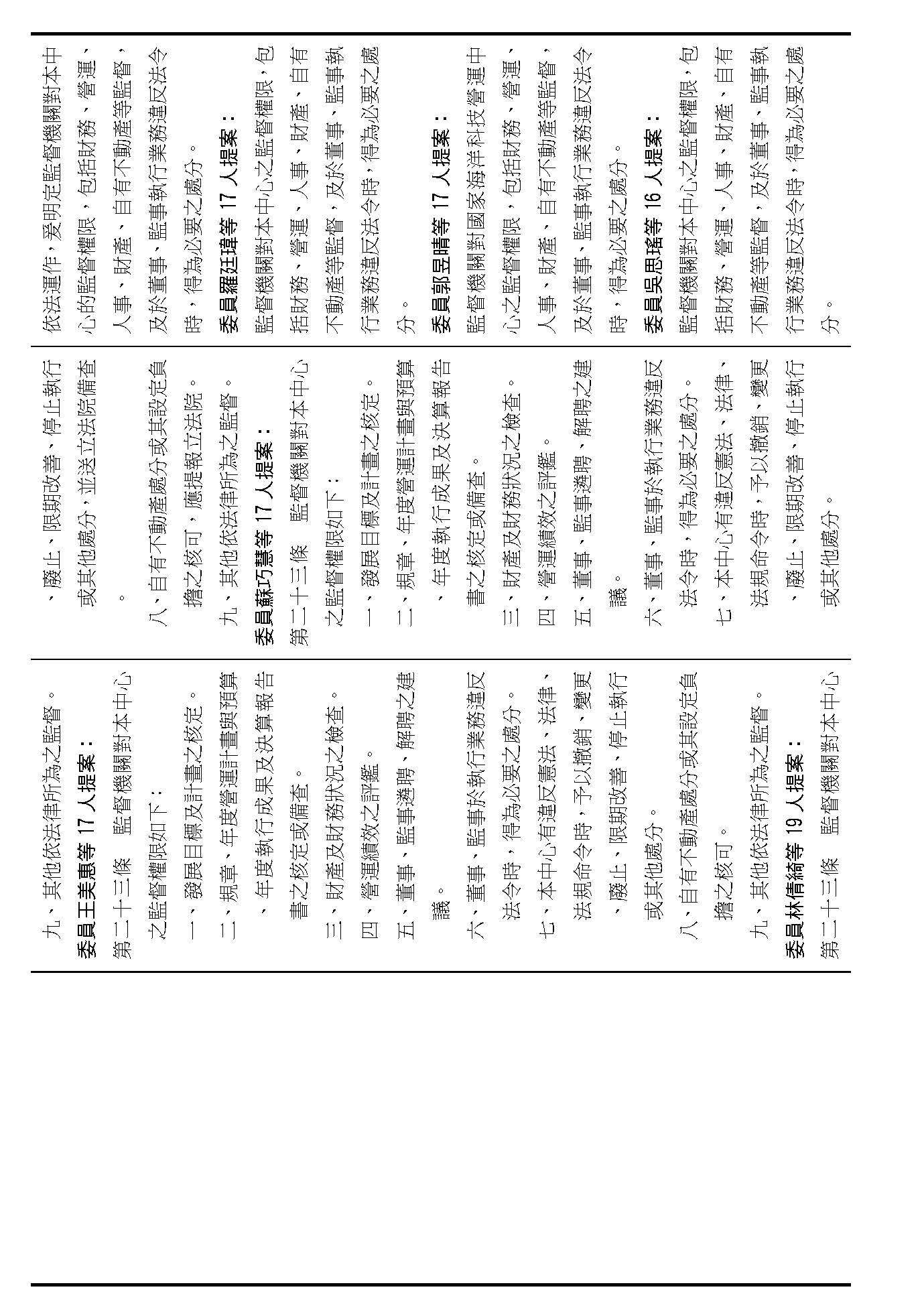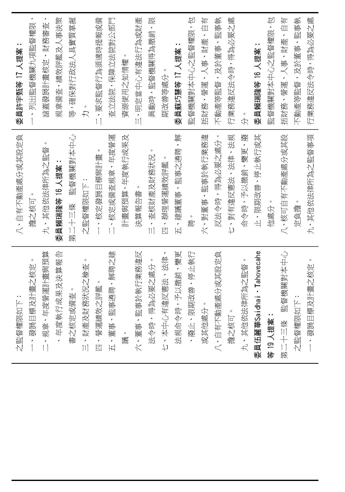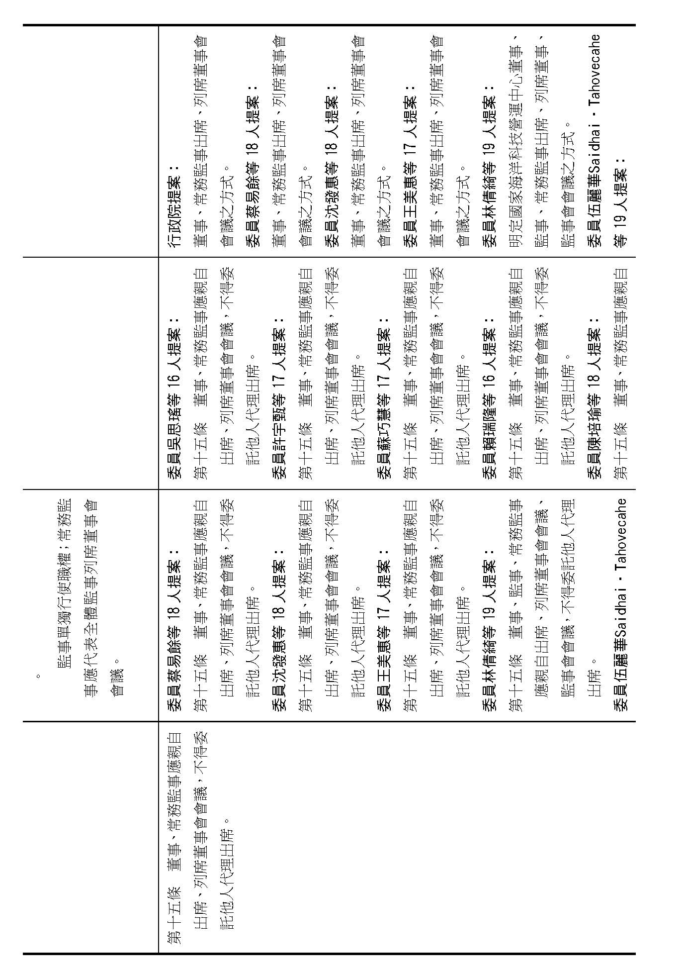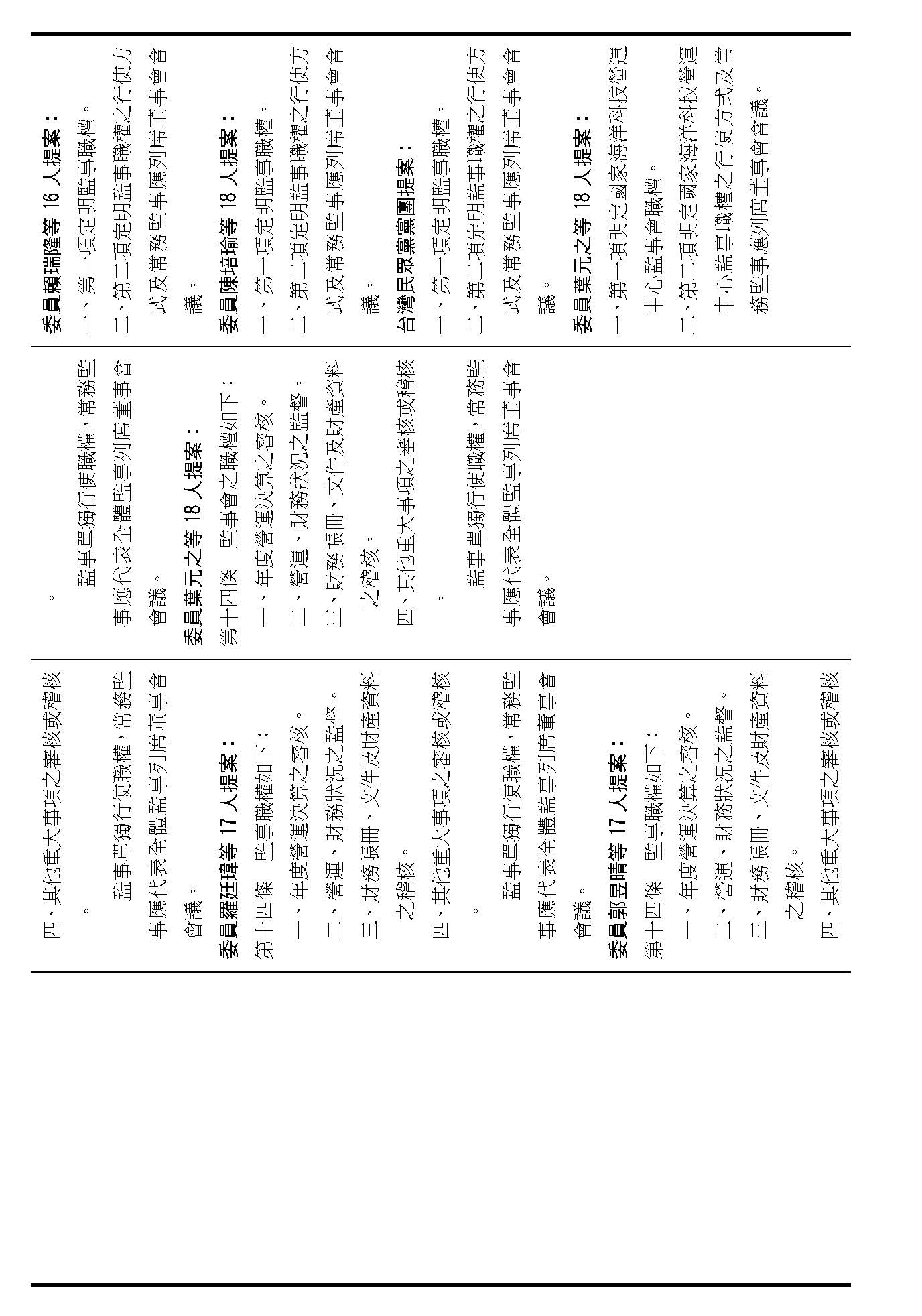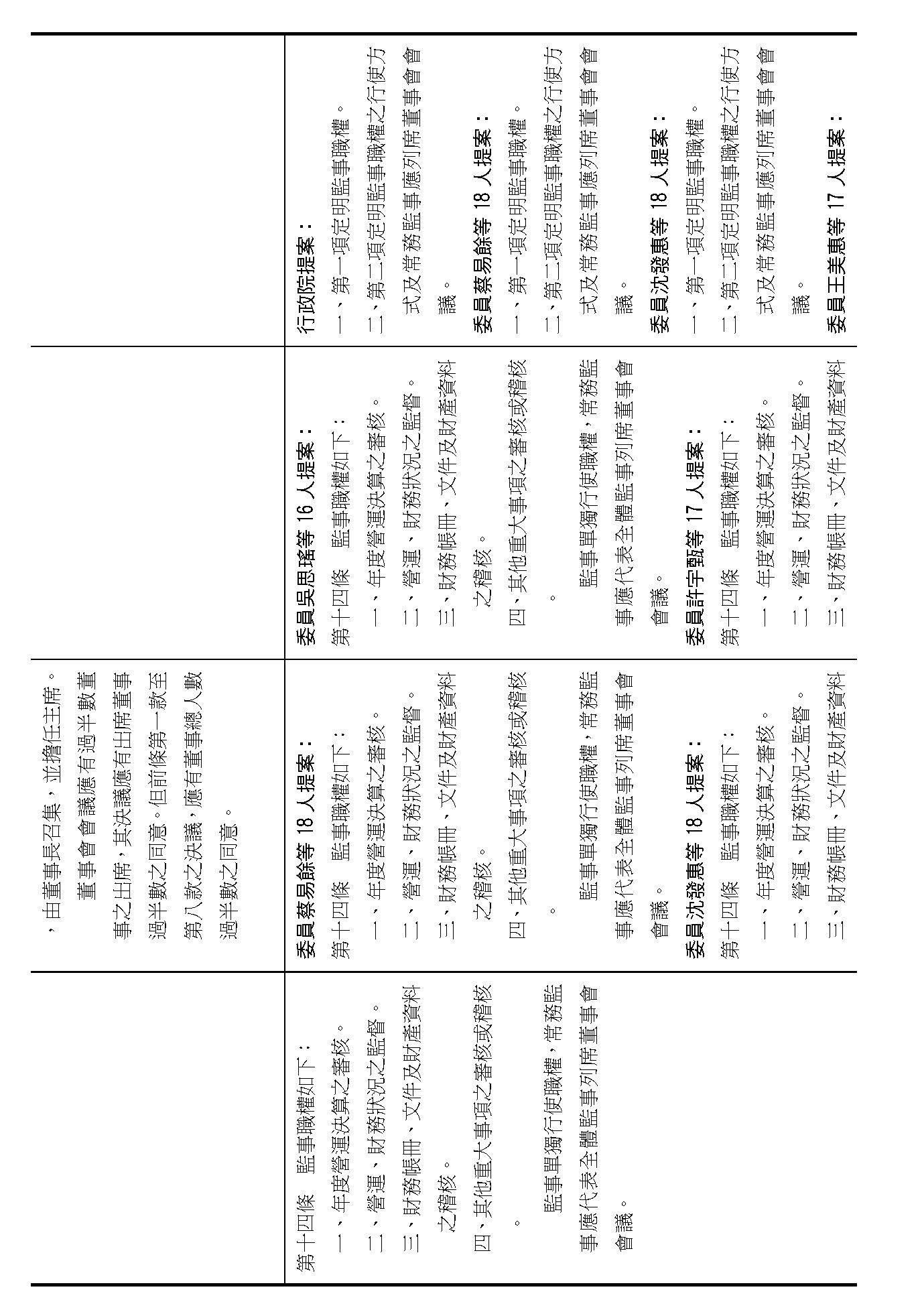 第十四條是監事的職權事項跟行使方式,請問在場委員有沒有其他不同意見?(無)沒有其他不同意見的話,就按照行政院的提案通過。