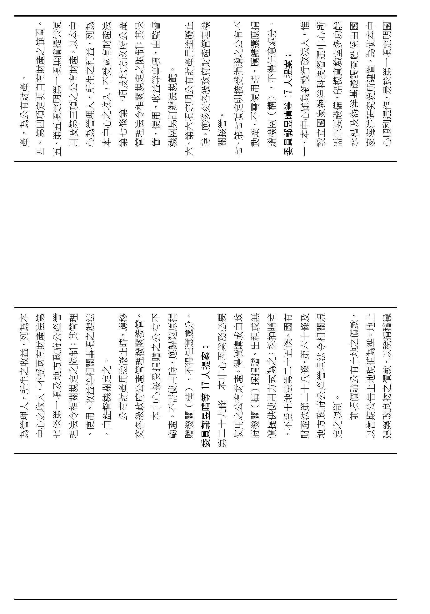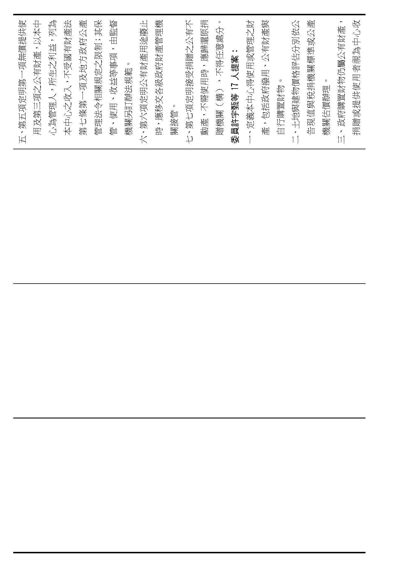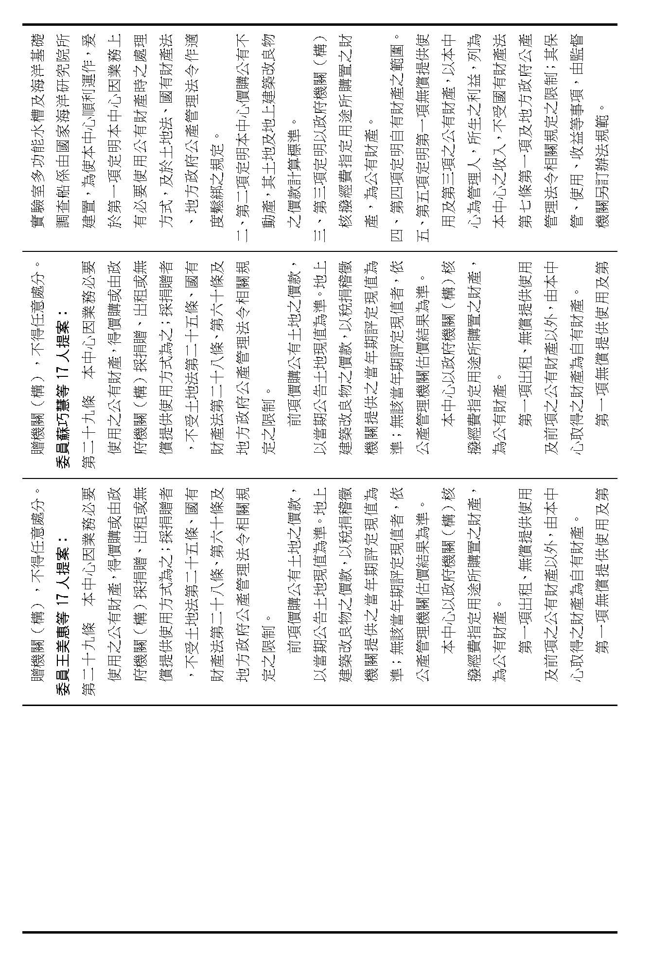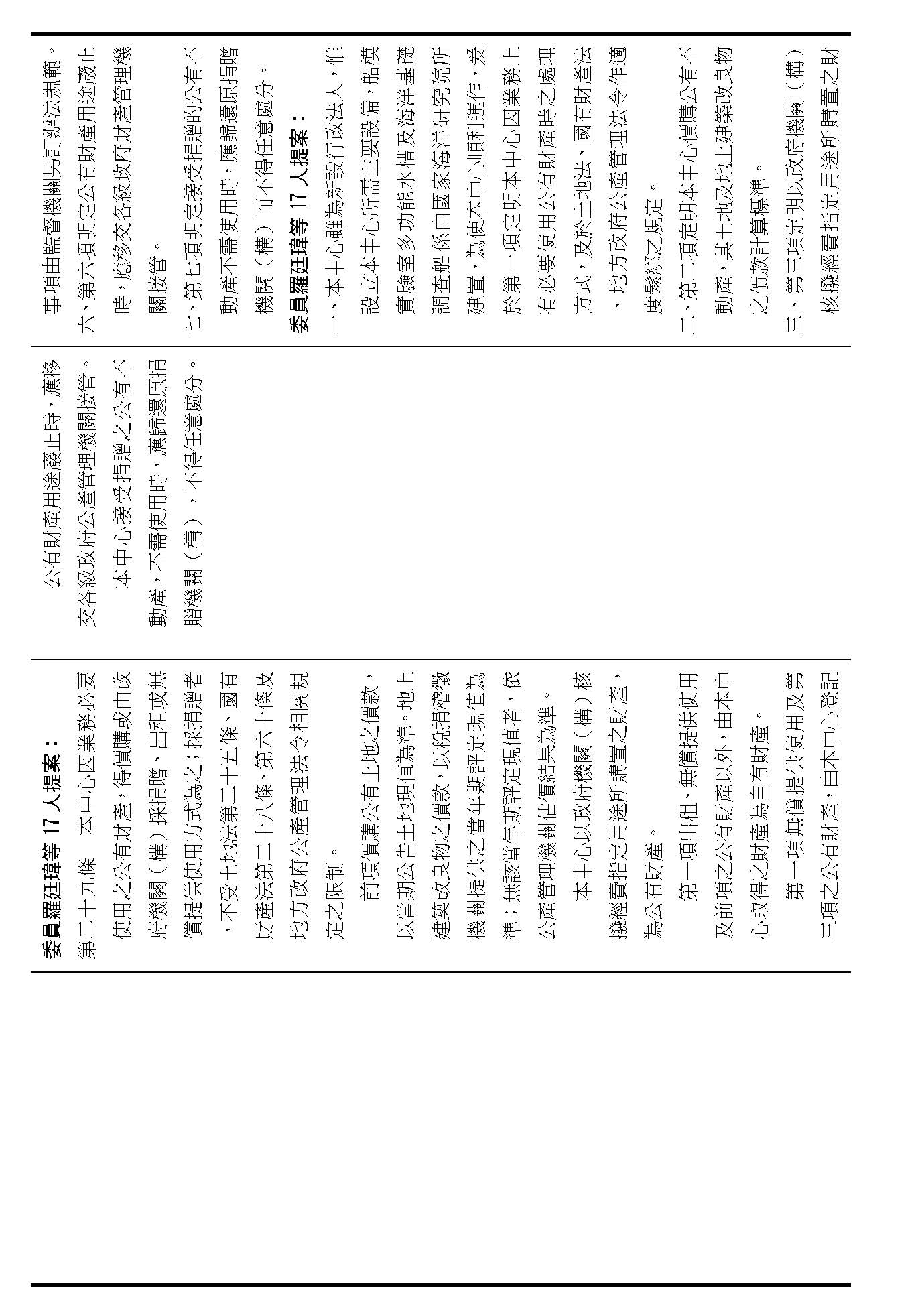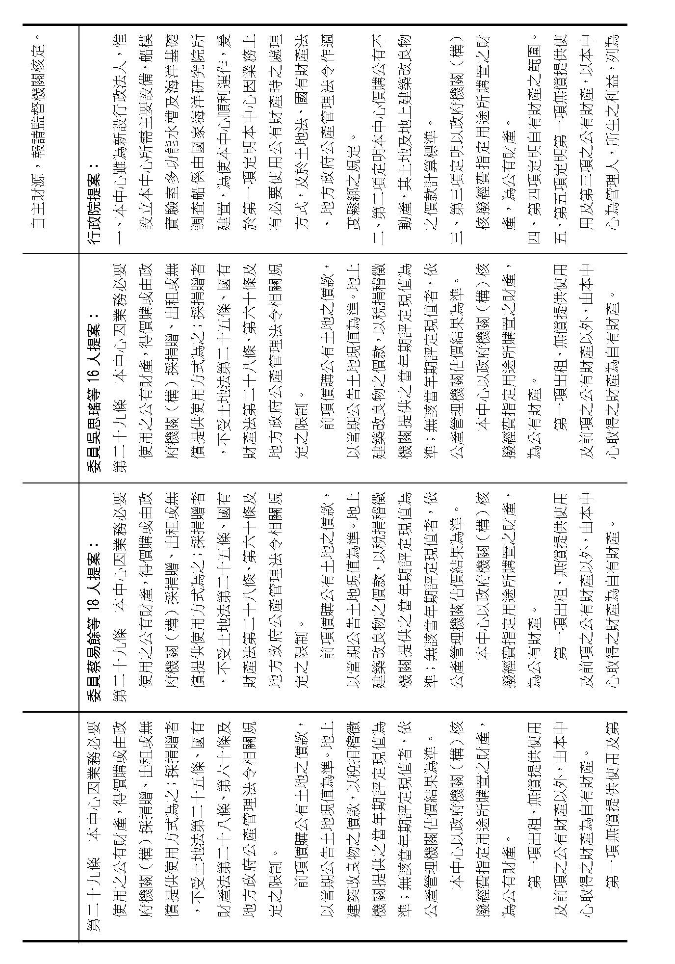 第二十九條是中心公有跟自有財產的定義、管理、使用、收益的相關規定,這是管理方式的部分,在場委員有沒有不同意見?(無)如果在場委員沒有其他不同意見的話,我們就按照行政院的提案通過。