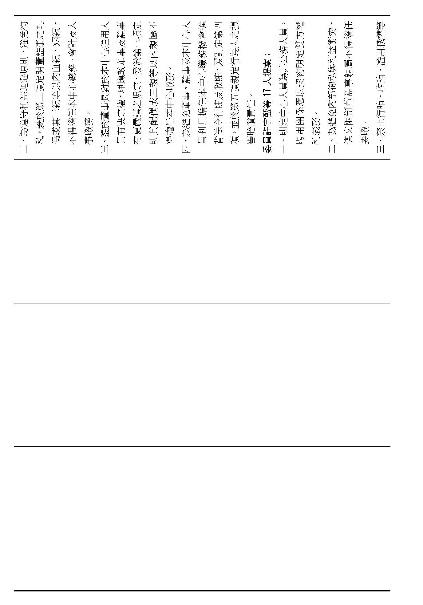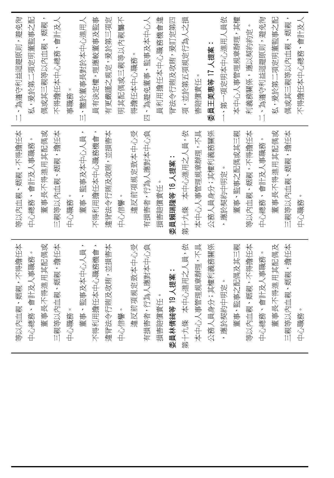 第十七條,董、監事間不得有配偶跟三親等以內的血親、姻親關係,這個都有高度共識,請問在場委員有沒有什麼不同意見?(無)沒有的話,就按照行政院的提案通過。