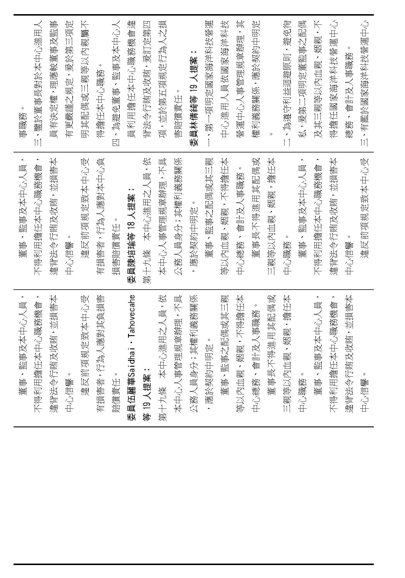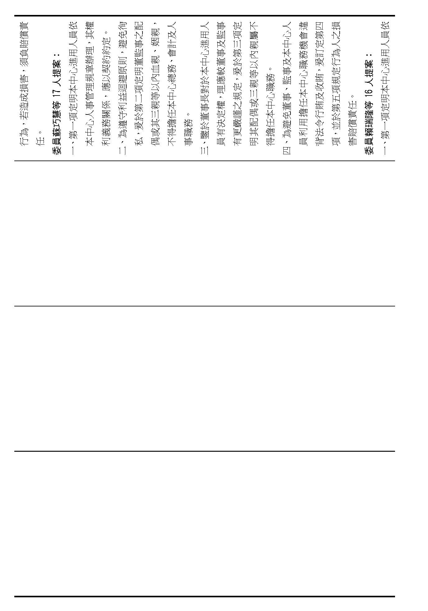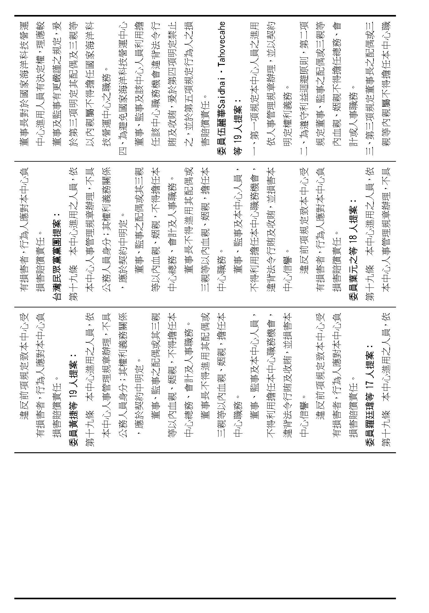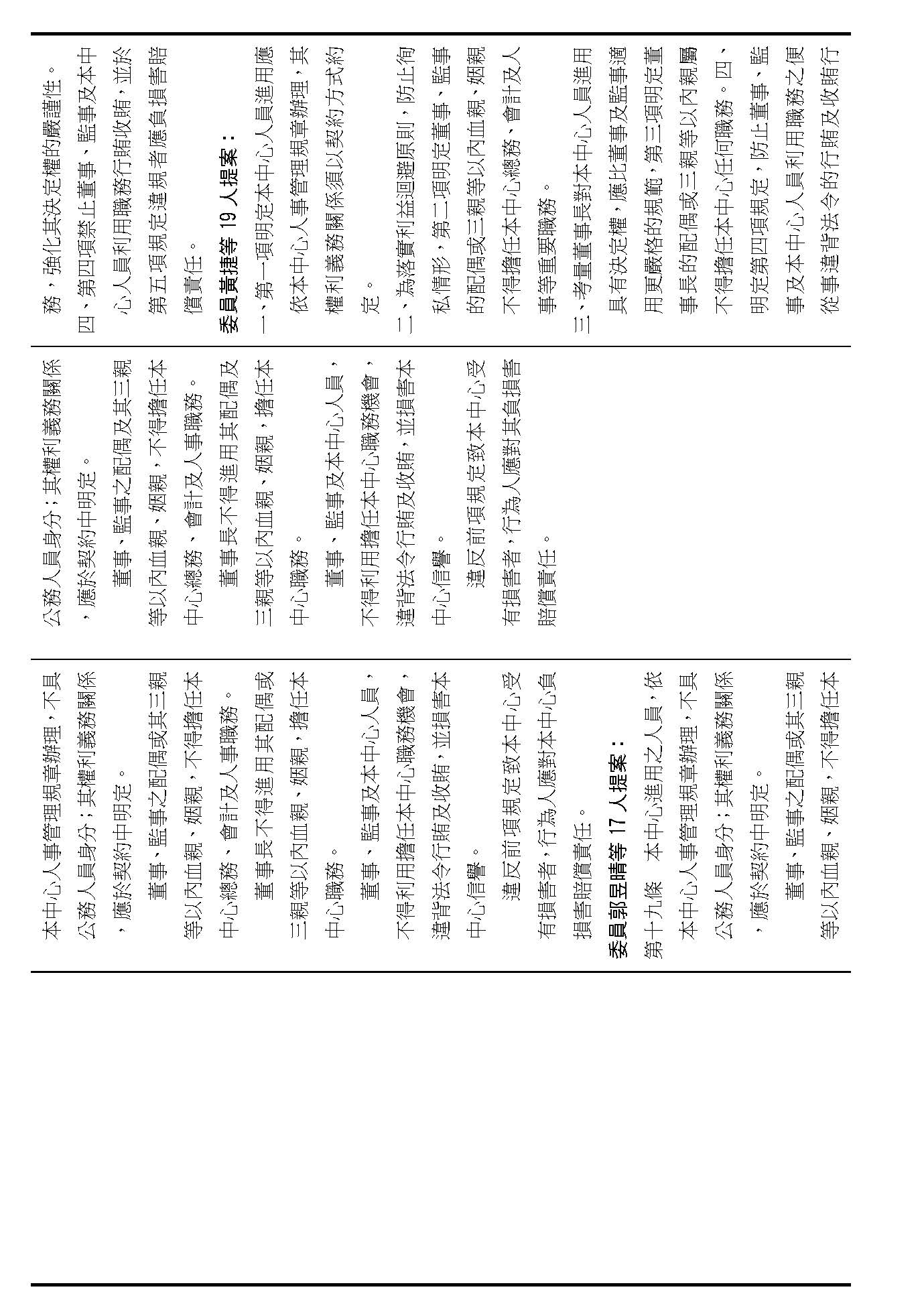 第十九條是本中心進用人員的權利及義務,請問在場委員有沒有意見?(無)如果沒有的話,第十九條按照行政院的提案通過。