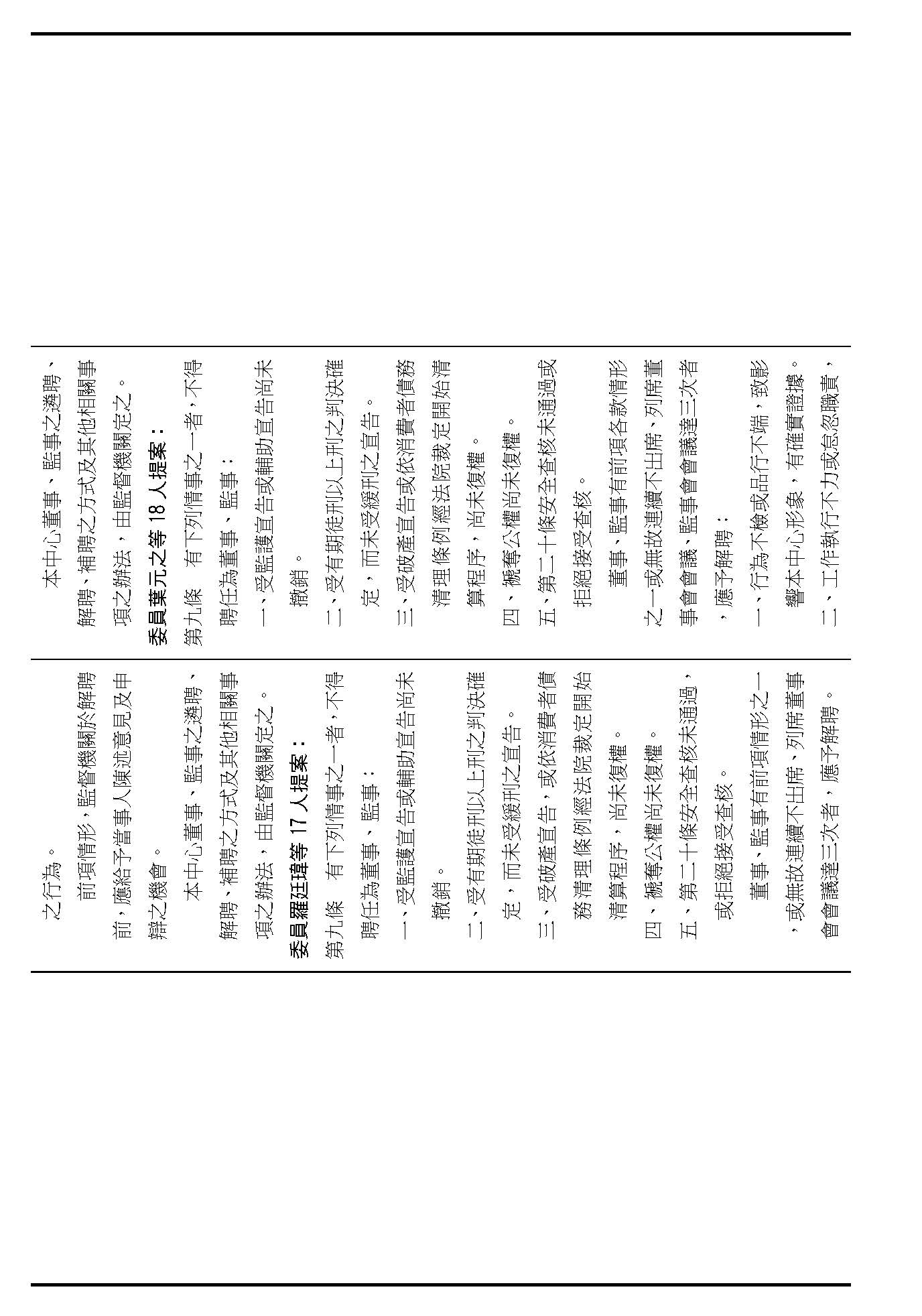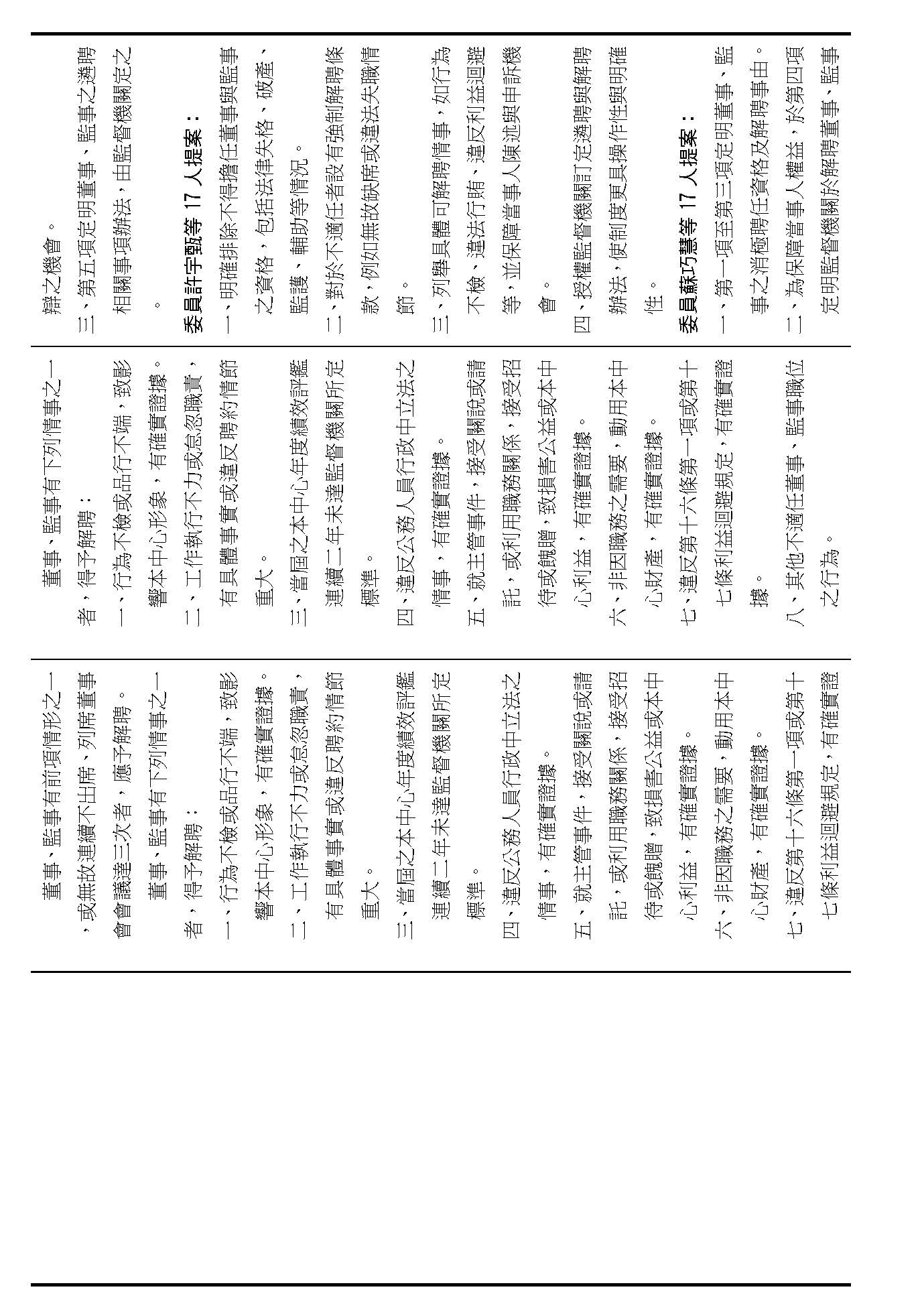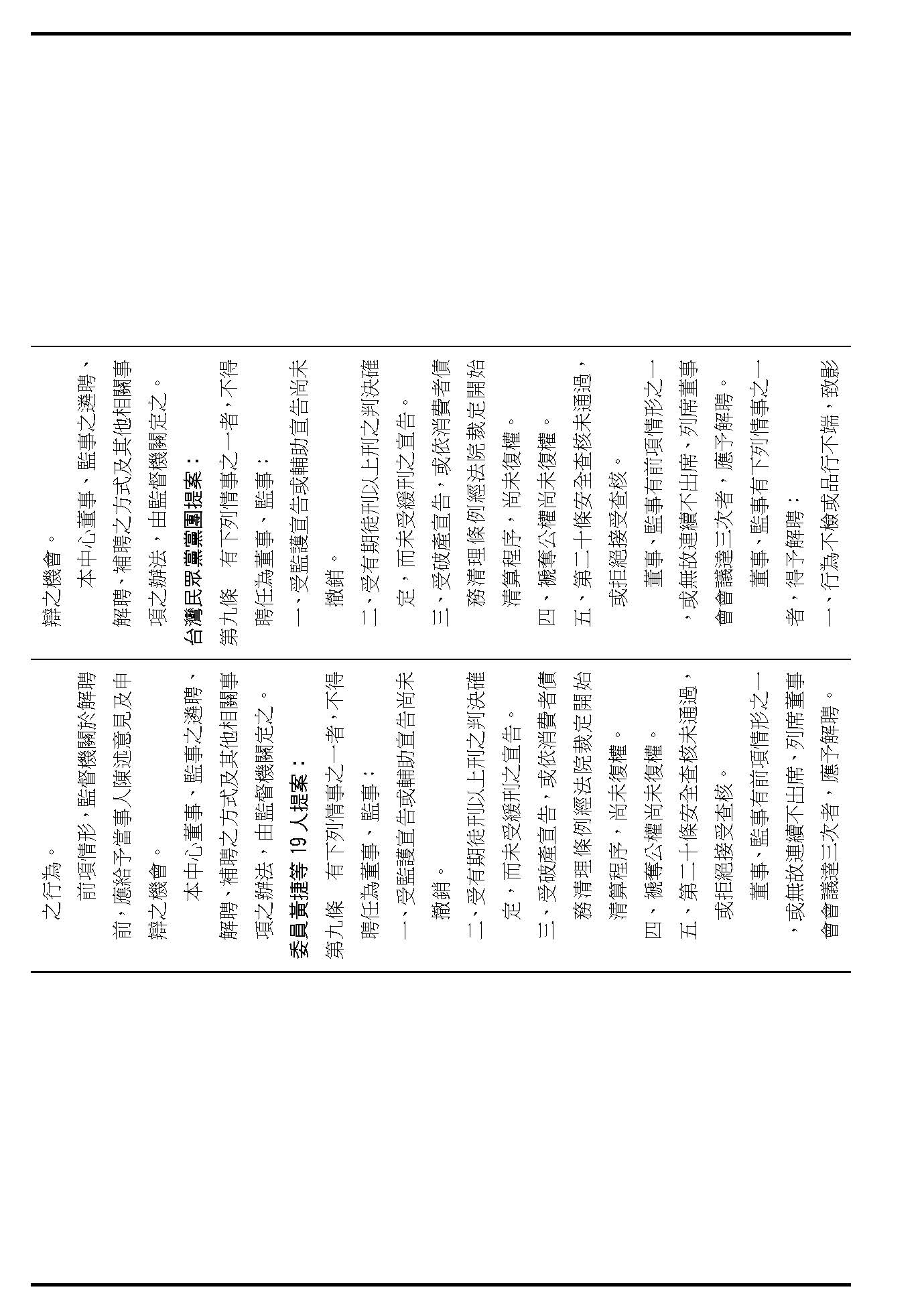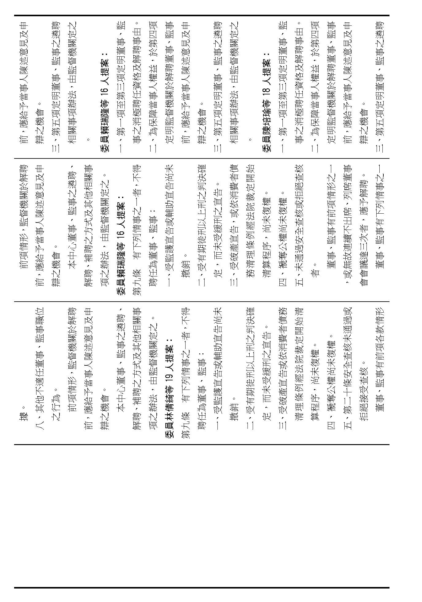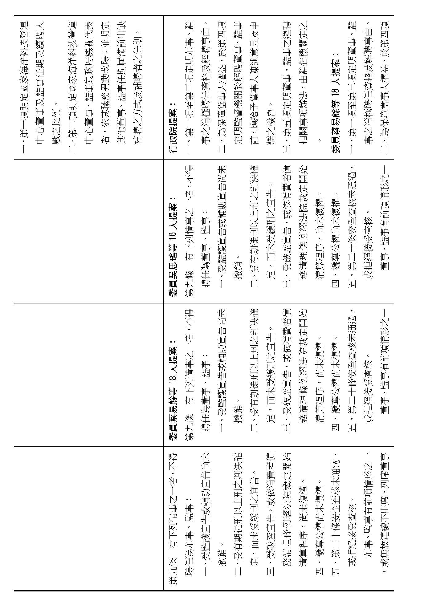 接下來我們進入到第九條,這條在詢答的時候,委員有一些不同的意見,就是董事及監事聘任的消極資格跟解聘的事由,請問在場委員針對第九條有沒有其他的意見?(無)如果沒有的話,我們就按照行政院的提案通過。