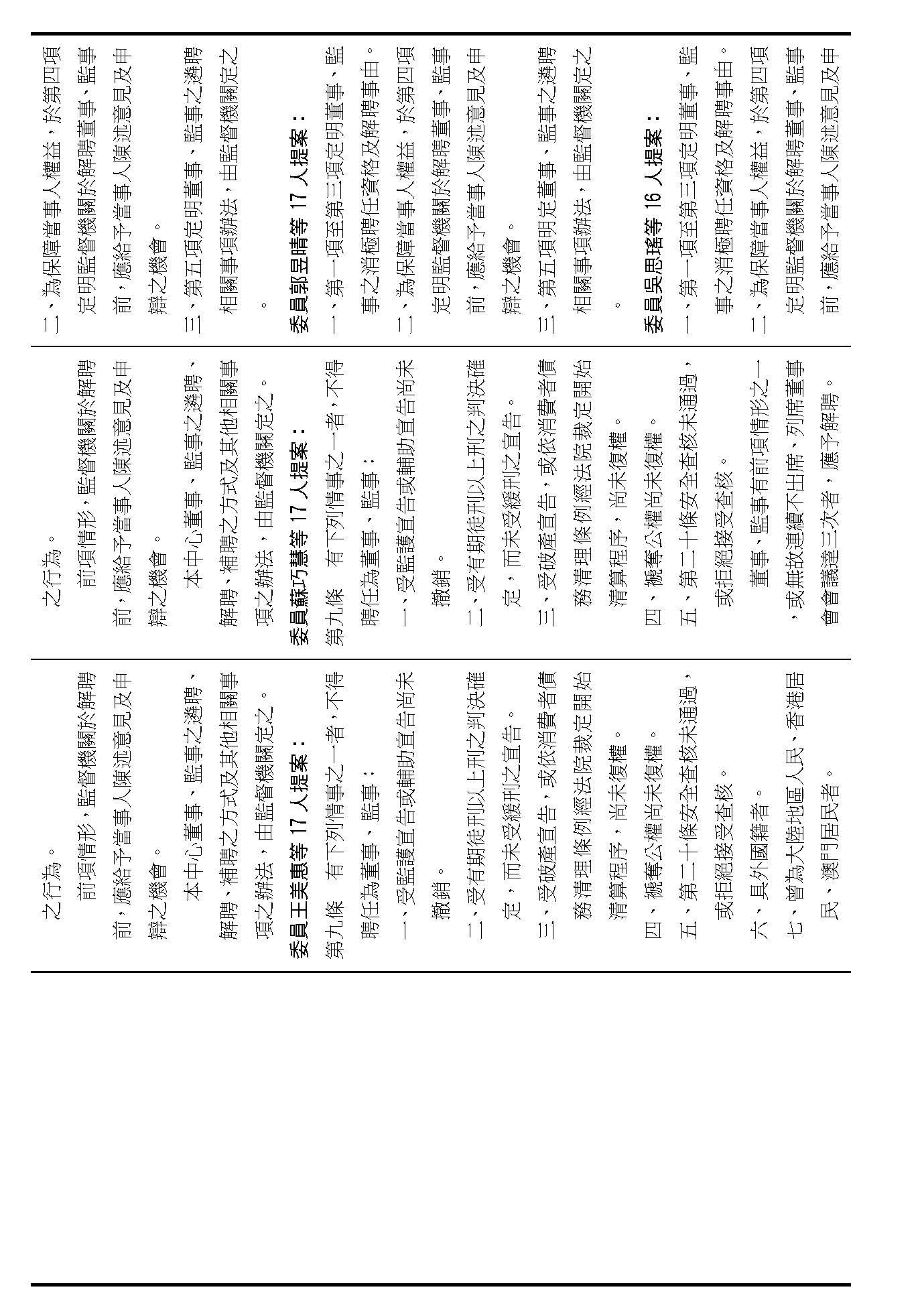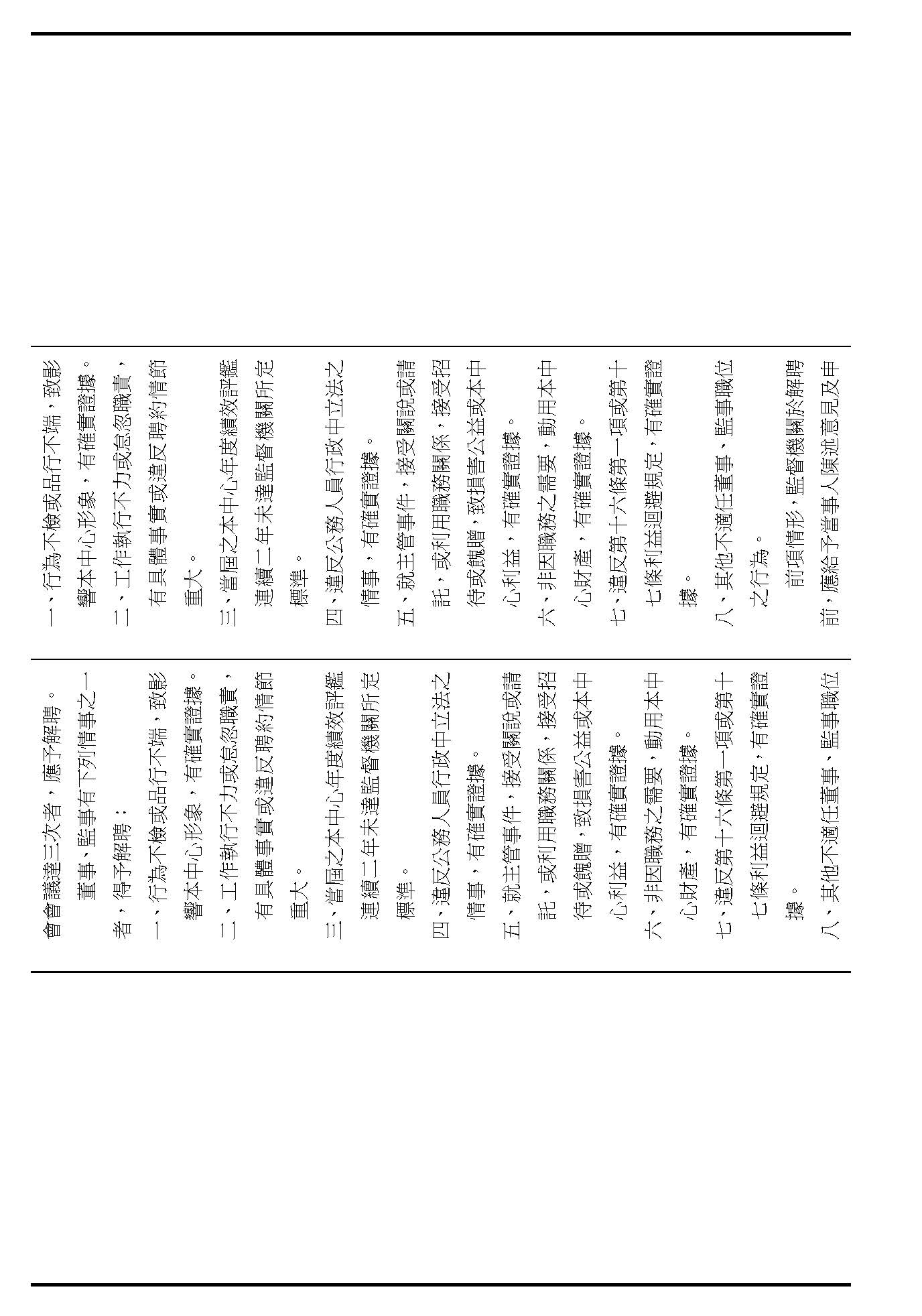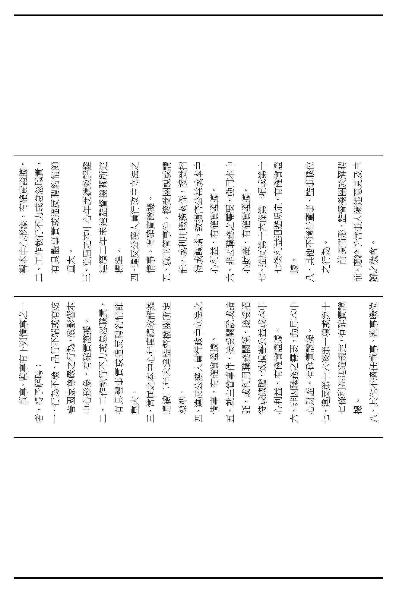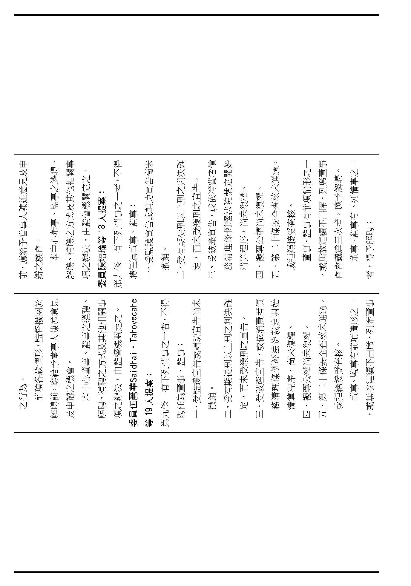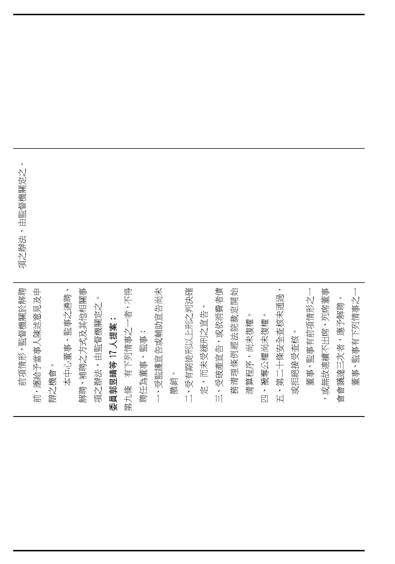 接下來我們進入到第九條,這條在詢答的時候,委員有一些不同的意見,就是董事及監事聘任的消極資格跟解聘的事由,請問在場委員針對第九條有沒有其他的意見?(無)如果沒有的話,我們就按照行政院的提案通過。