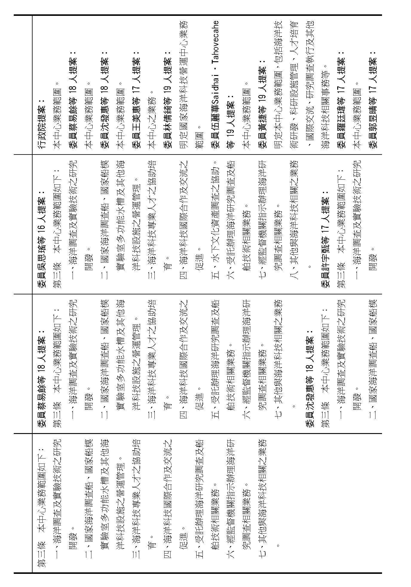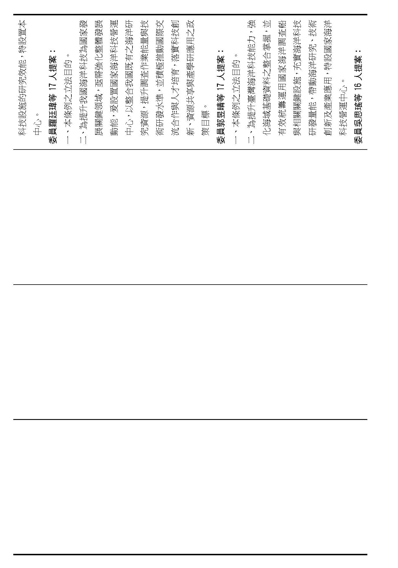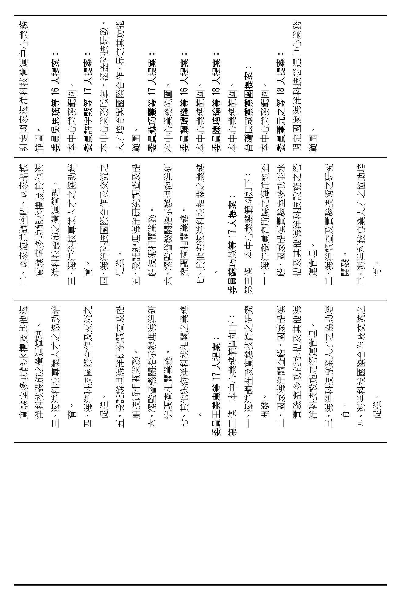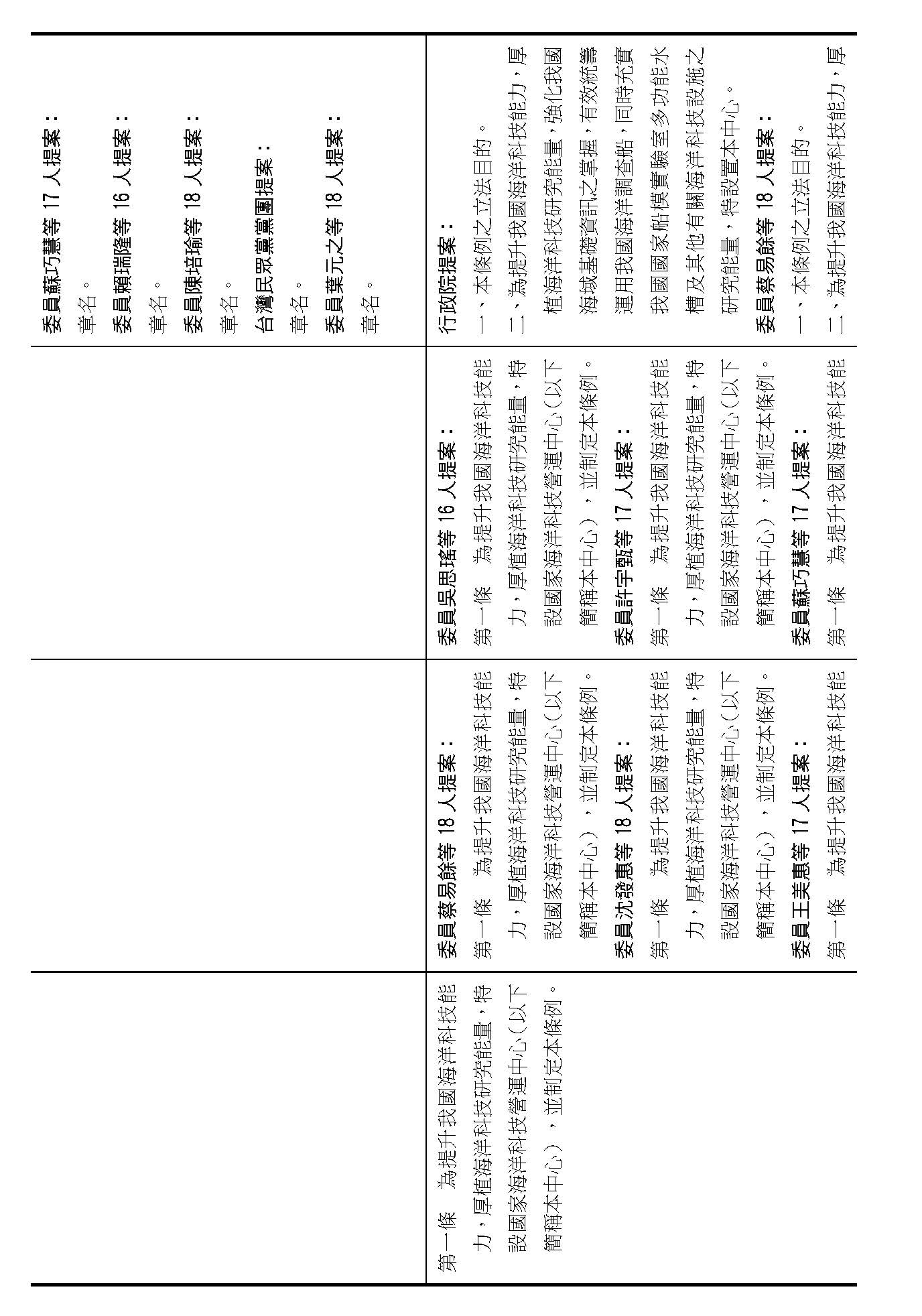 繼續併案審查(一)行政院函請審議、(二)委員蔡易餘等18人、(三)委員沈發惠等18人、(四)委員王美惠等17人、(五)委員林倩綺等19人、(六)委員伍麗華Saidhai Tahovecahe等19人、(七)委員黃捷等19人、(八)委員羅廷瑋等17人、(九)委員郭昱晴等17人、(十)委員吳思瑤等16人、(十一)委員許宇甄等17人、(十二)委員蘇巧慧等17人、(十三)委員賴瑞隆等16人、(十四)委員陳培瑜等18人、(十五)台灣民眾黨黨團及(十六)委員葉元之等18人分別擬具「國家海洋科技營運中心設置條例草案」案。