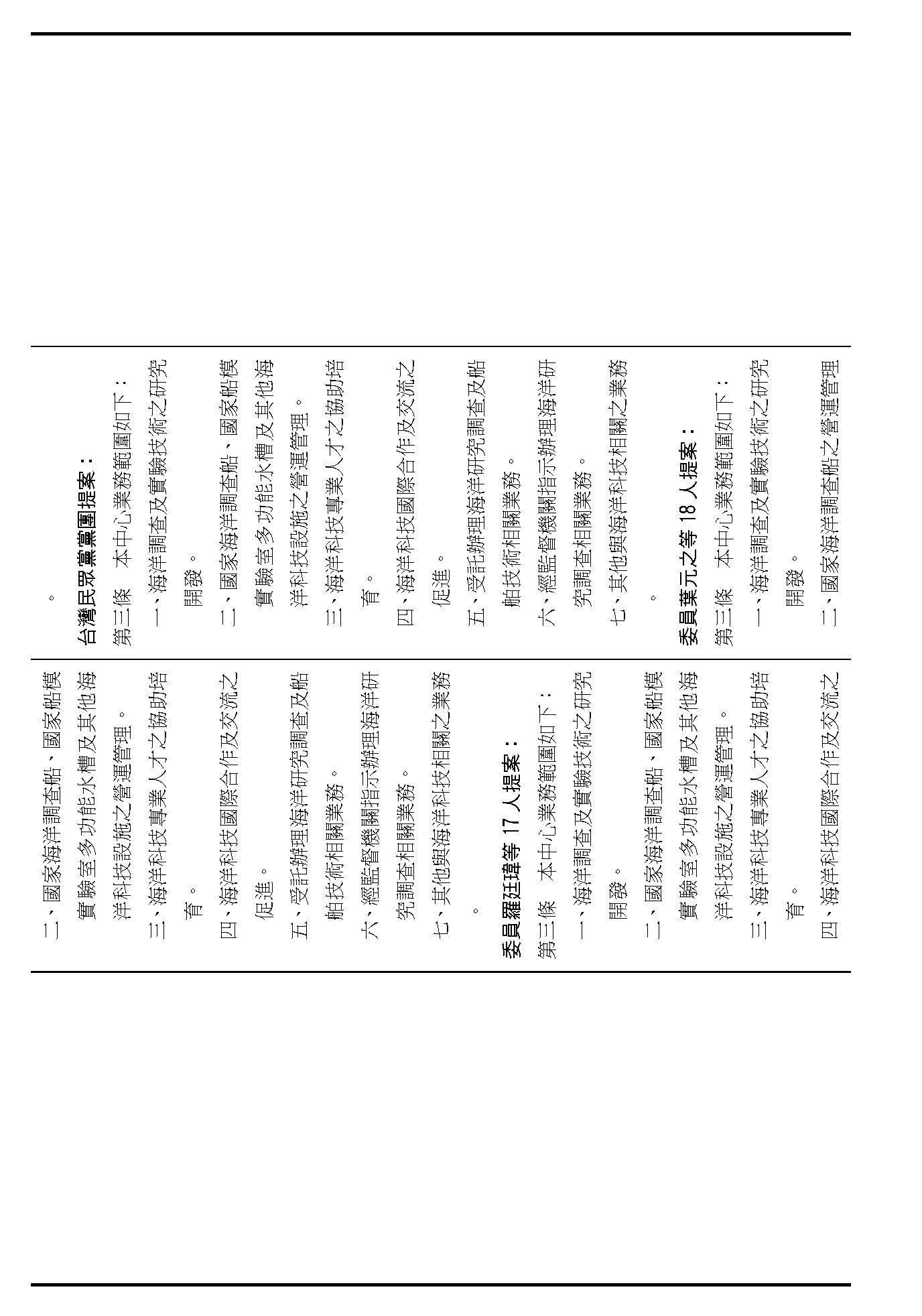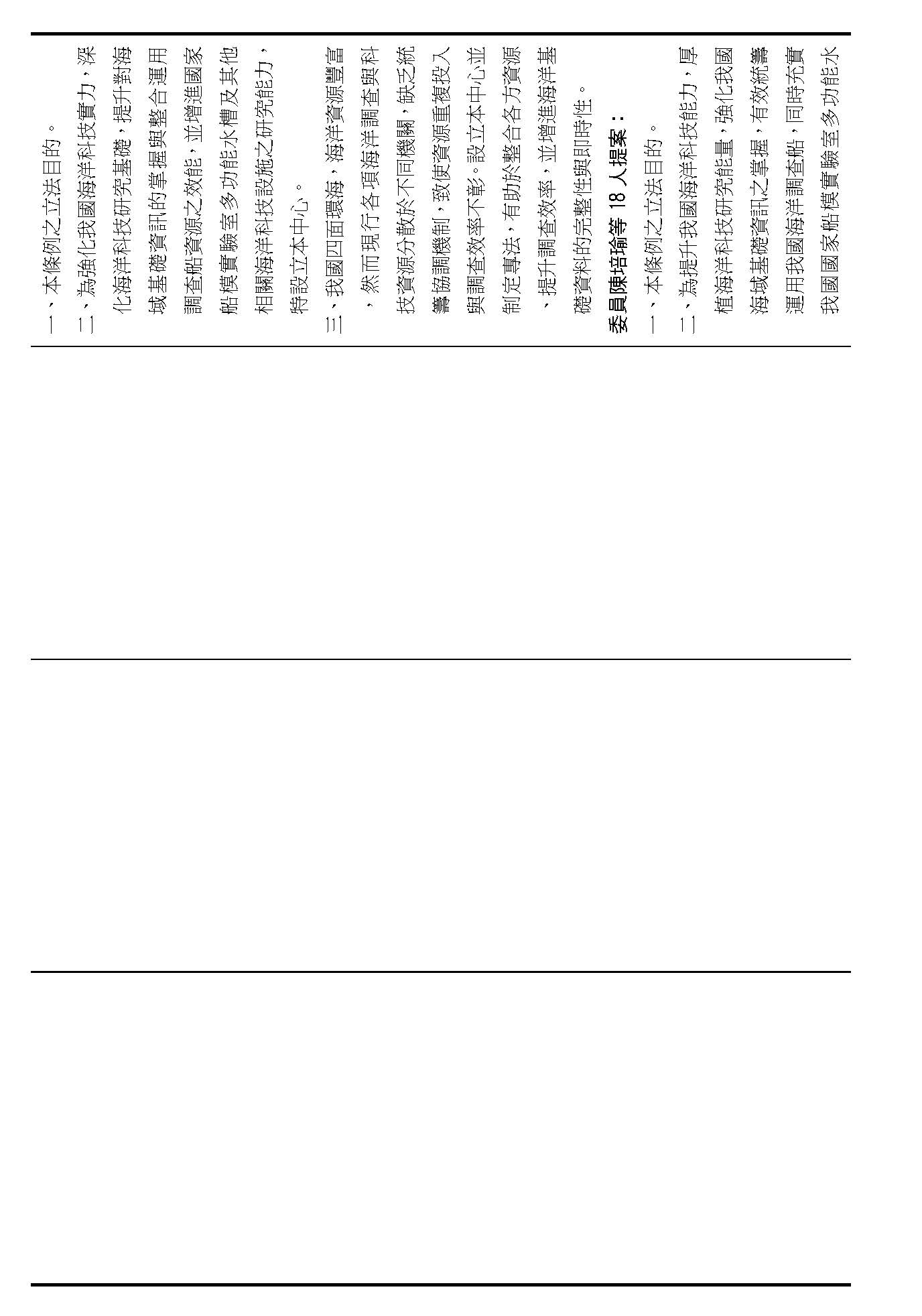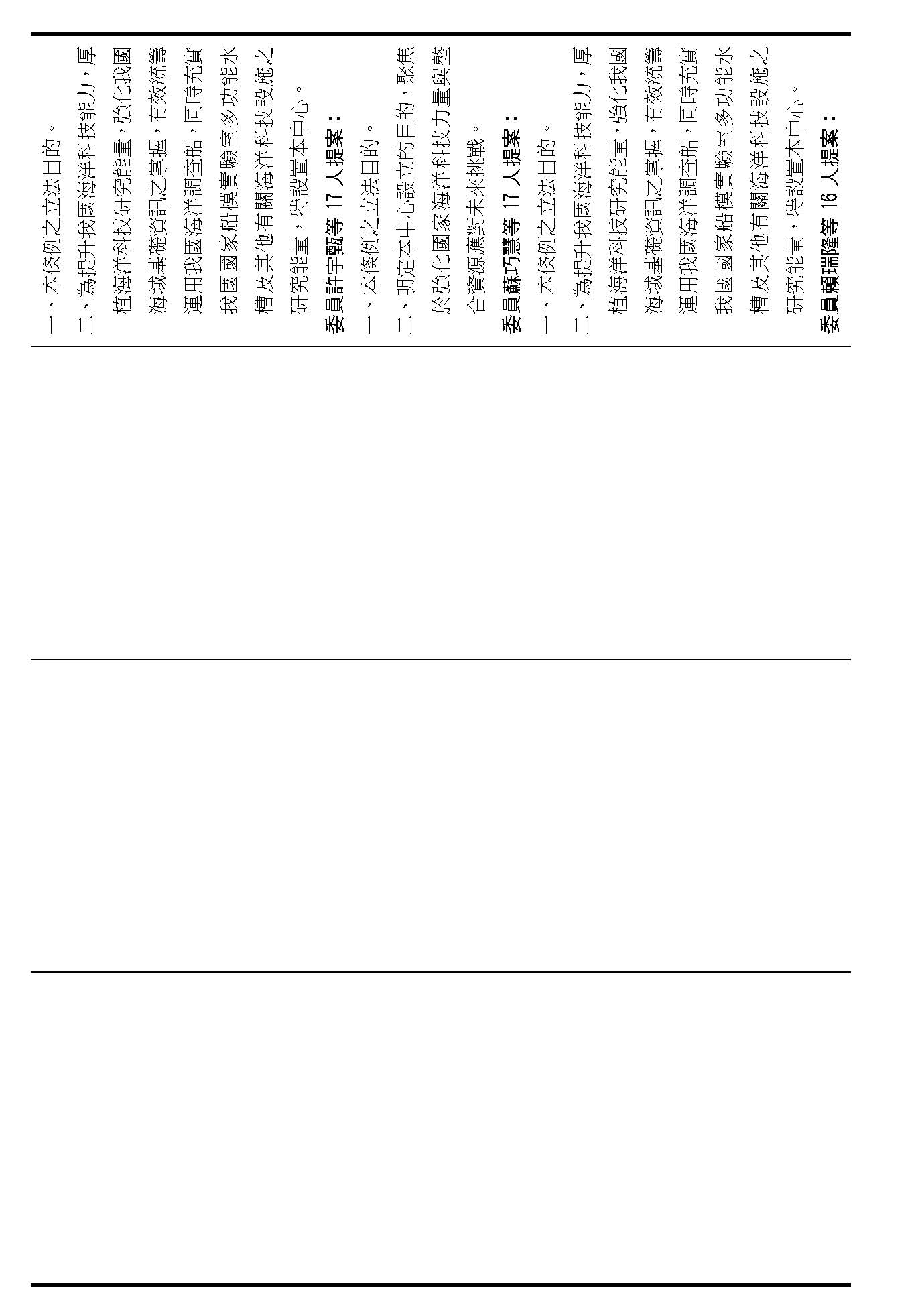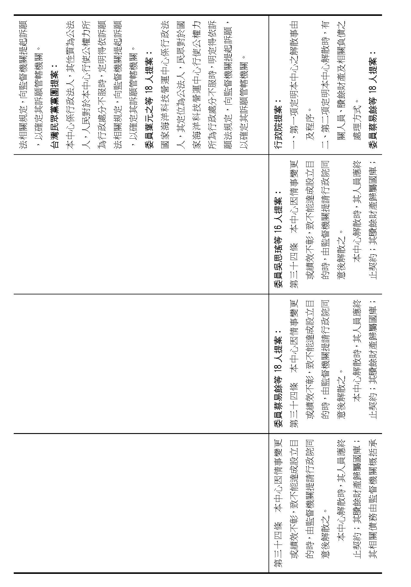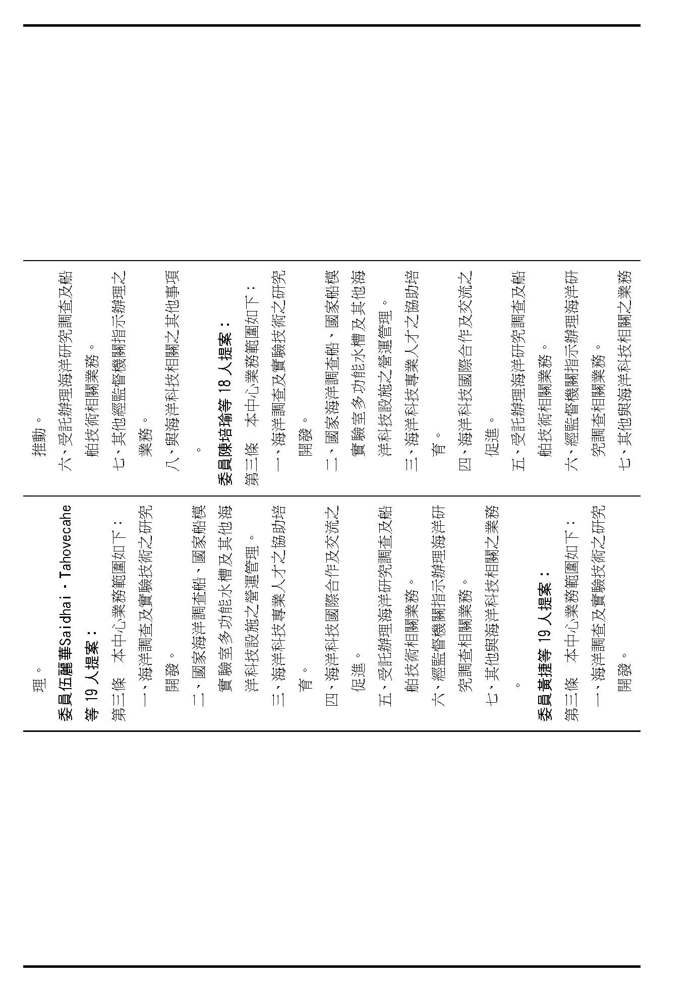 繼續併案審查(一)行政院函請審議、(二)委員蔡易餘等18人、(三)委員沈發惠等18人、(四)委員王美惠等17人、(五)委員林倩綺等19人、(六)委員伍麗華Saidhai Tahovecahe等19人、(七)委員黃捷等19人、(八)委員羅廷瑋等17人、(九)委員郭昱晴等17人、(十)委員吳思瑤等16人、(十一)委員許宇甄等17人、(十二)委員蘇巧慧等17人、(十三)委員賴瑞隆等16人、(十四)委員陳培瑜等18人、(十五)台灣民眾黨黨團及(十六)委員葉元之等18人分別擬具「國家海洋科技營運中心設置條例草案」案。