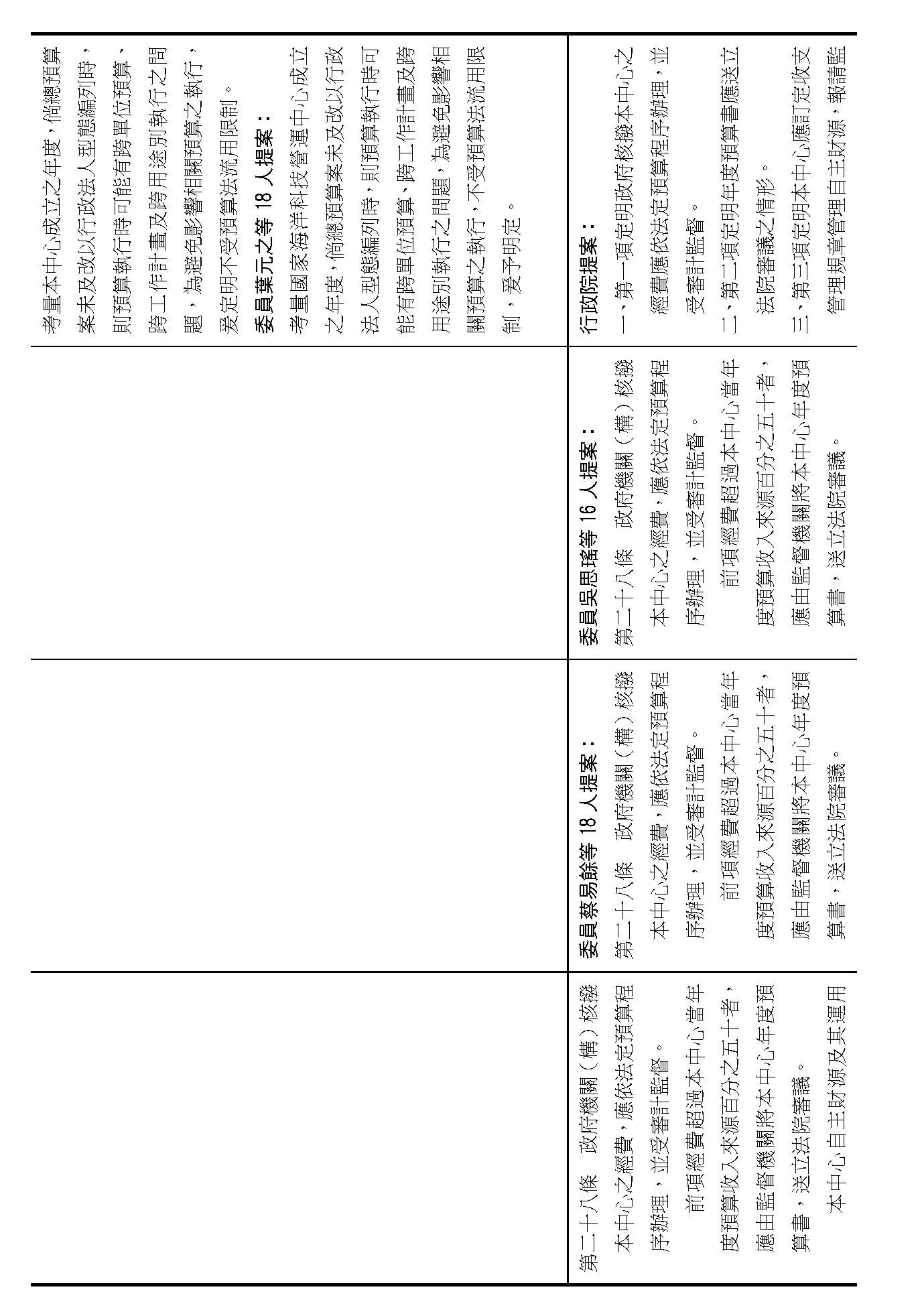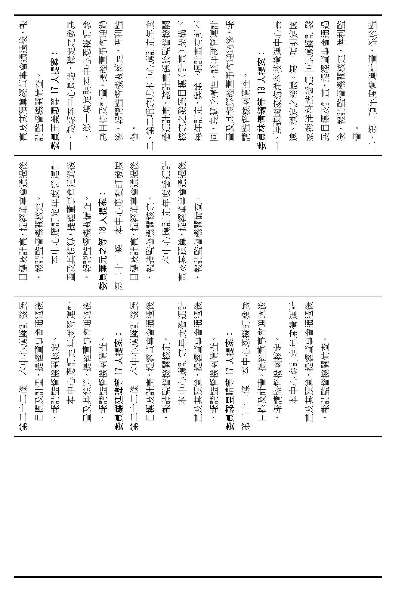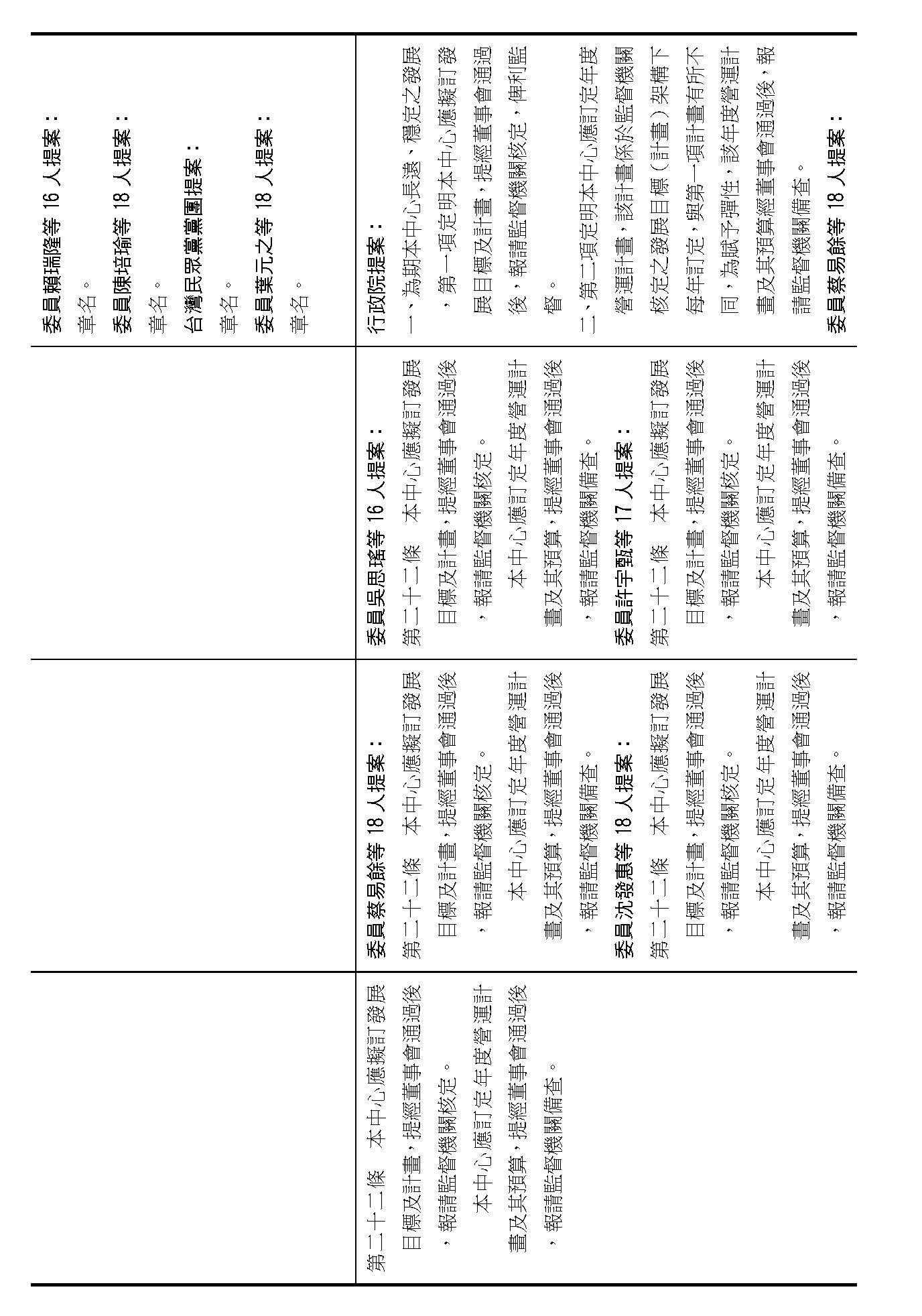 第二十二條就是中心應擬訂發展目標及計畫、訂定年度營運計畫跟預算,請問在場委員有沒有其他不同意見?(無)如果沒有的話,我們就按照行政院的提案通過。