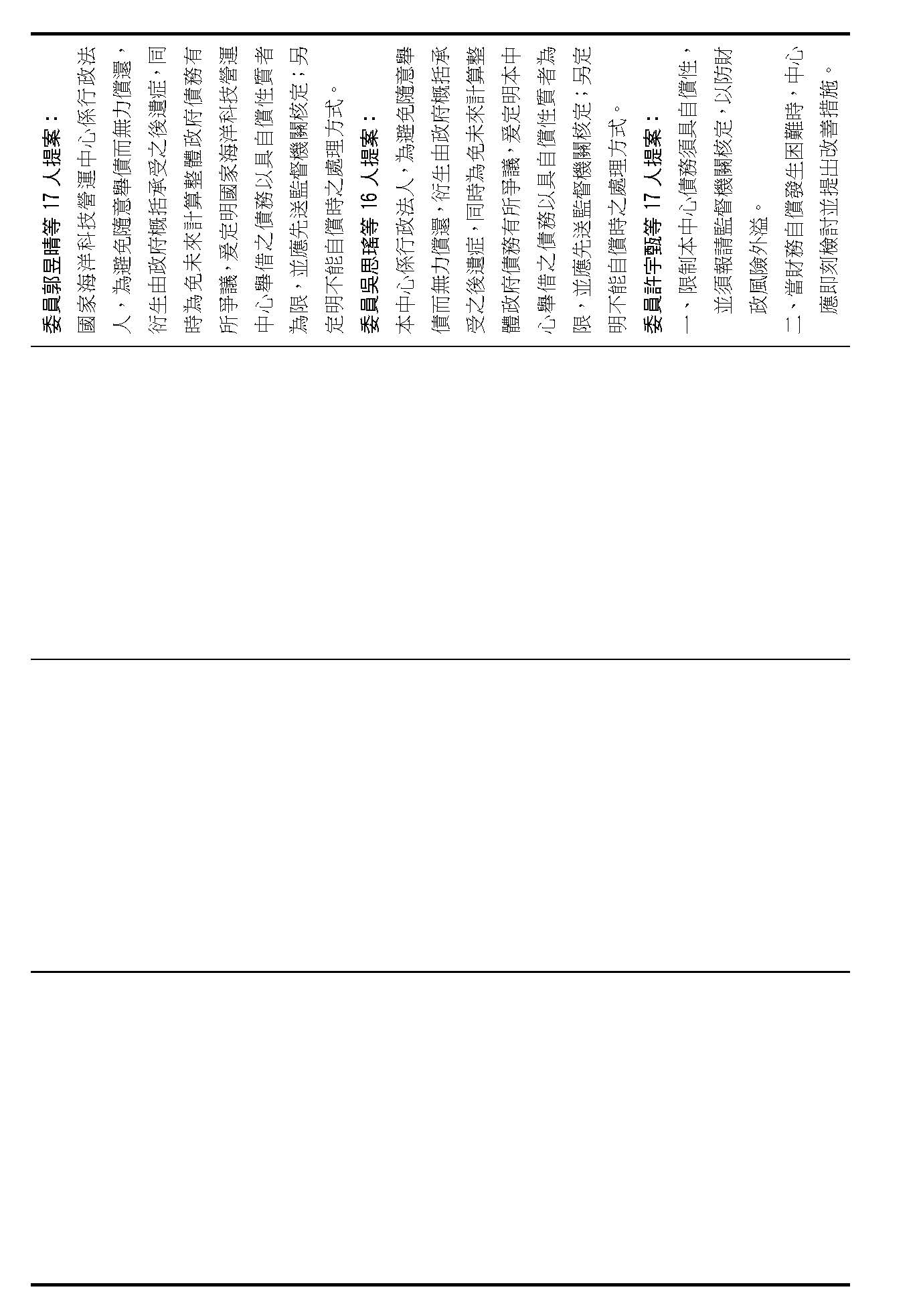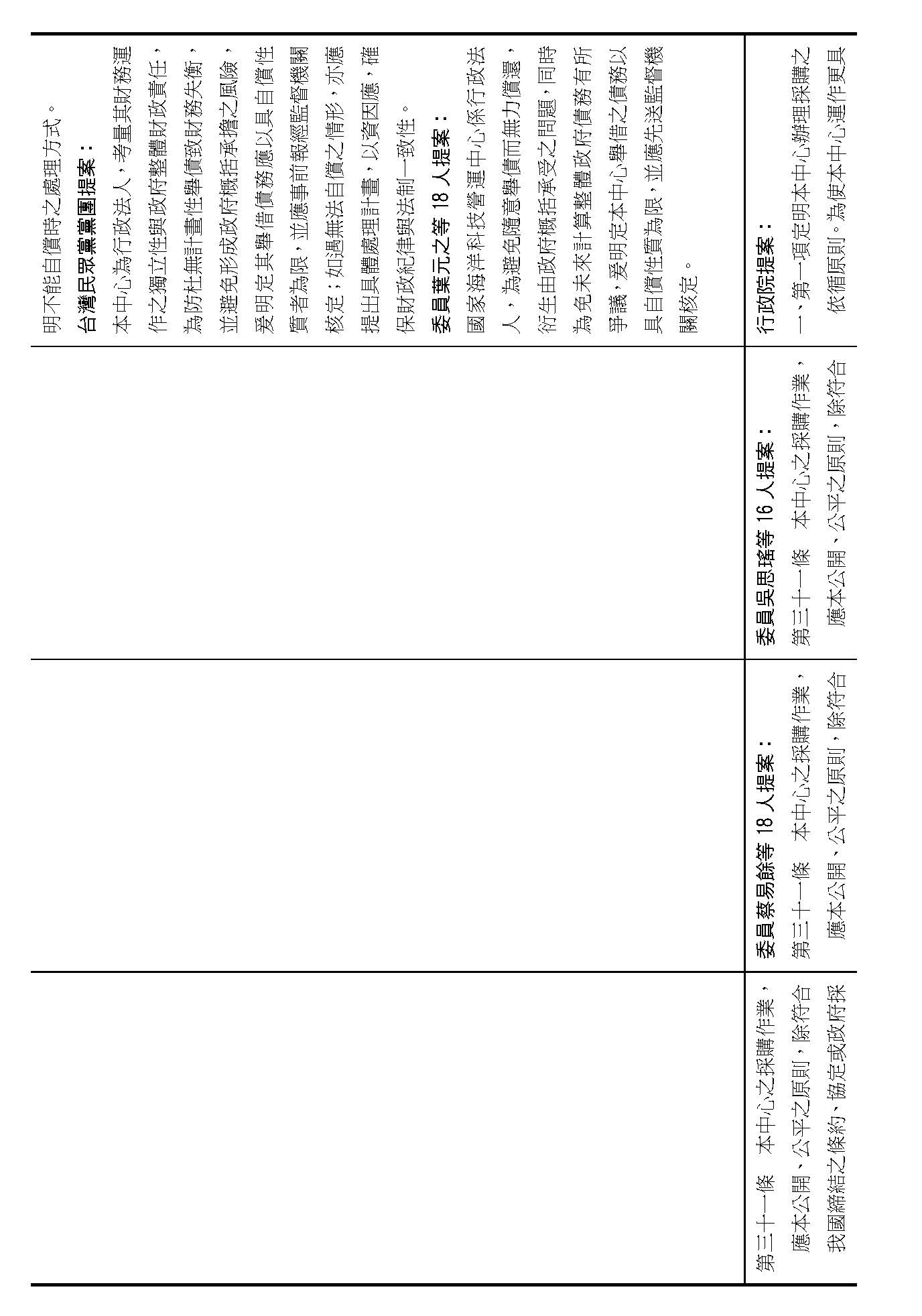 第三十條,本中心舉債的要件跟相關監督的程序,在場委員有沒有不同意見?(無)沒有的話,我們就按照行政院的提案通過。