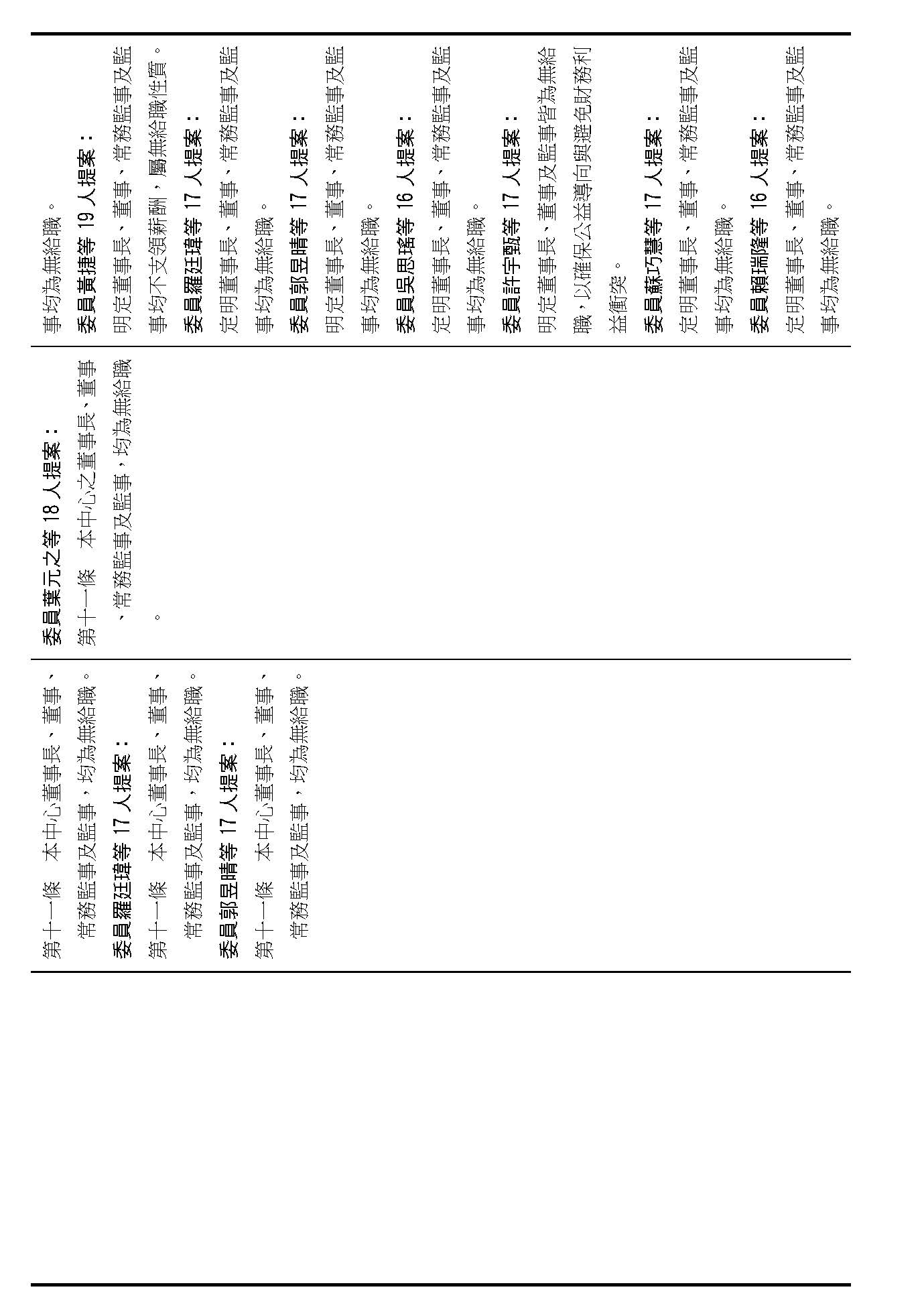 第十一條是董事長、董事、常務監事及監事都是無給職,這條是高度共識,如果在場委員沒有其他的意見的話,我們就按照行政院的提案通過。